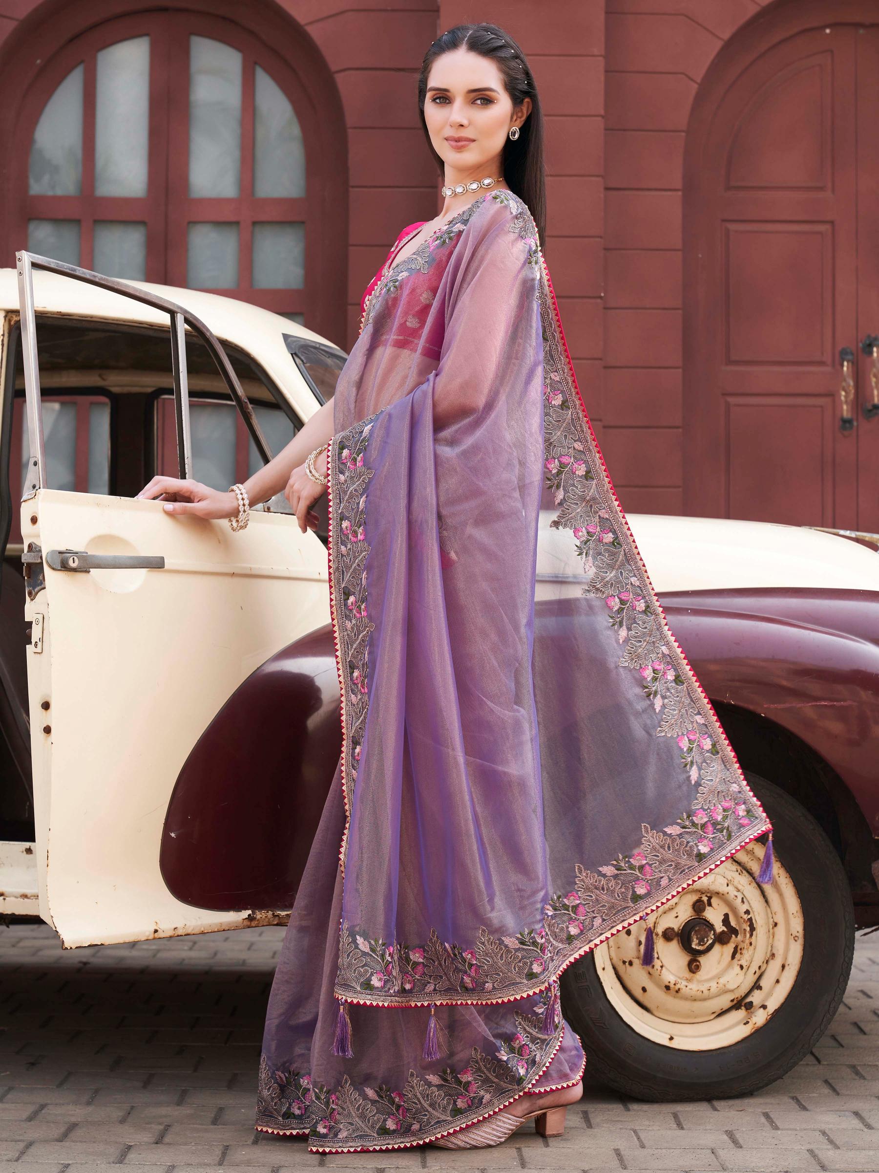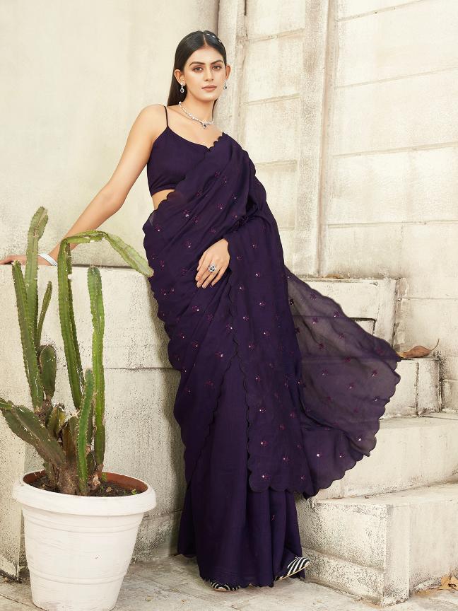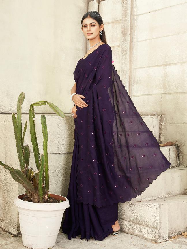 purple colored saree with mirror embroidery on pallu and scalloped border