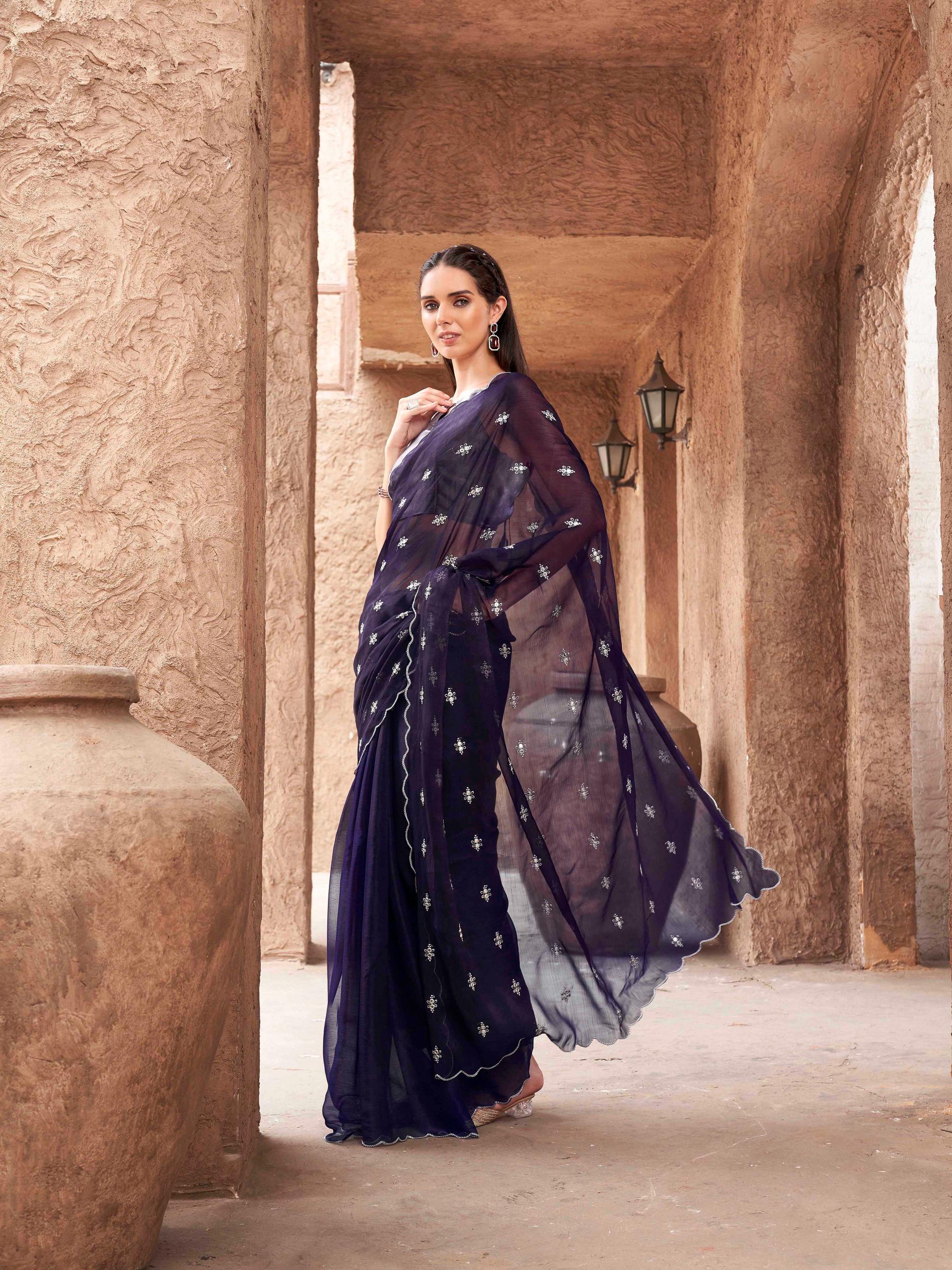 Purple colored saree with mirror embroidery on pallu and scalloped border