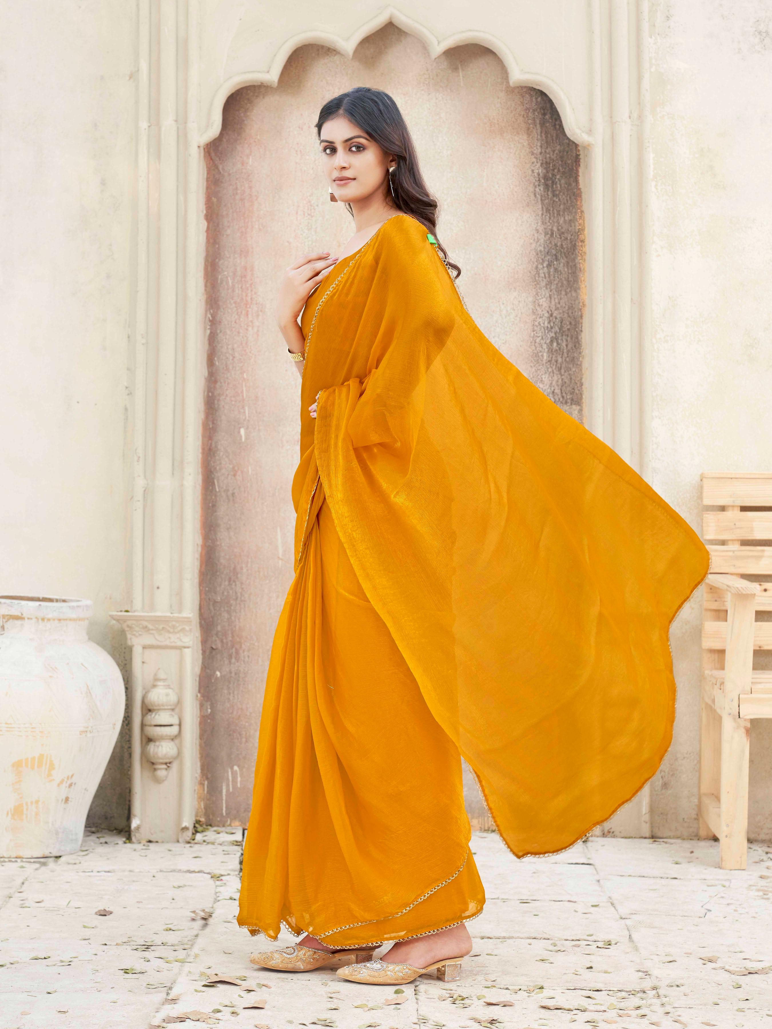 Ready to wear Yellow colored jimmy choo saree with embellished lace border