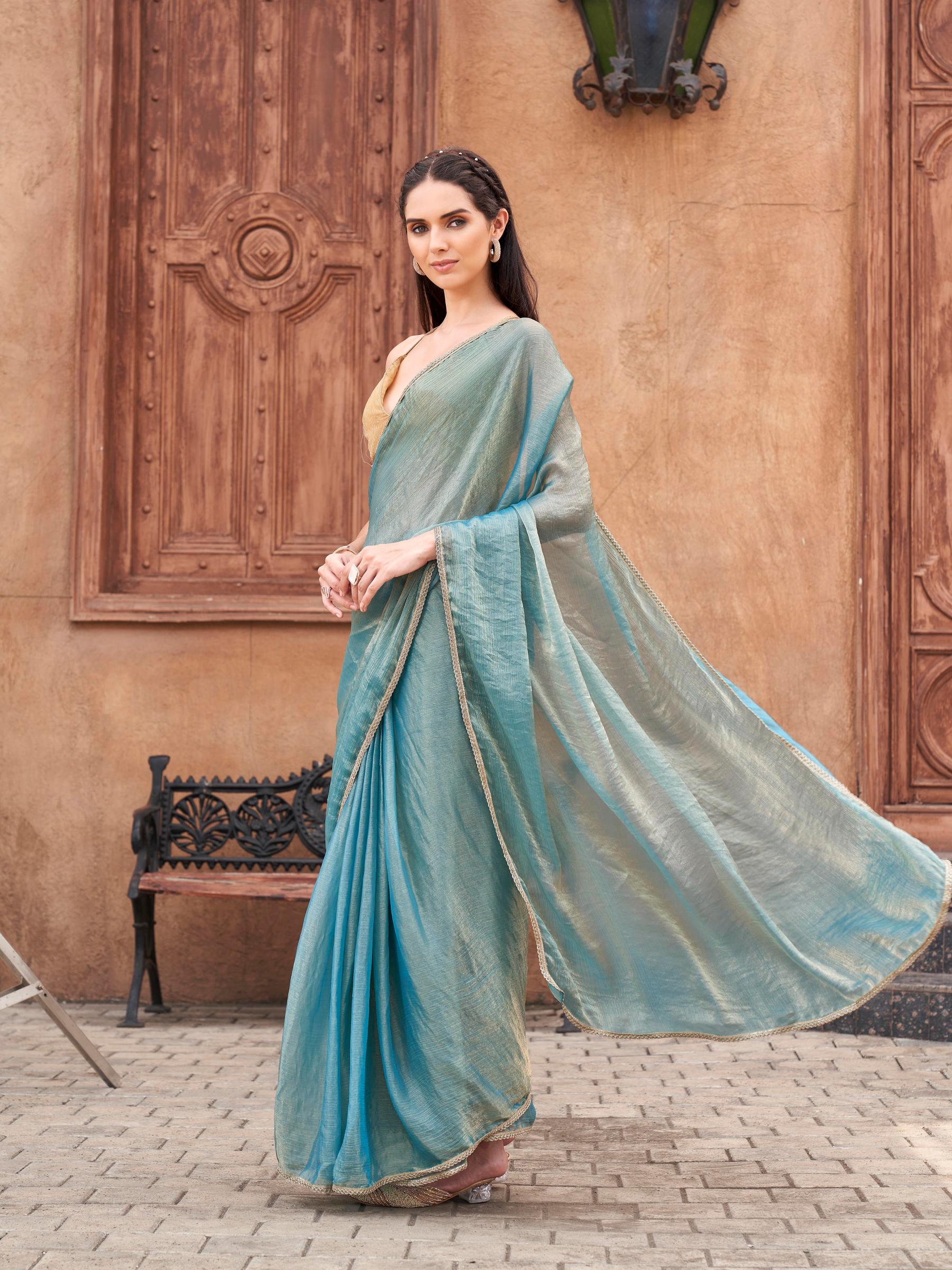 Ready to wear Two tone Blue and gold colored chiffon saree with embellished lace