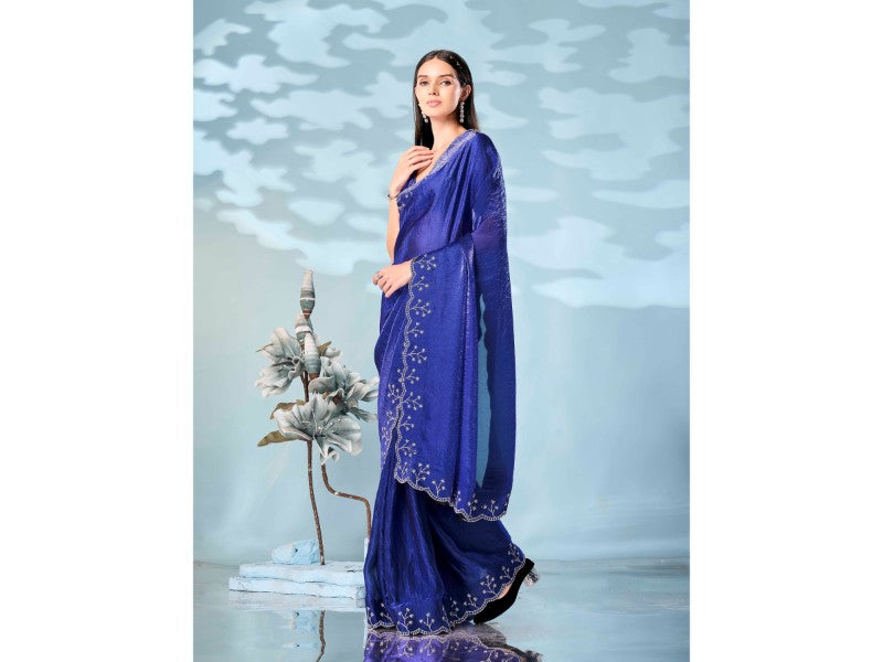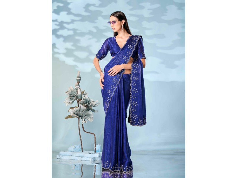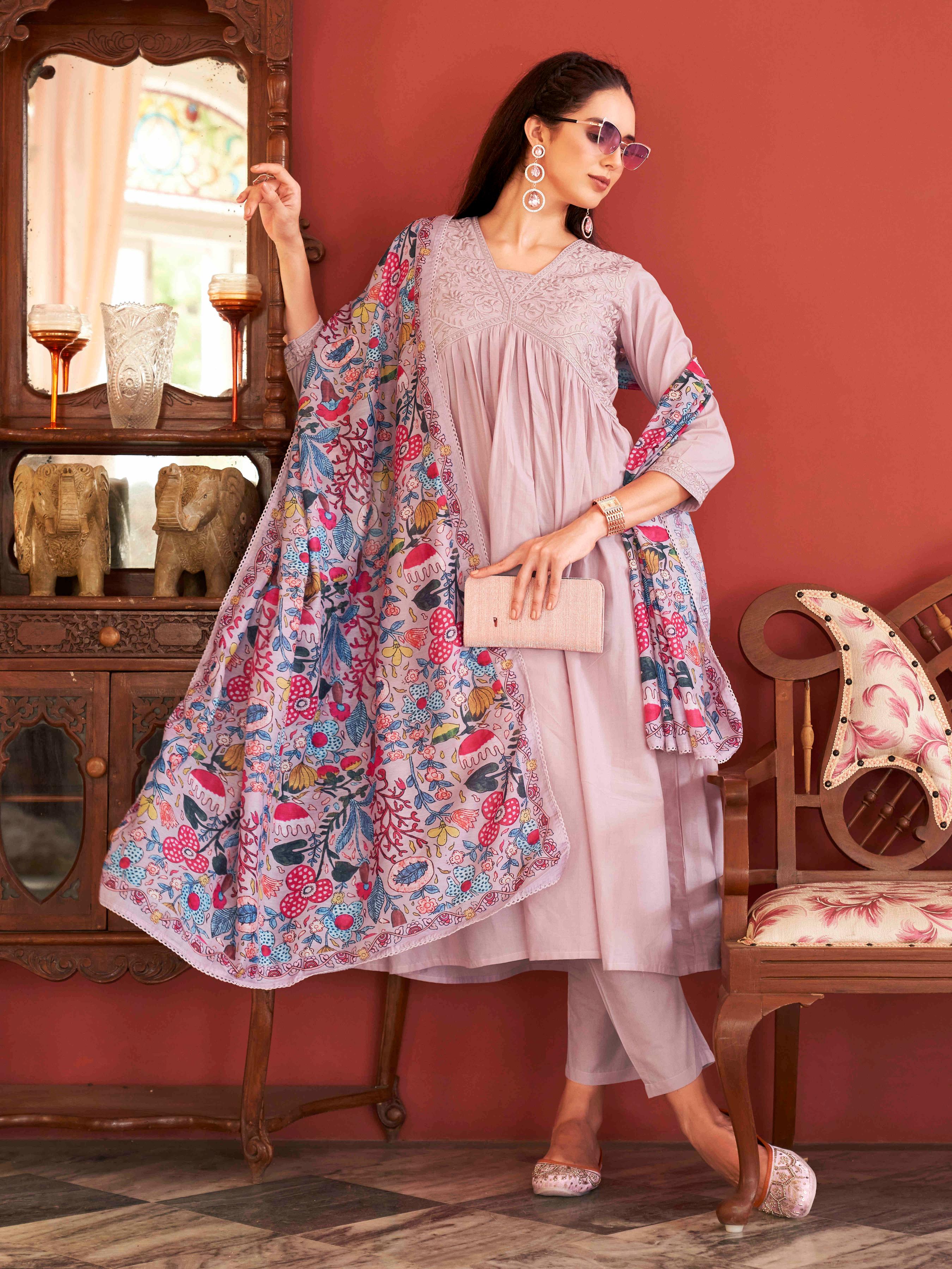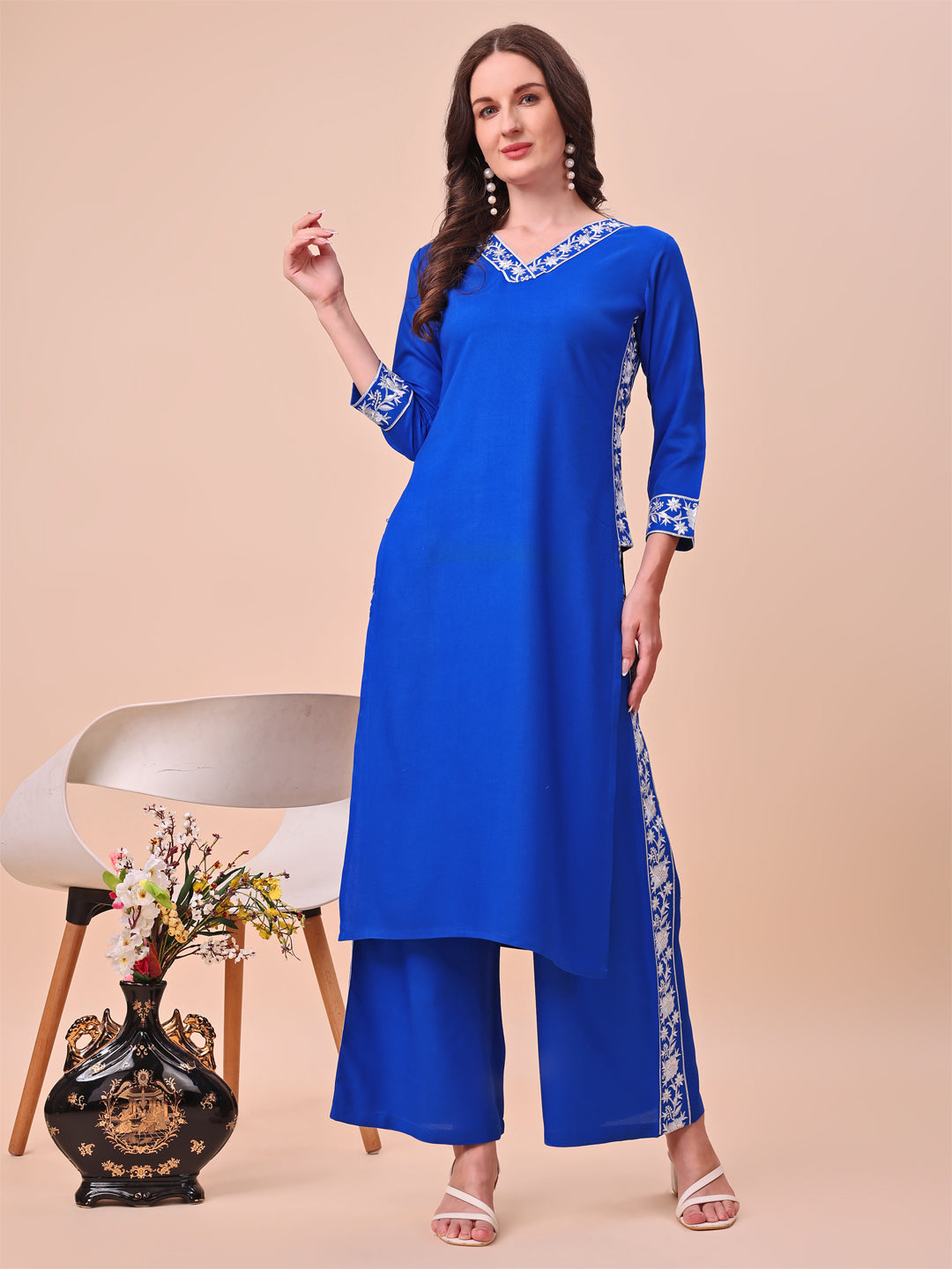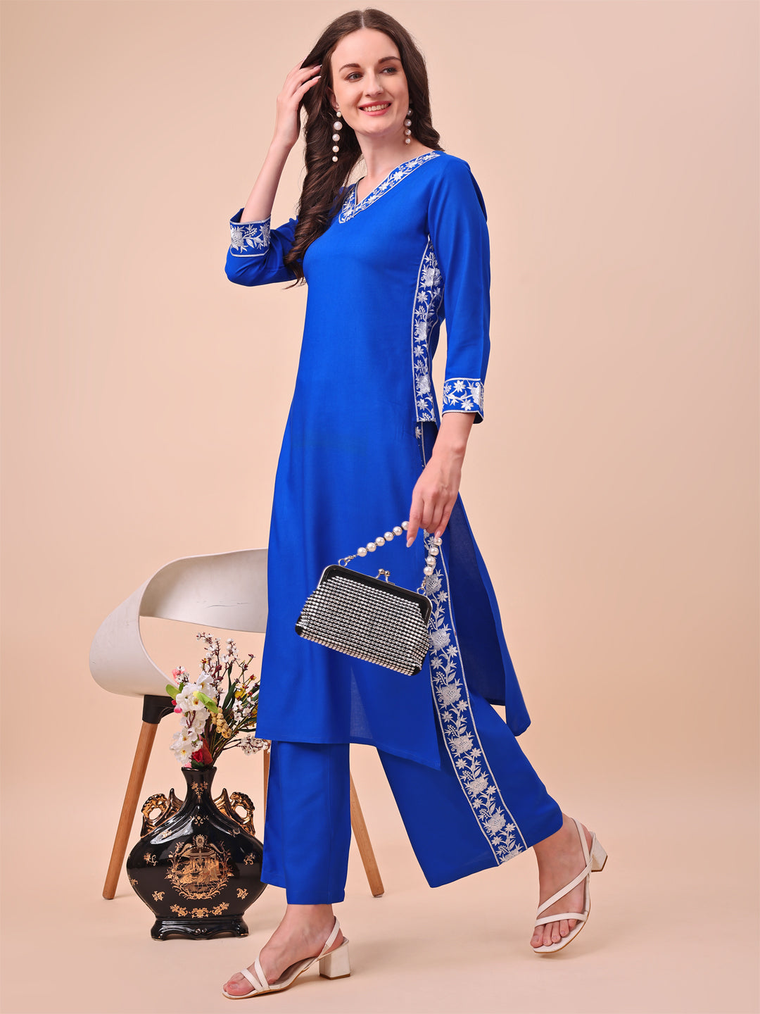 Royal Blue Rayon With White Thread Embroidered Neckline & Panelled Kurta Set