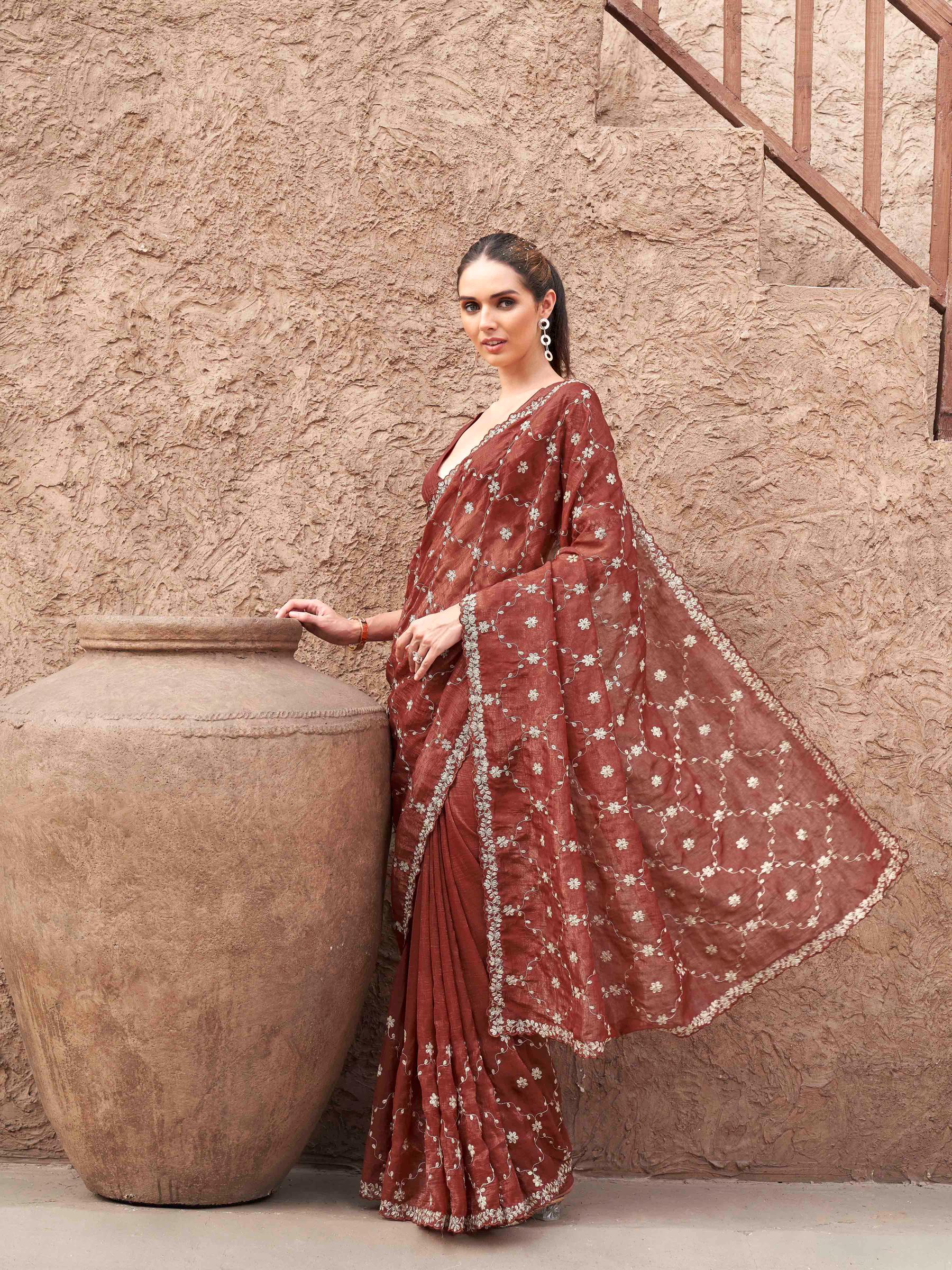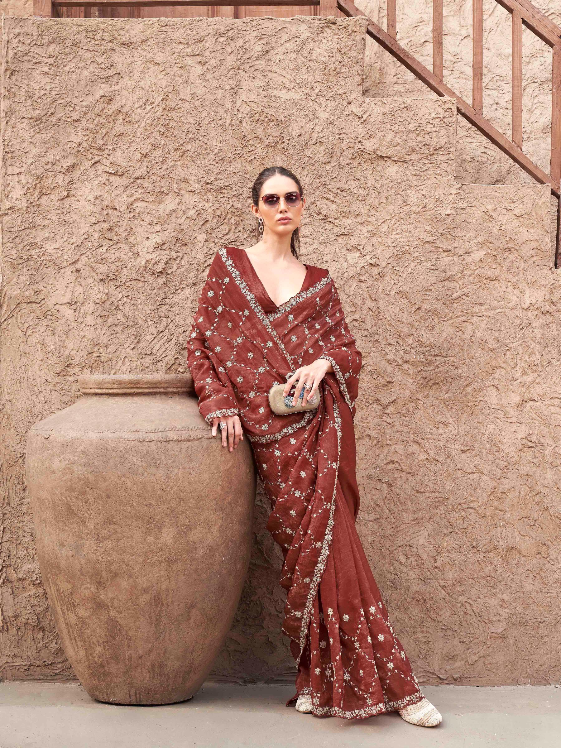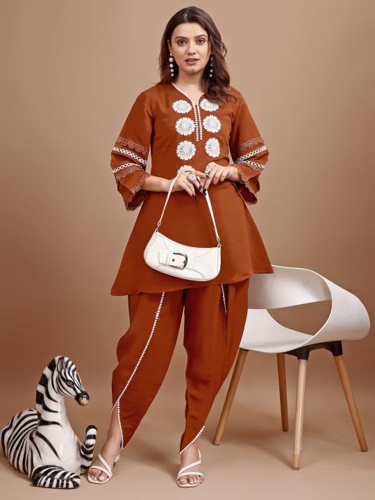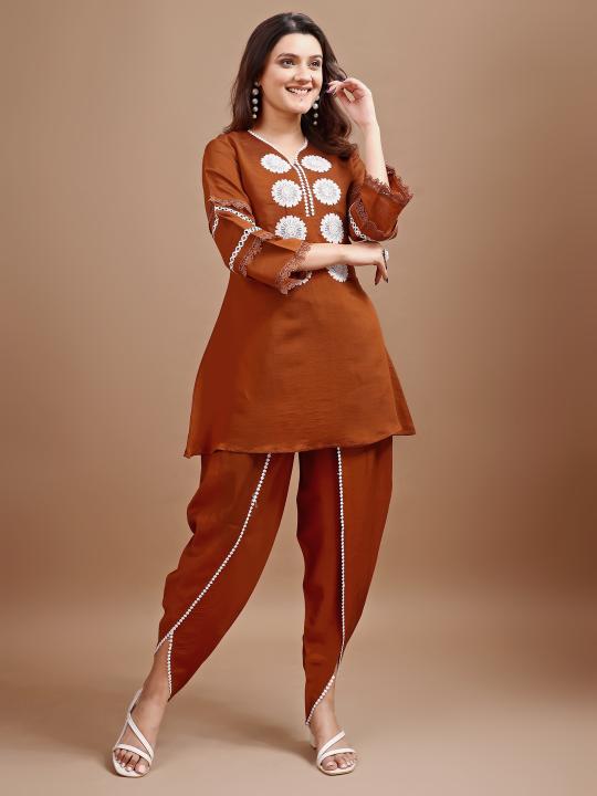 Rust color silk blend with white thread embroidered tunic and dhoti Co-ord set