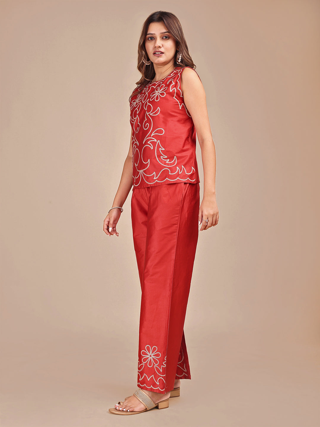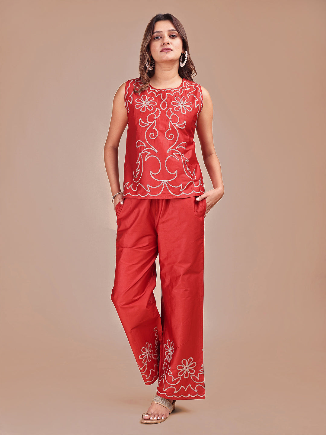 Rust Colored Jam Cotton With Cheeku Color Stylized Embroidery Co-ord Set