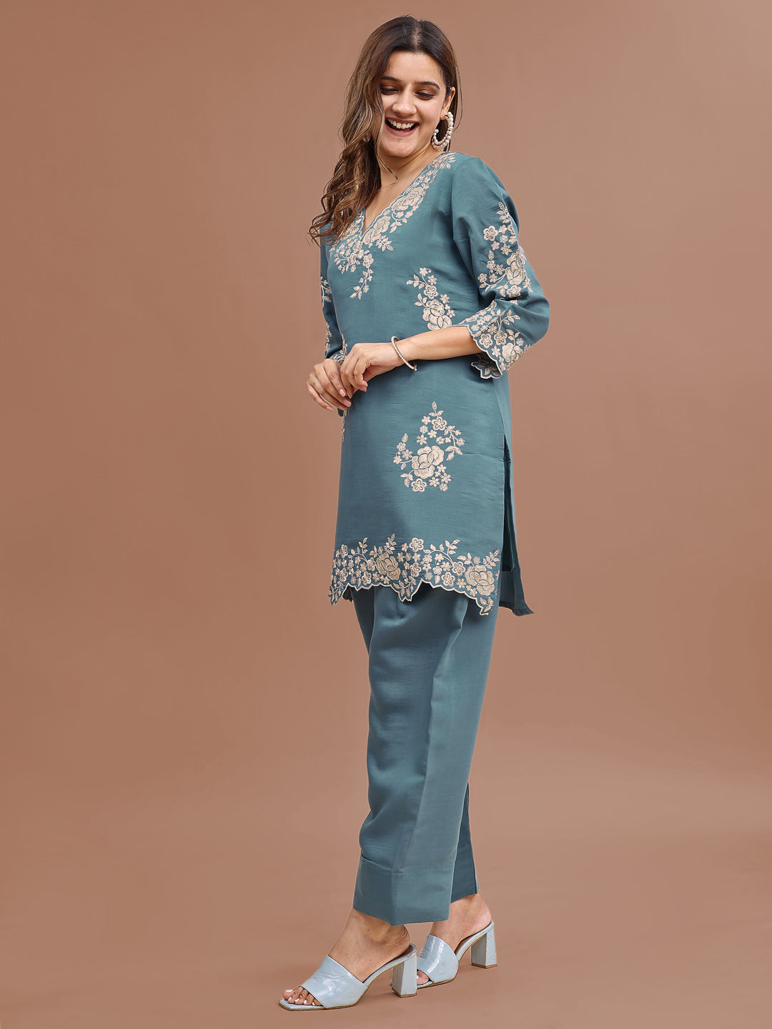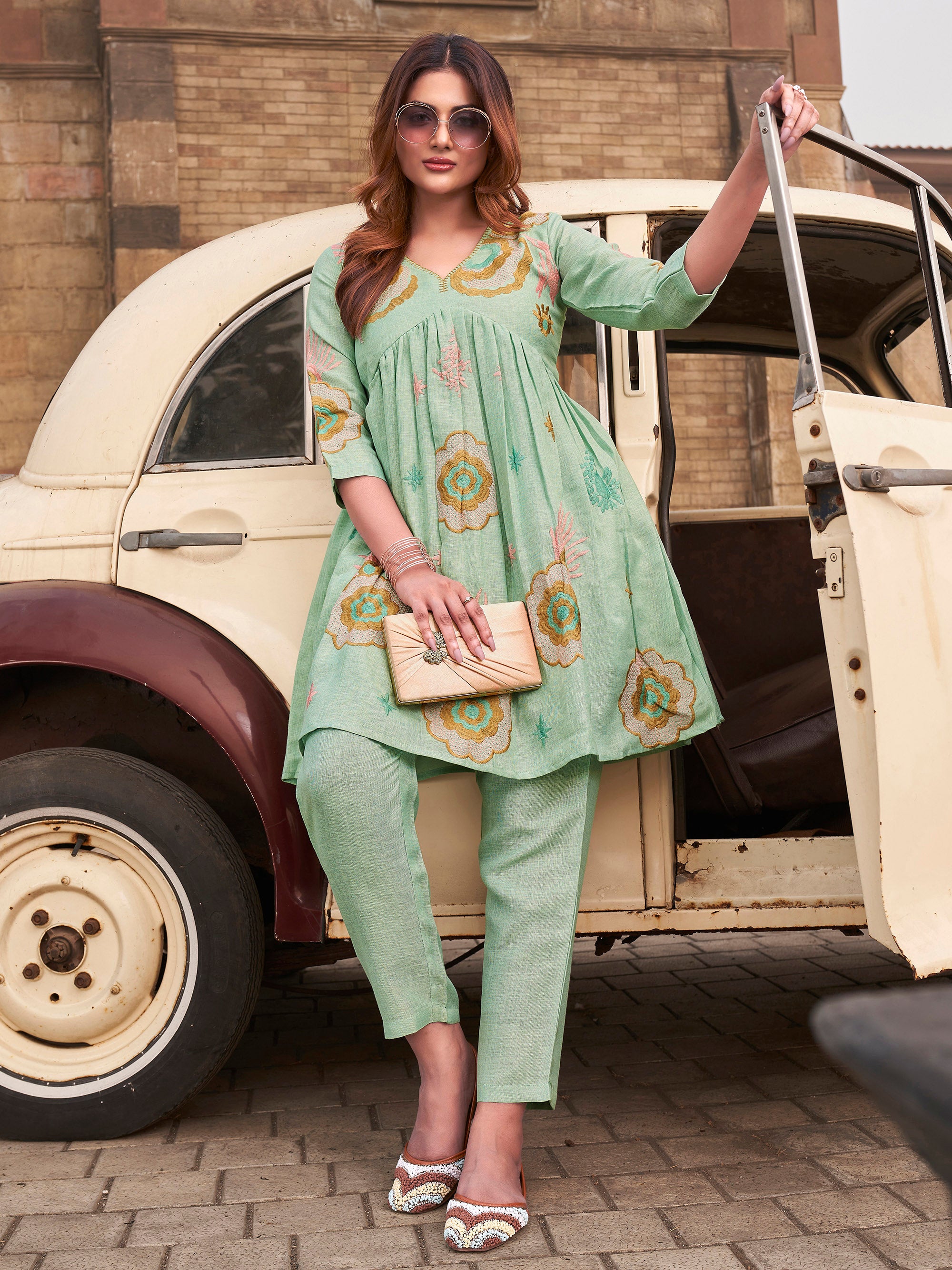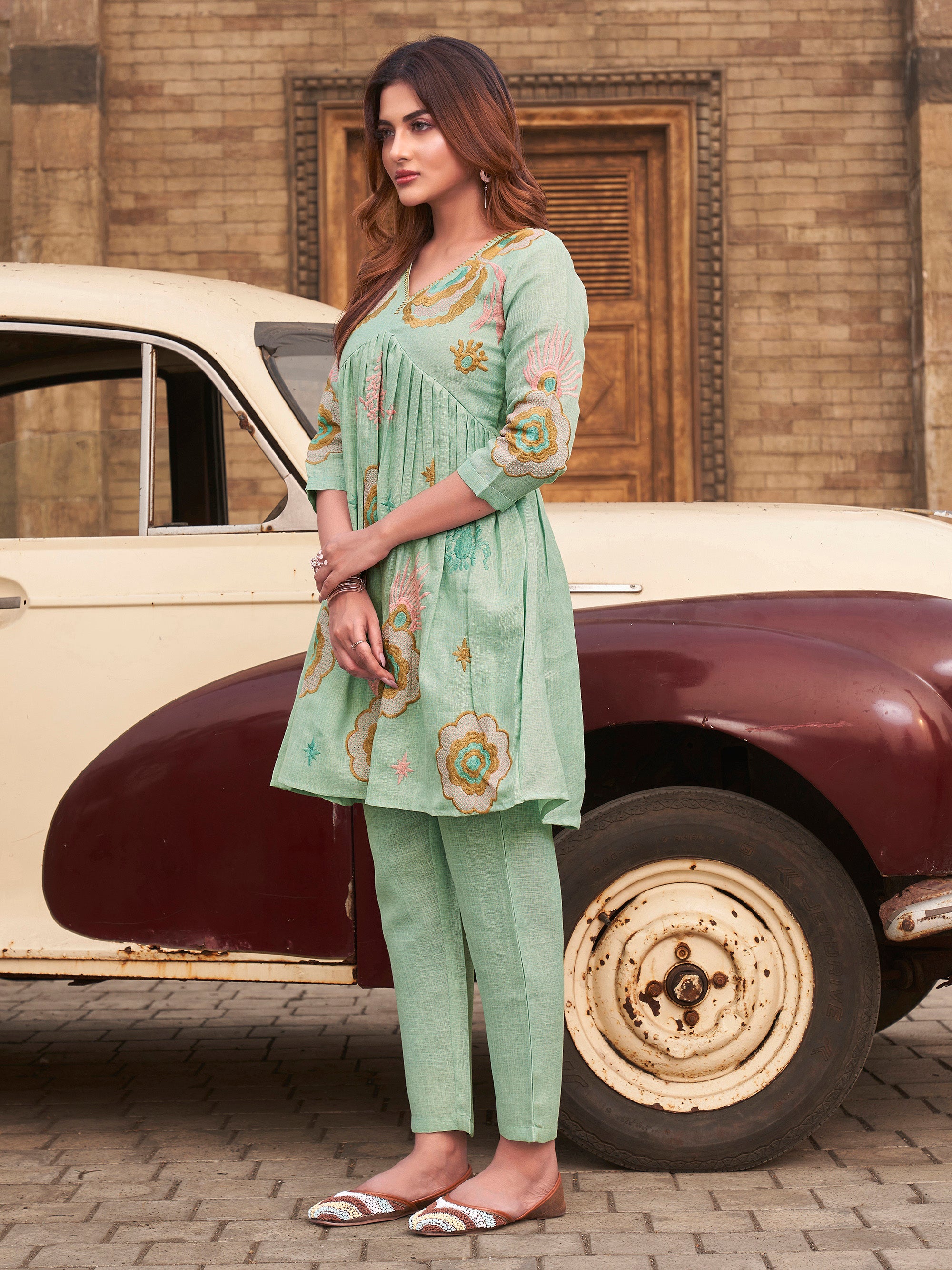 Sea Green color linen with contrast embroidered tunic & trouser co-ord set
