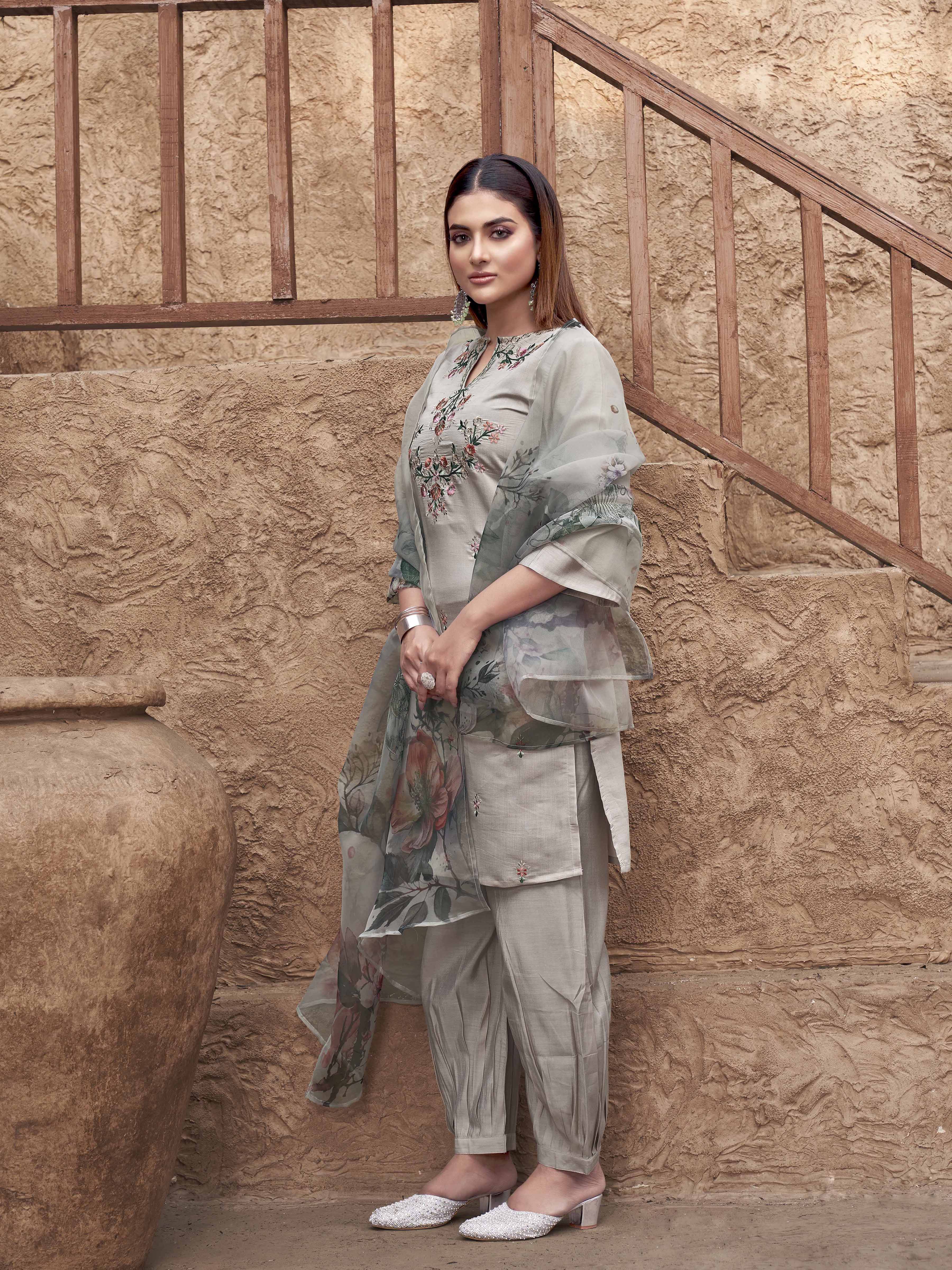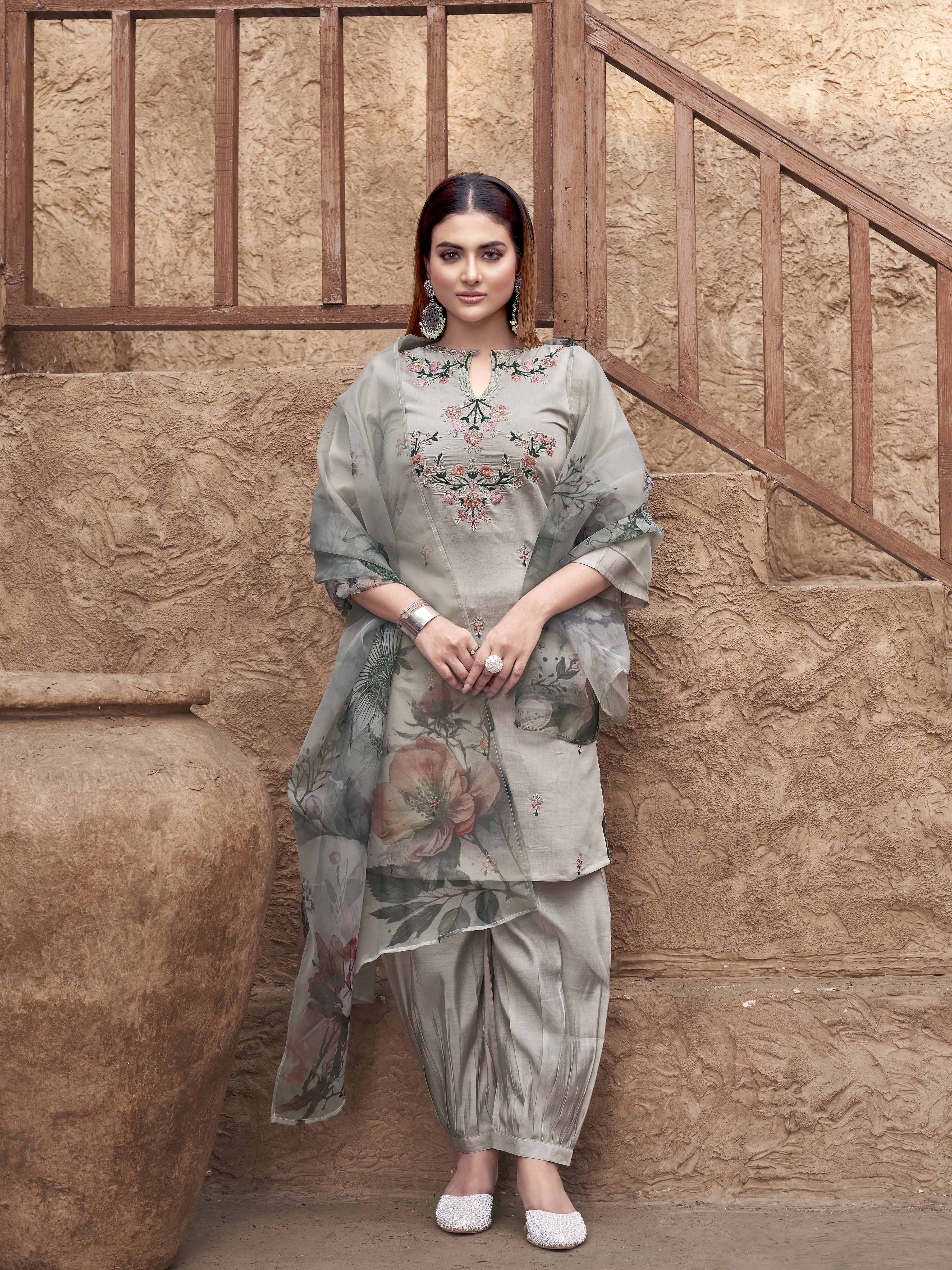 Silver Silk Blend Printed Dupatta & Multi Embroidered Kurta With Pleated Pant Set