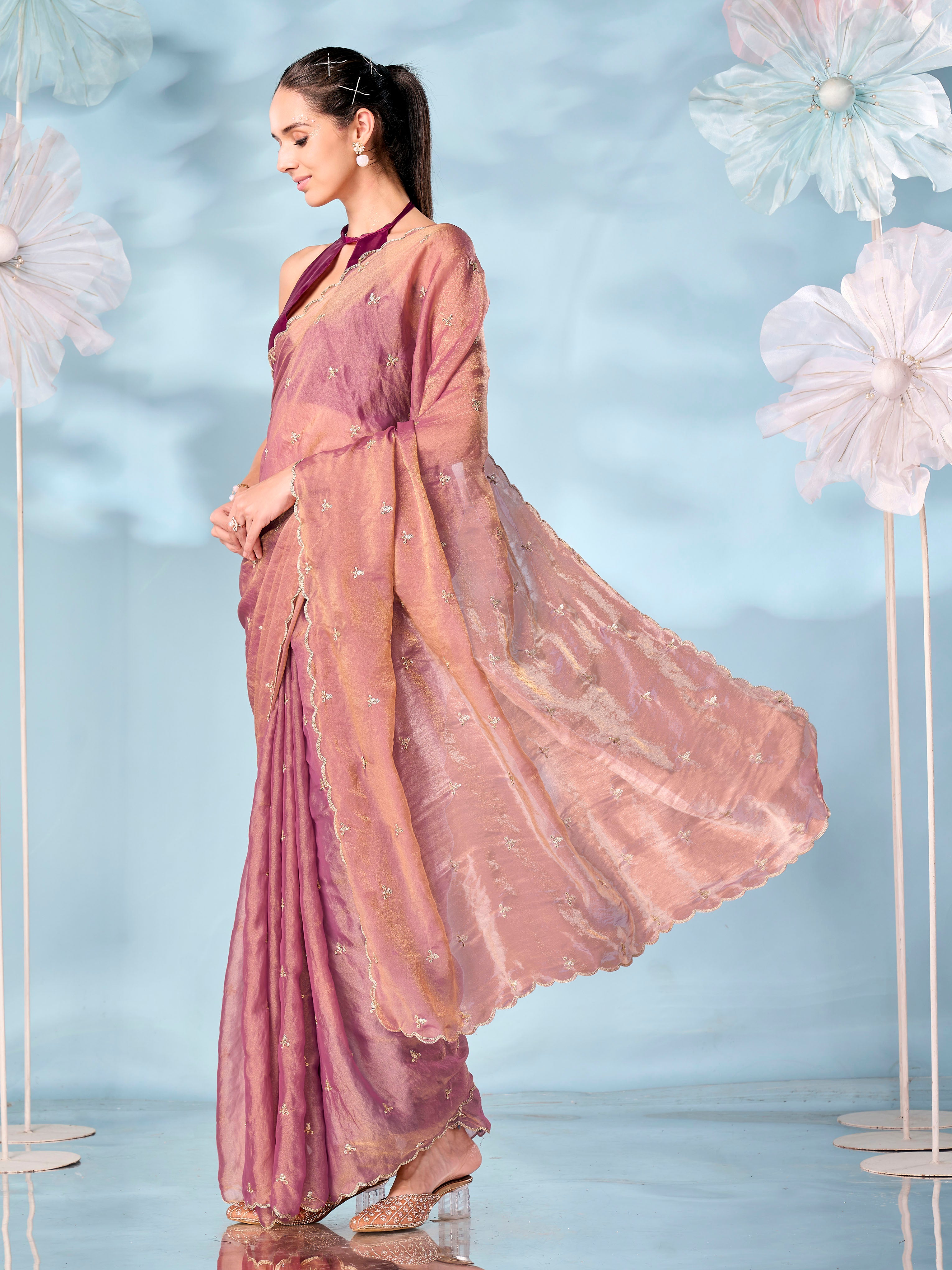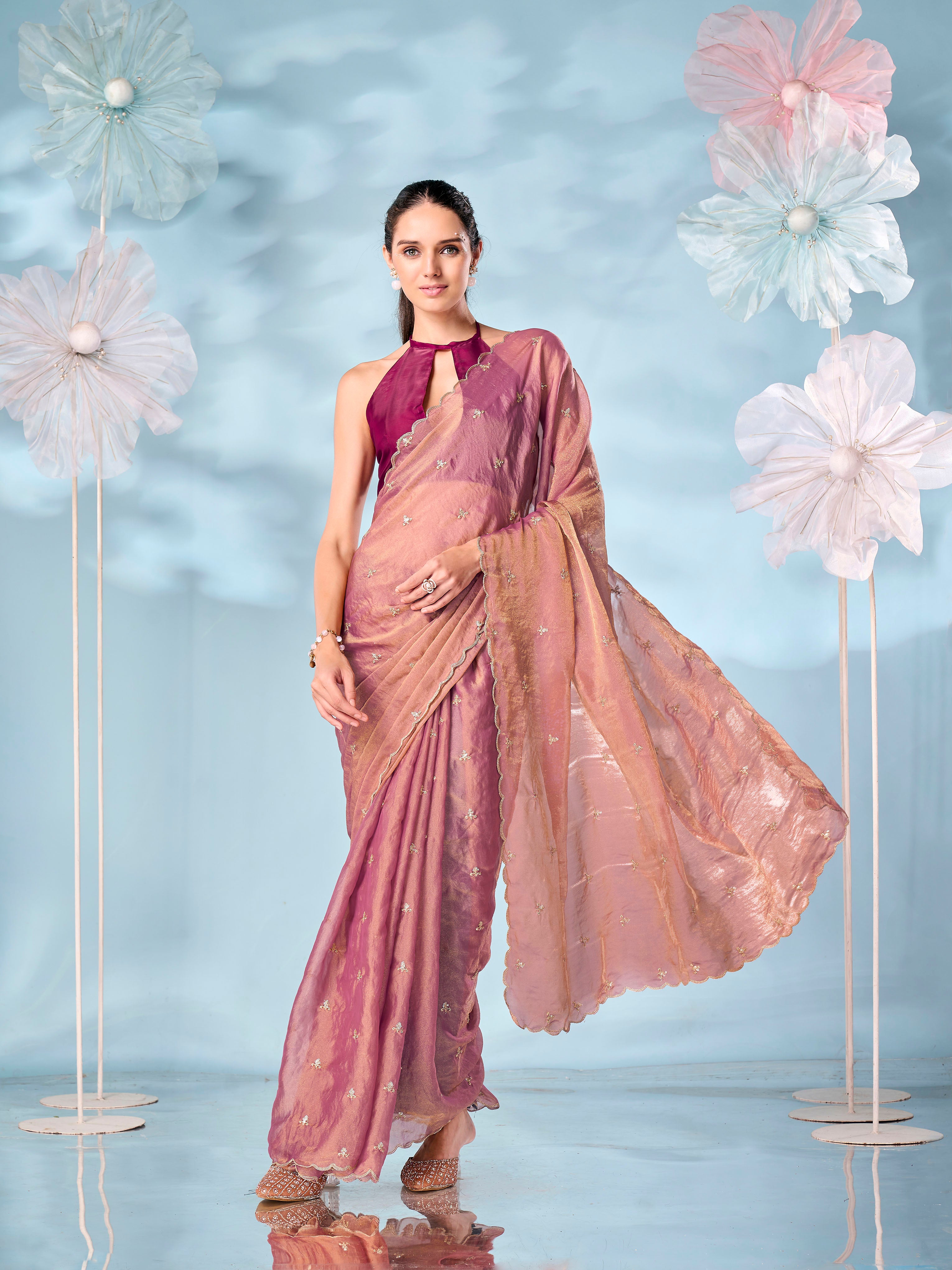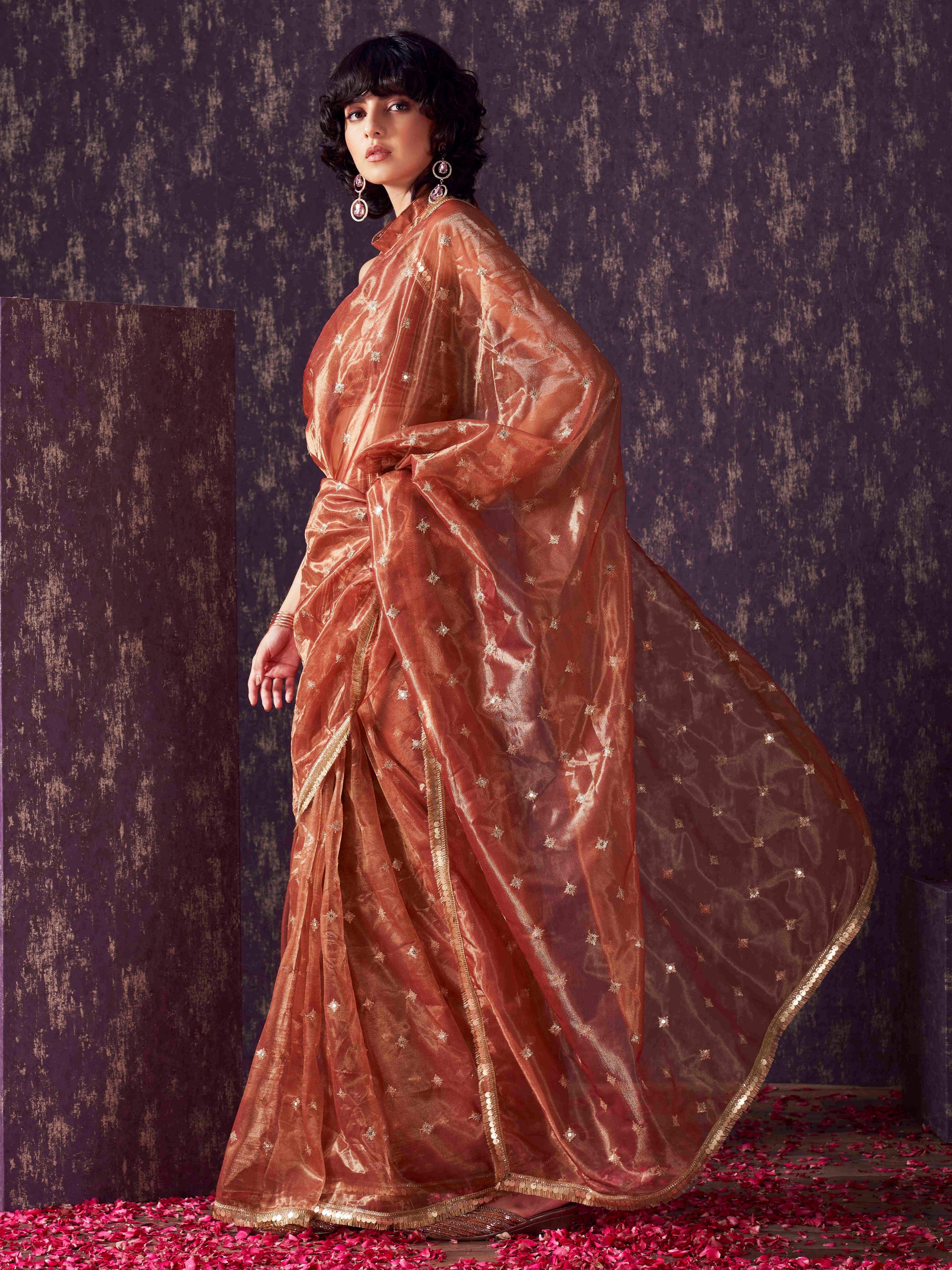 Rust colored shimmer net saree with sequence embroidery and sequinned tassle lace