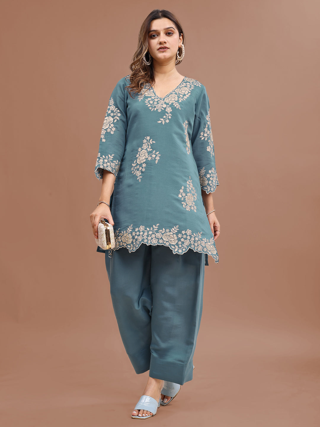 Sea Green Colored Silk Blend With Sequinns Work Tunic & Trouser Co-ord Set
