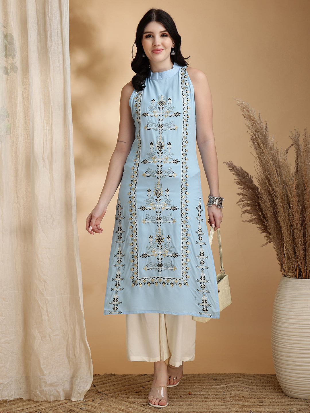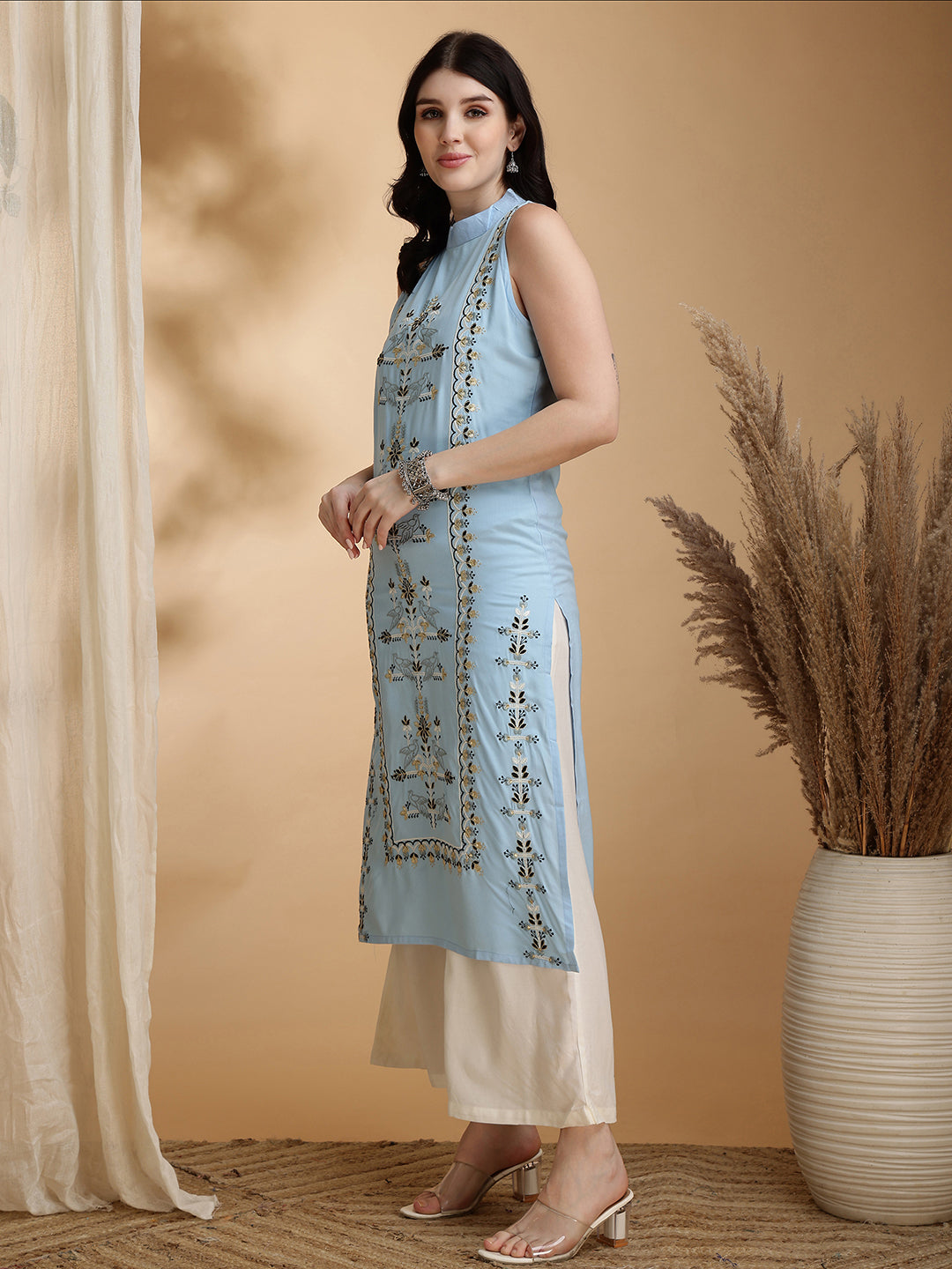Sky Blue Rayon With Full Embroidered Straight Cut Sleeveless Cor-ord Set