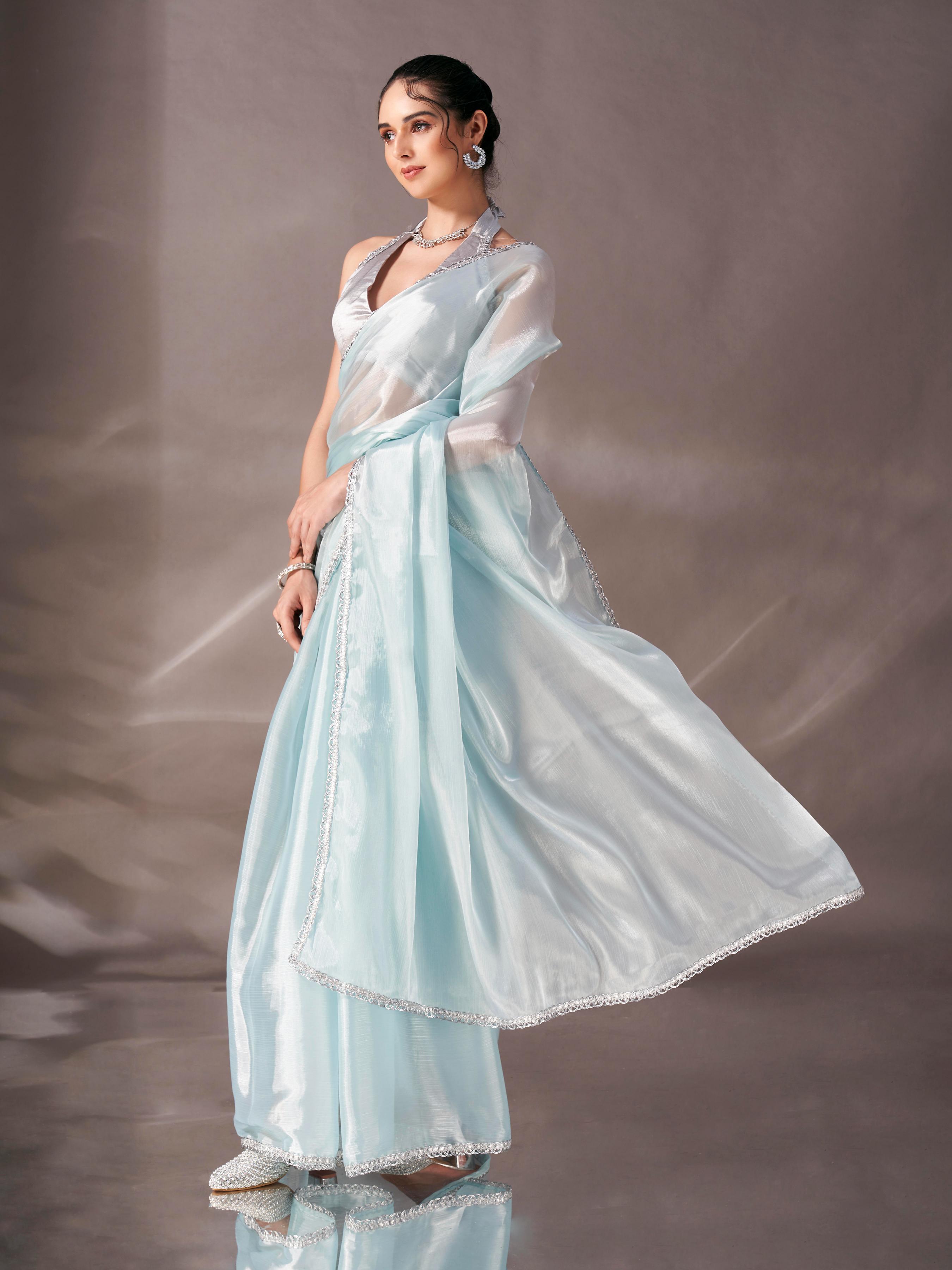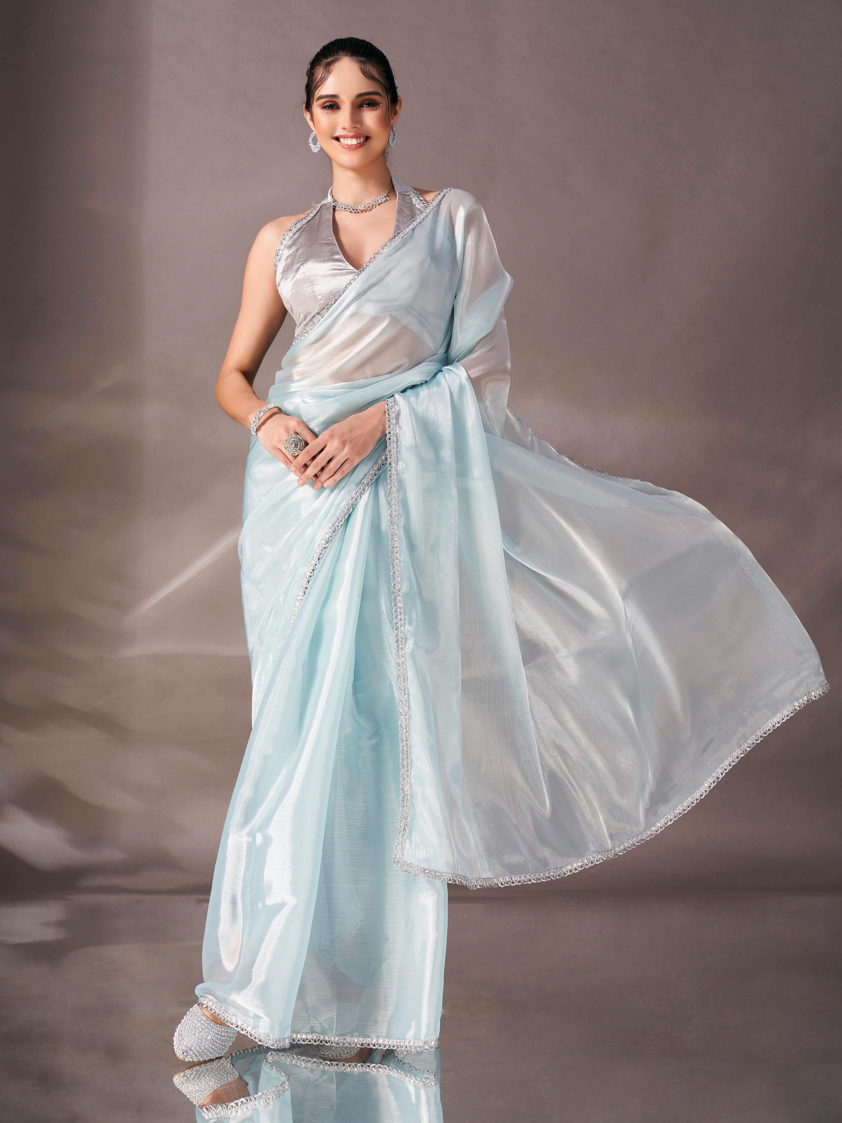 Sky blue colored shimmer satin saree with embellished lace