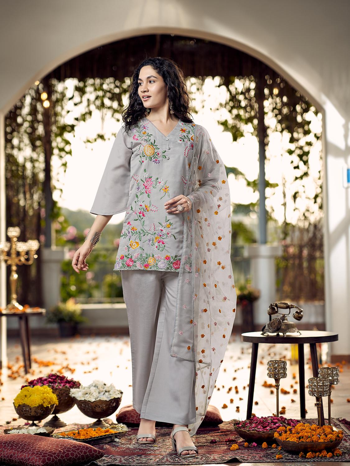 Steel Grey Color Silk Blend V-Neck Straight Kurta Set With Floral Thread Embroidery
