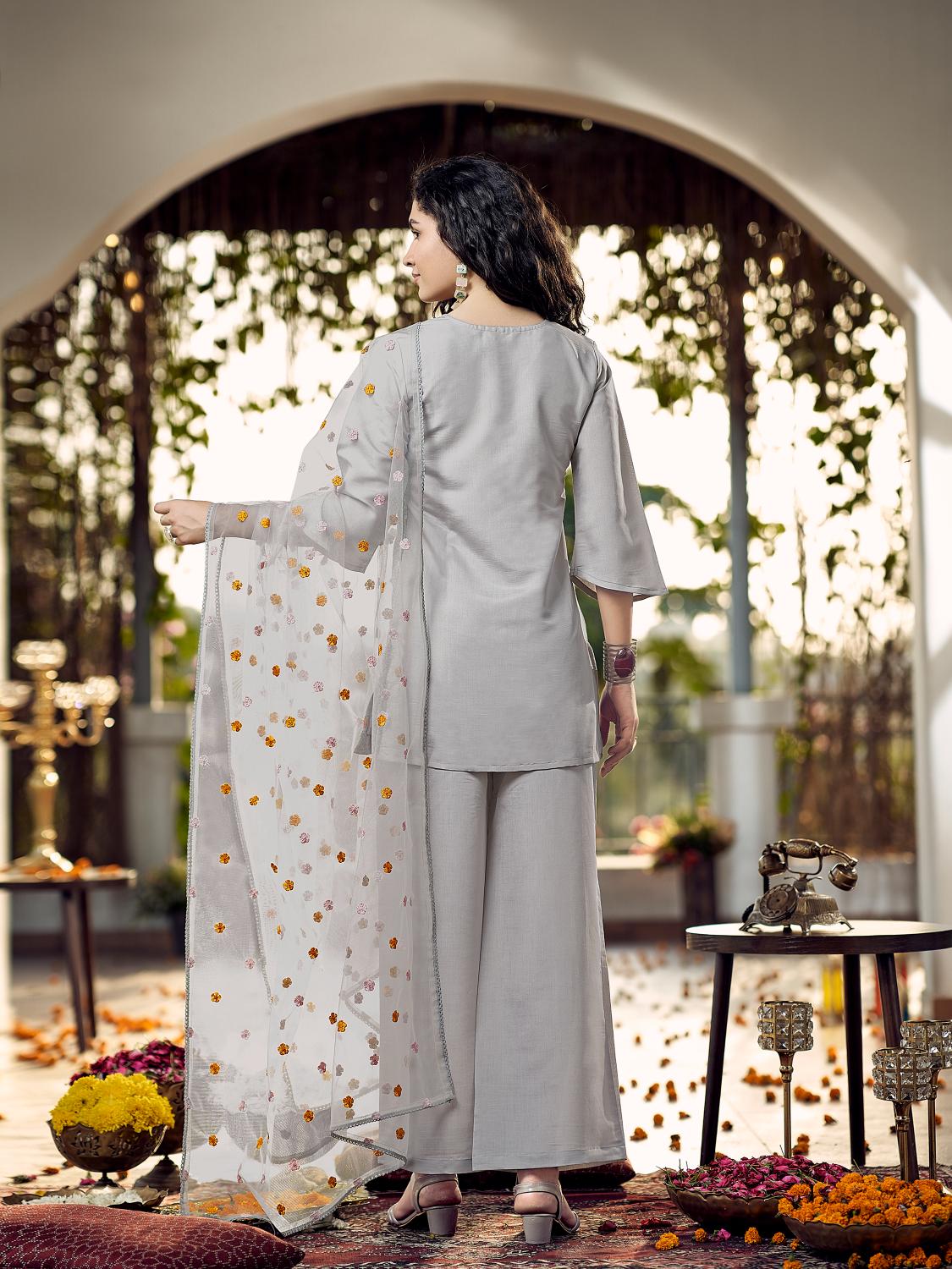 Still Grey color organza sequinns and thread embroidered Co-ords Set