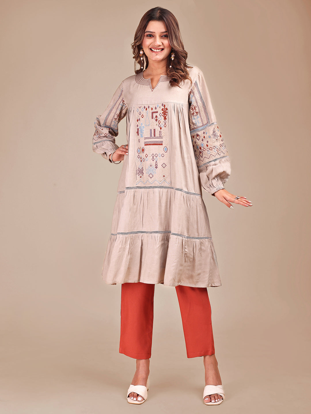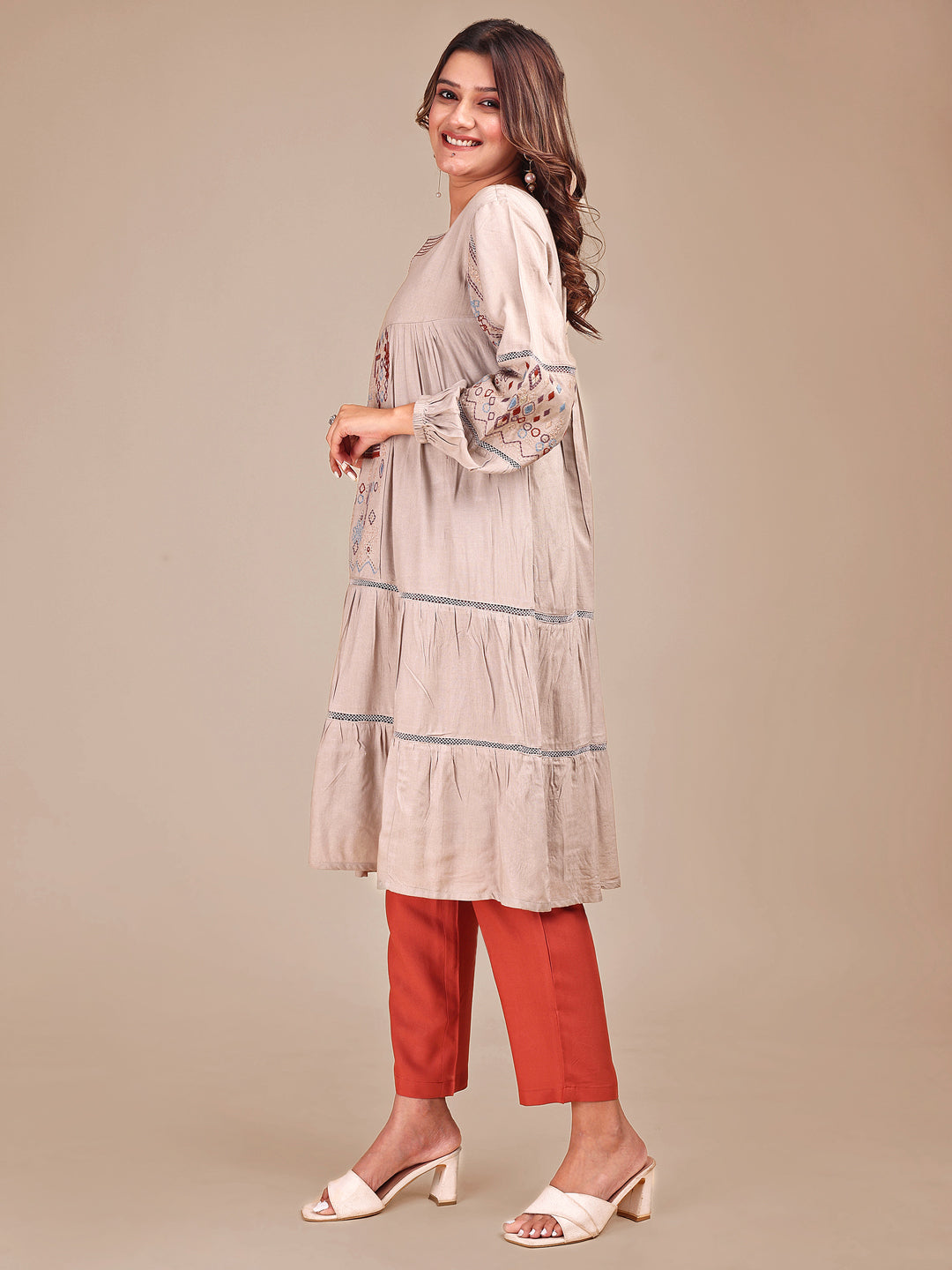 Taupe Colored Contrast Embroidered Rayon Empire Co-ord Set