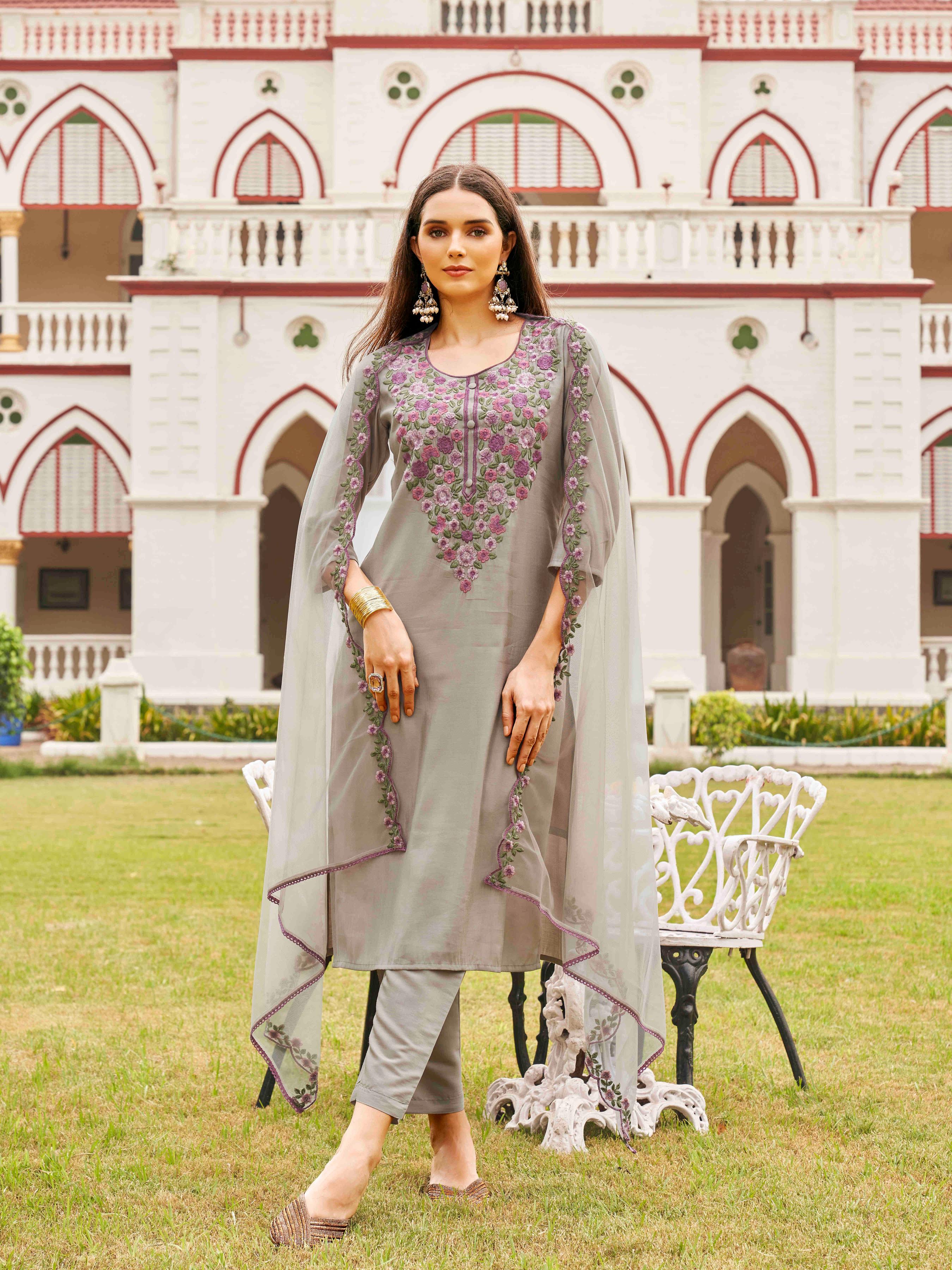 Taupe Colored Silk Blend Multi Thread Embroidered Straight Cut Kurta Set