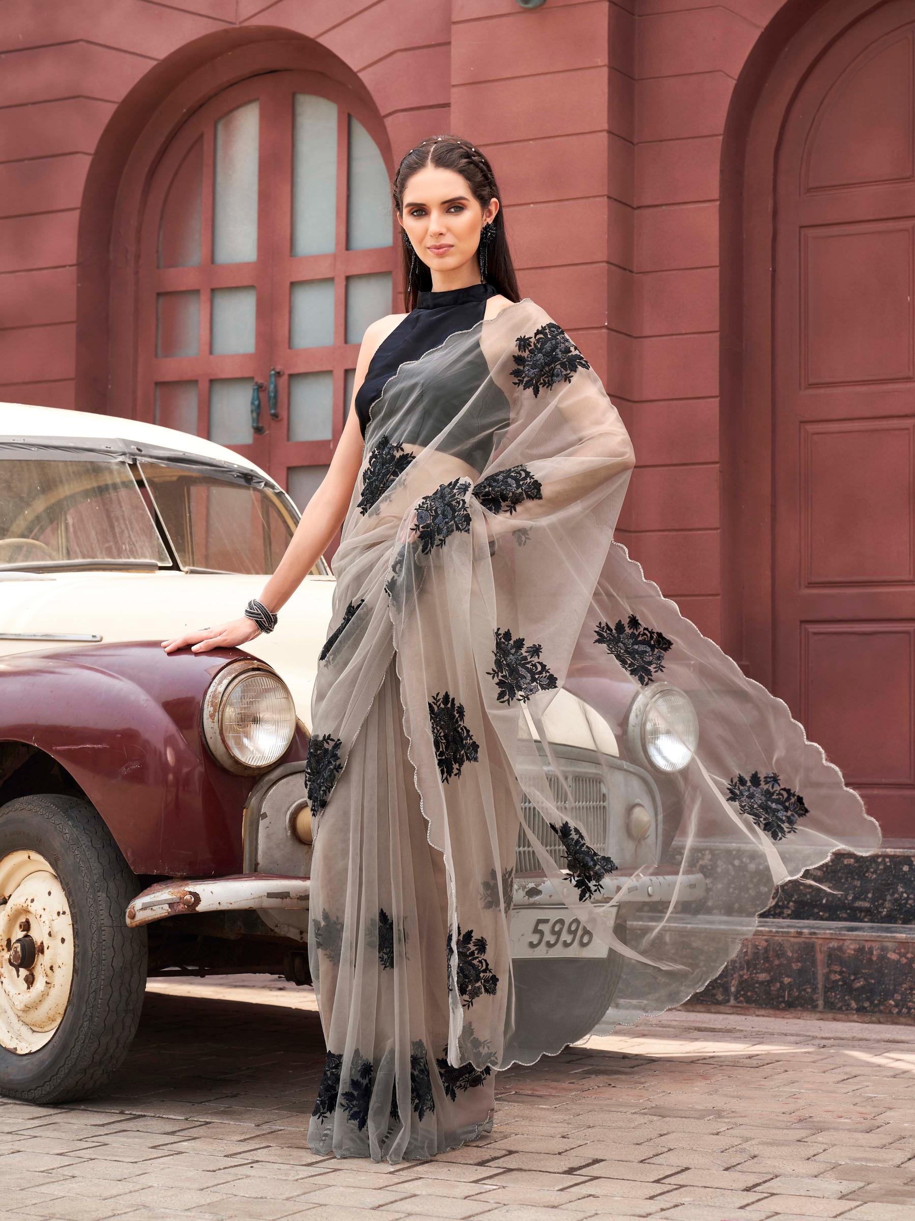 Tan colored embroidered net saree with scalloped border