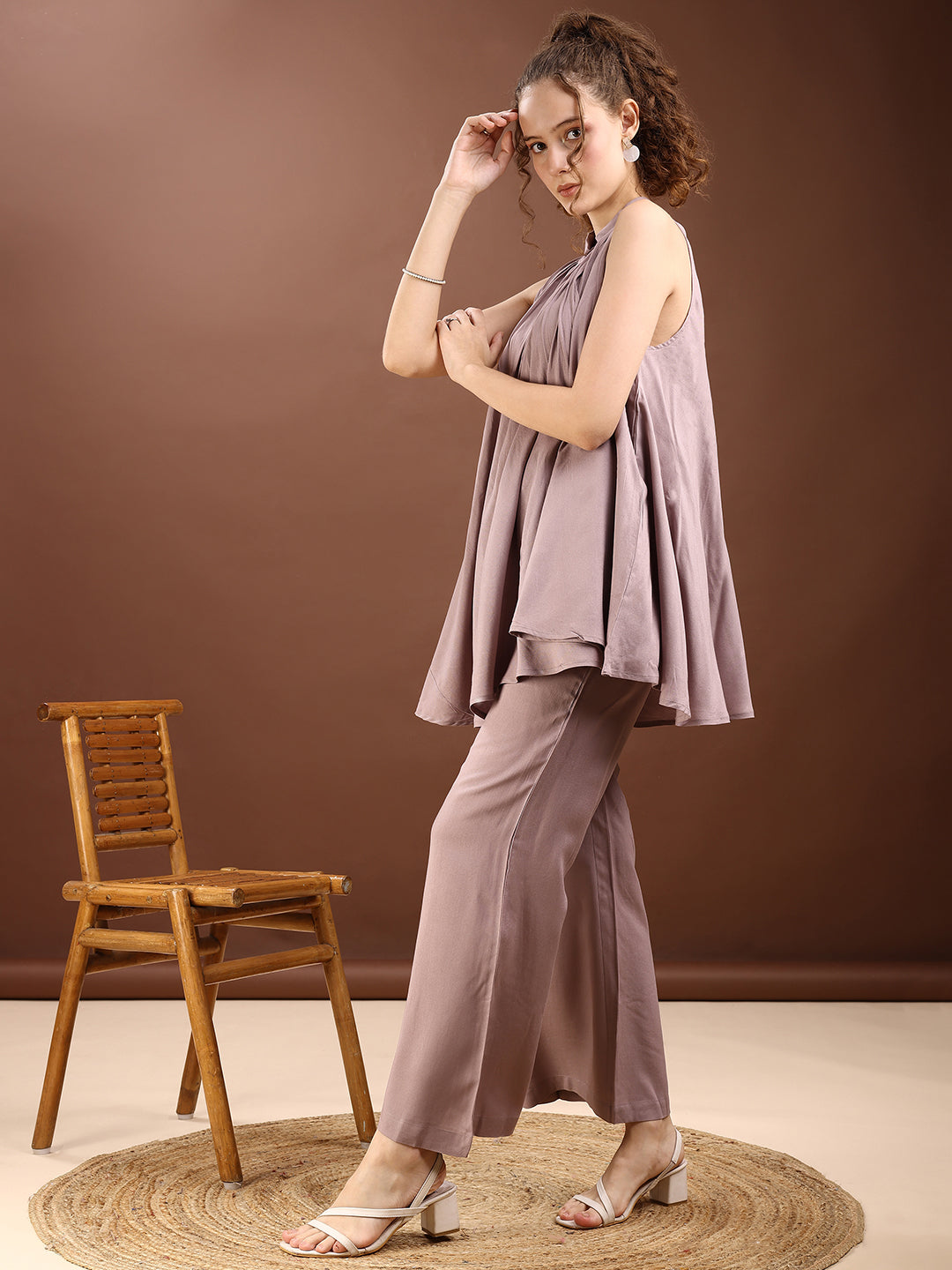 Taupe Colored Halter Neck Rayon Sleeveless Top With Flared Palazzo Co-ords Set