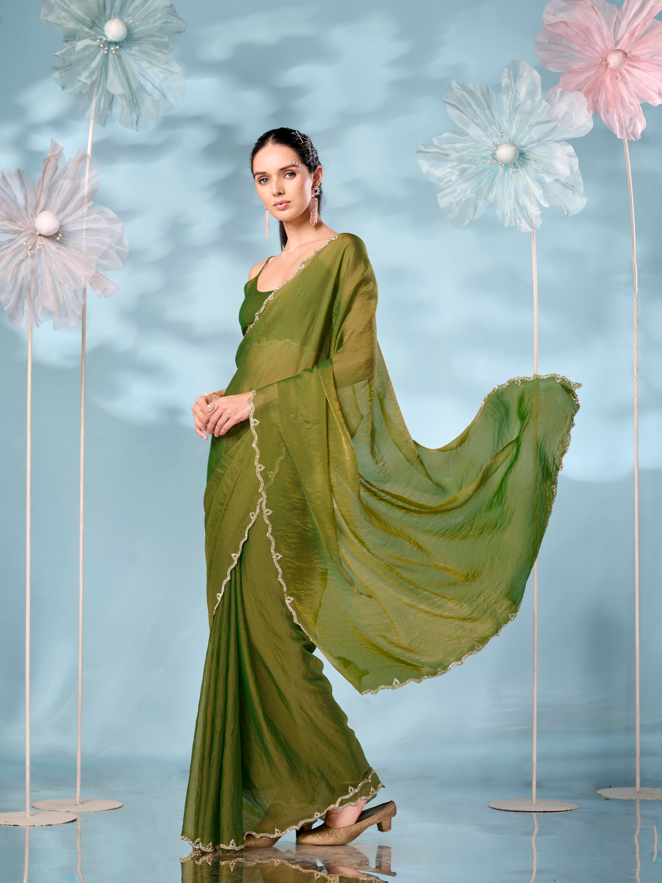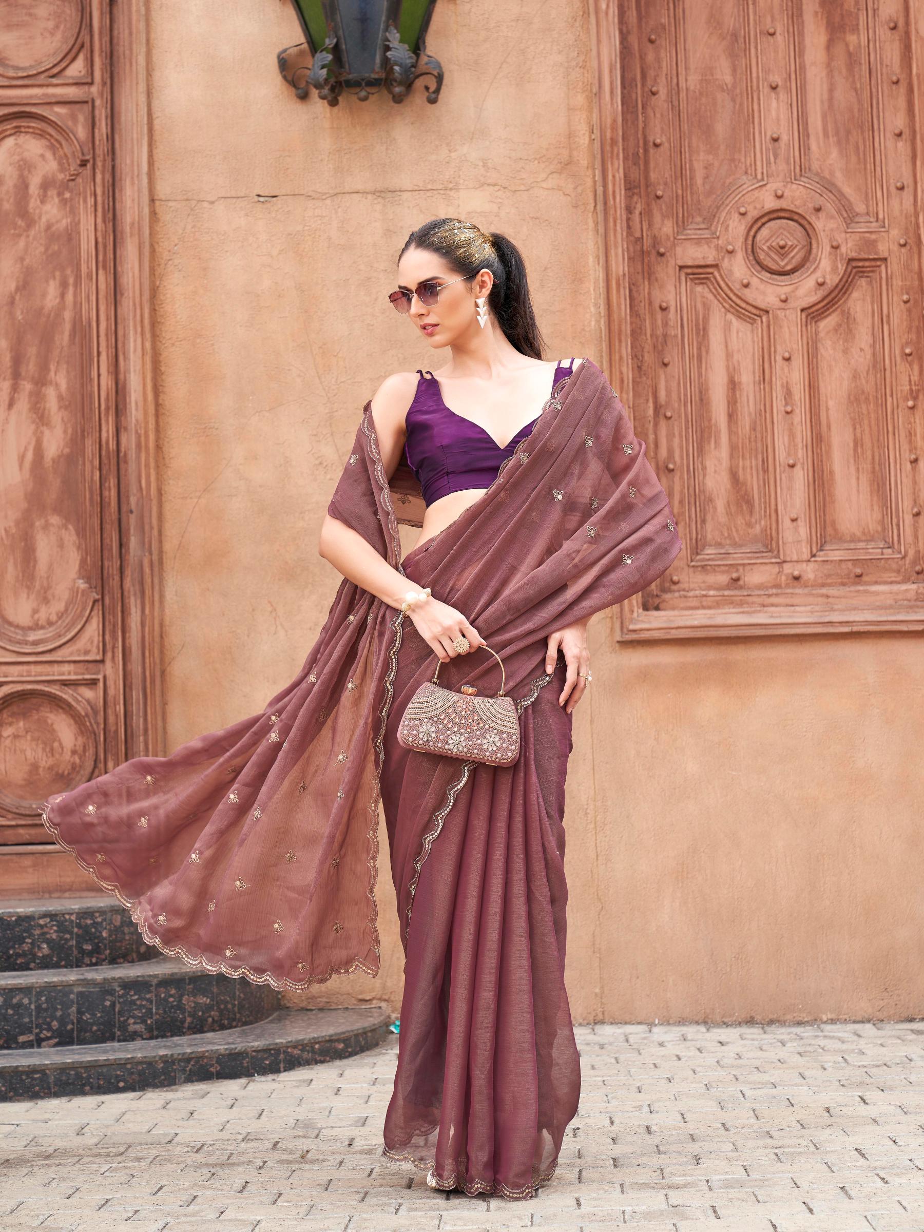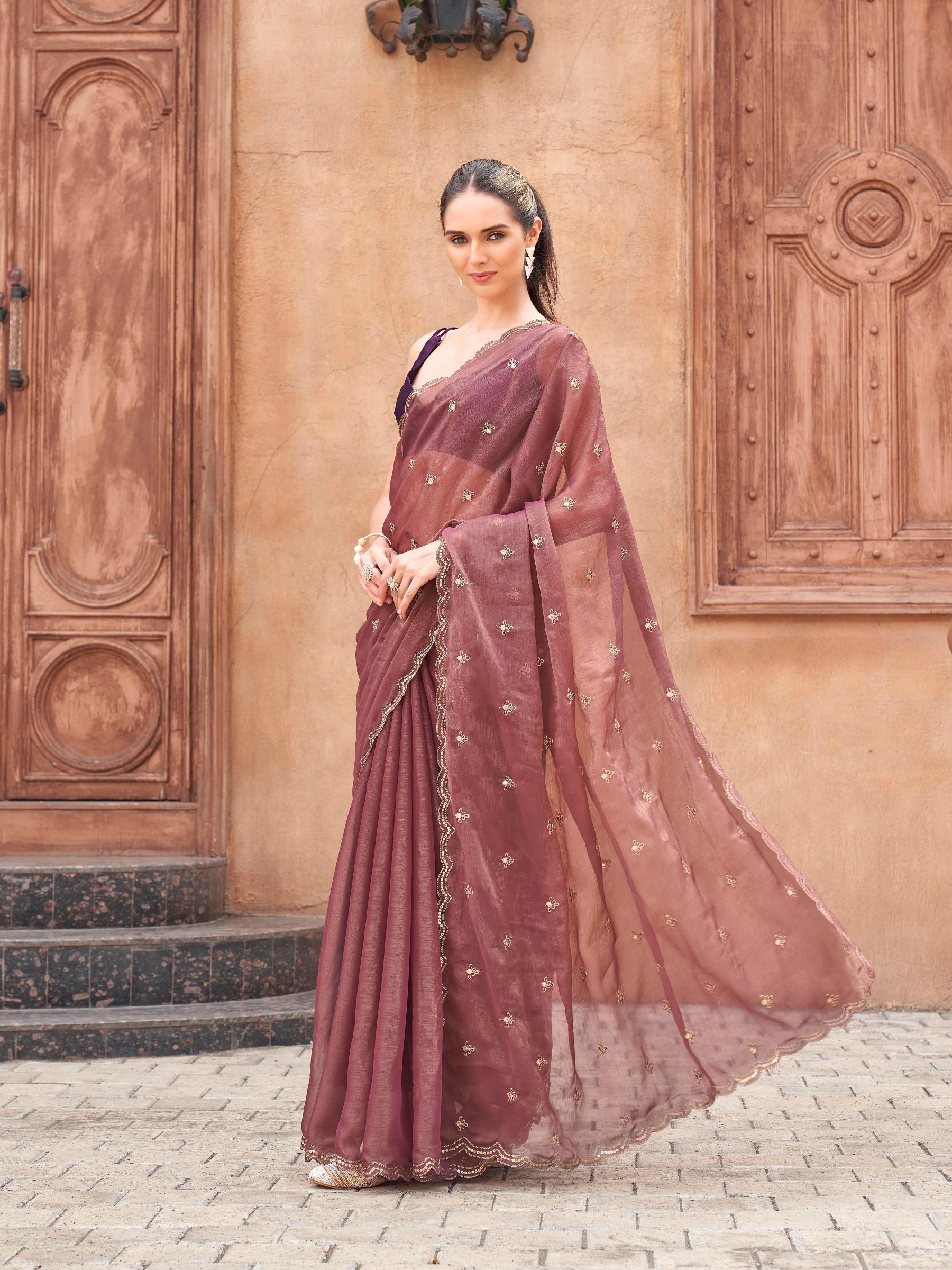Two tone Brown and Pink colored saree with mirror embroidery on pallu and scalloped border