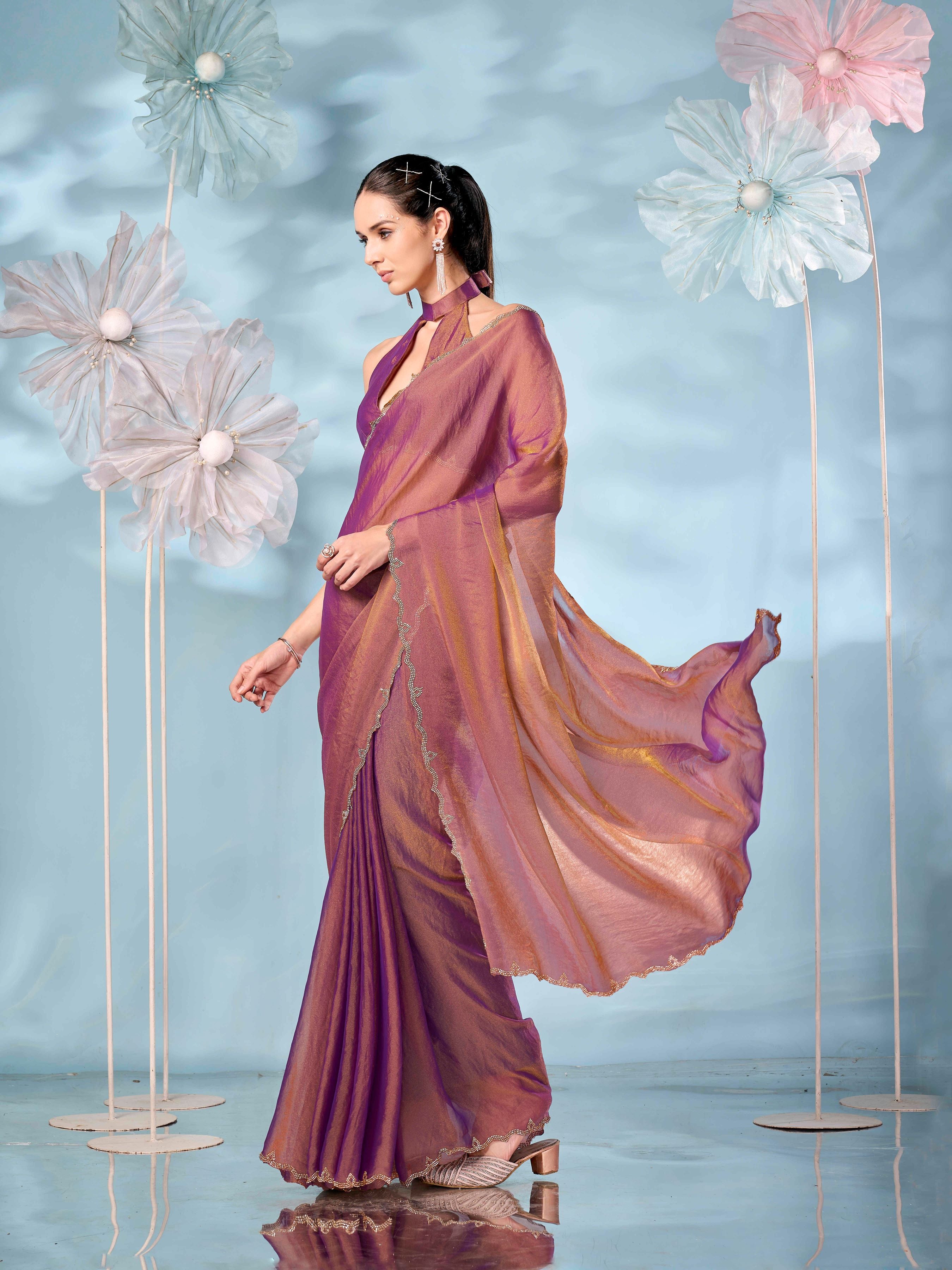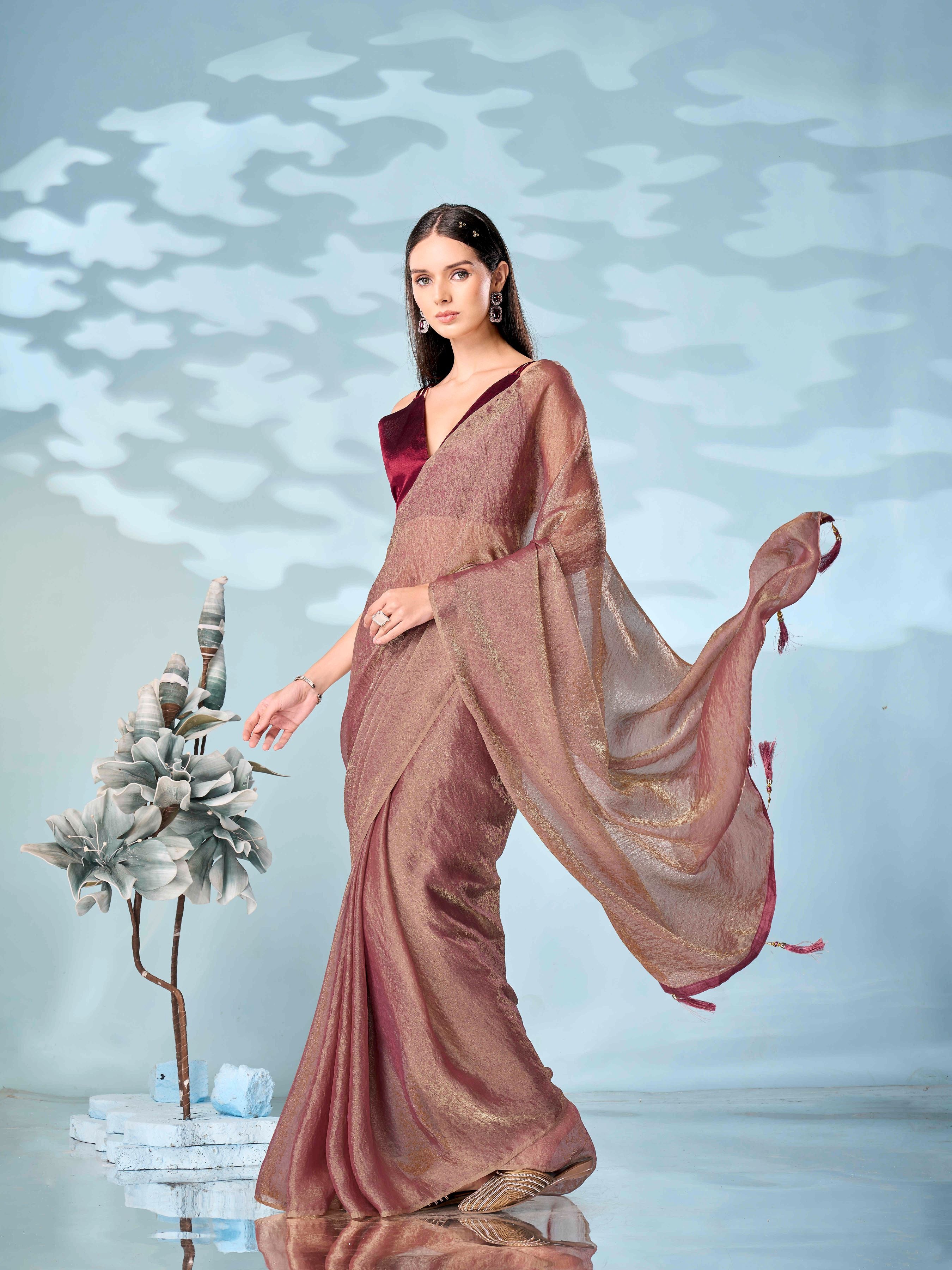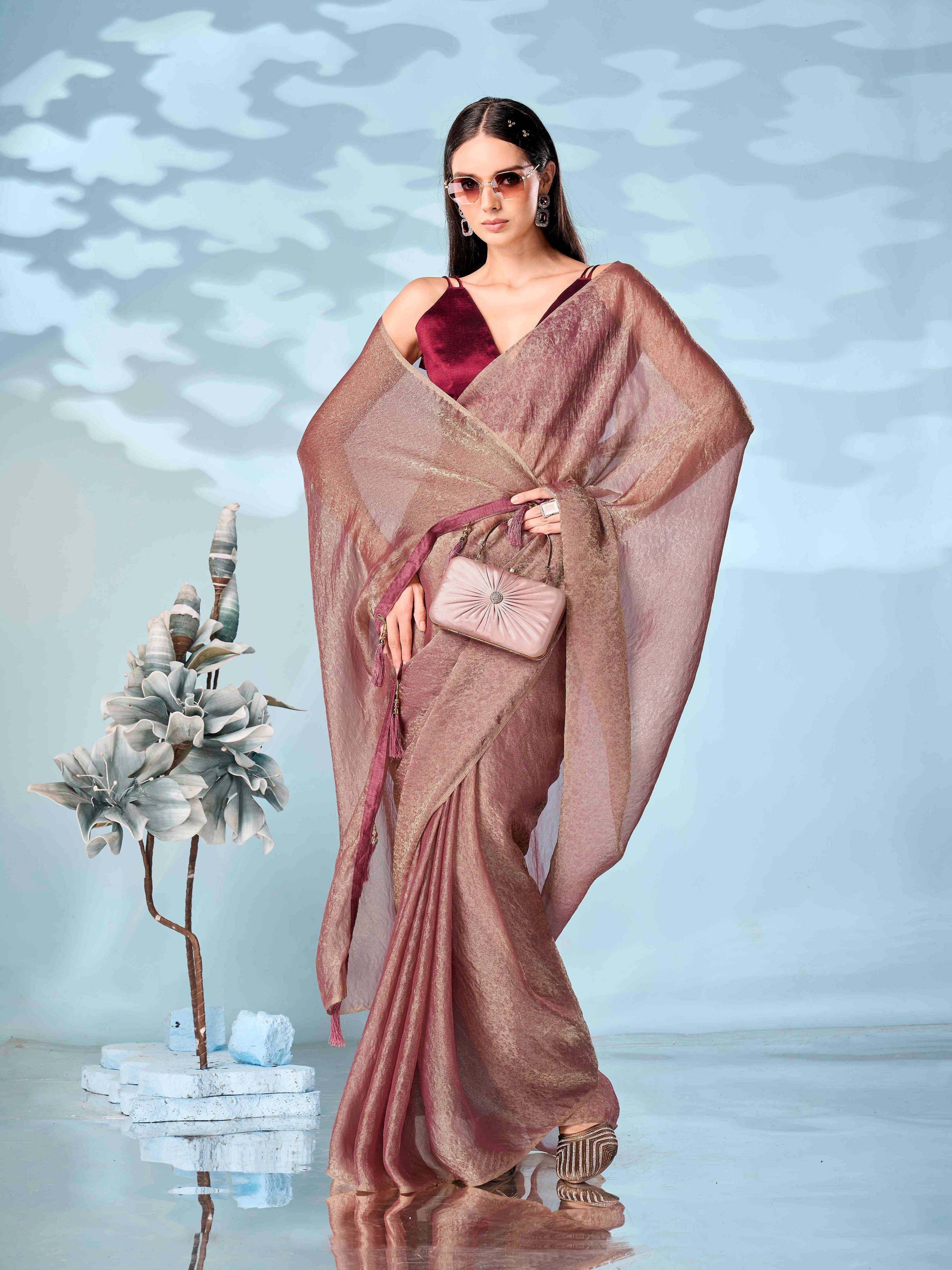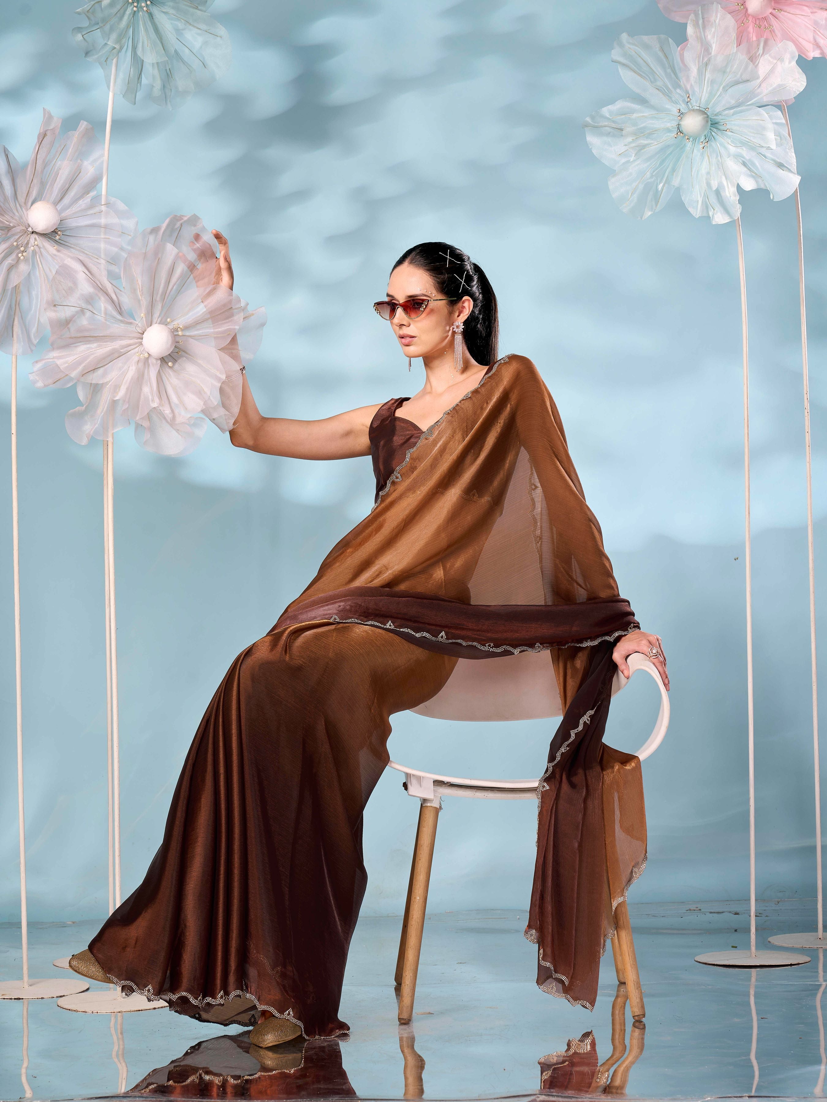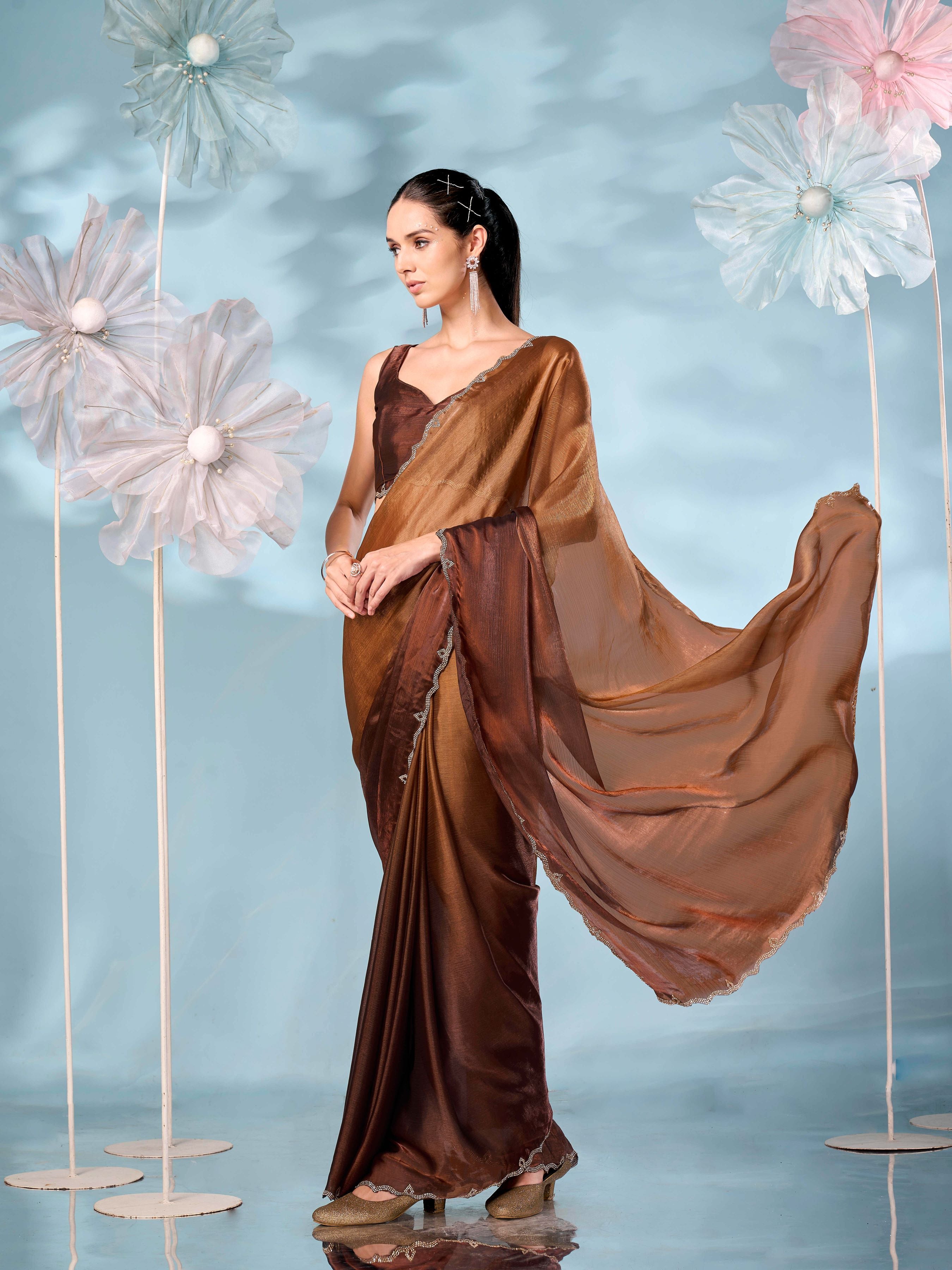 Two tone rust & brown colored jimmy choo saree with swaroski border