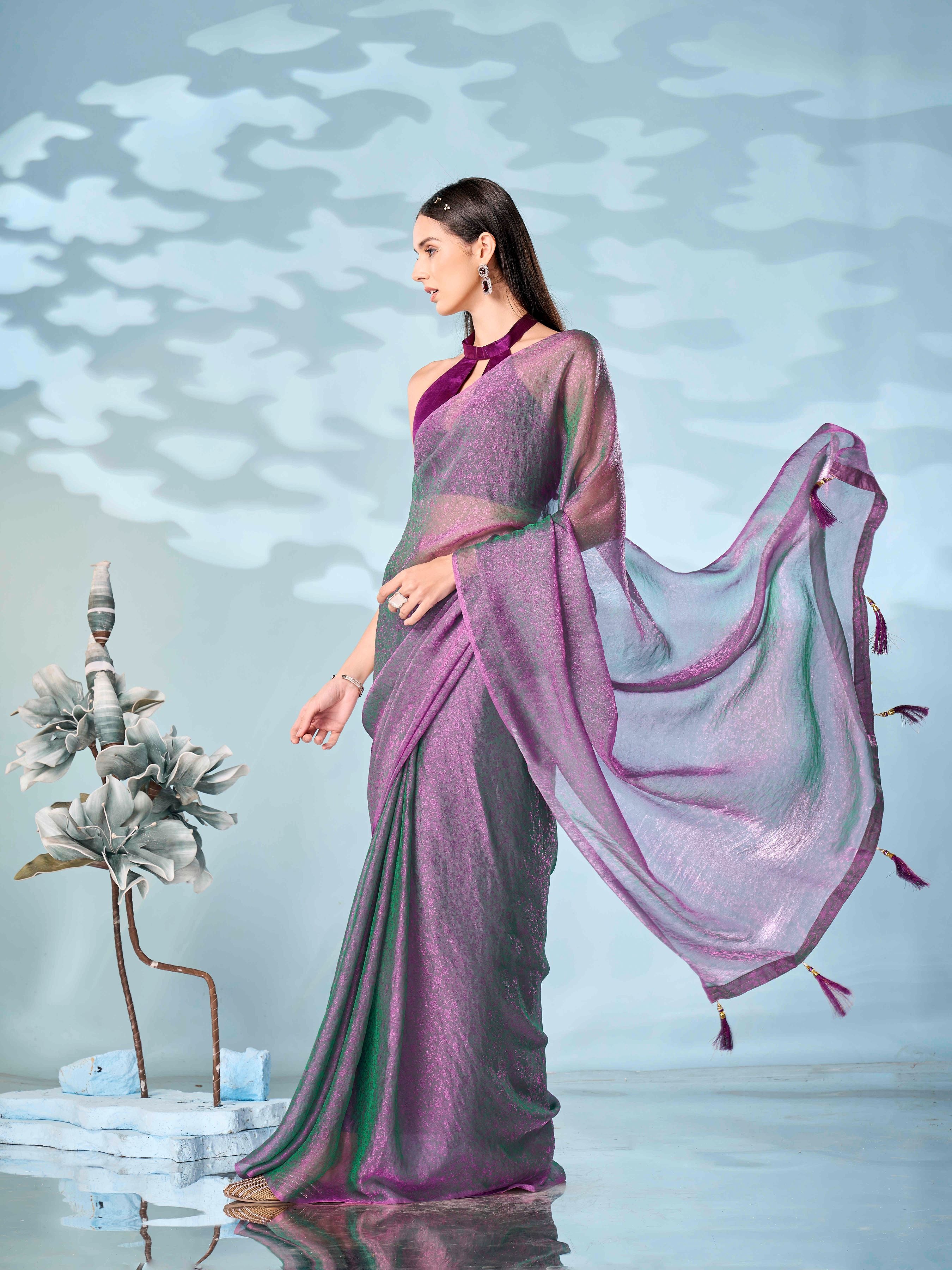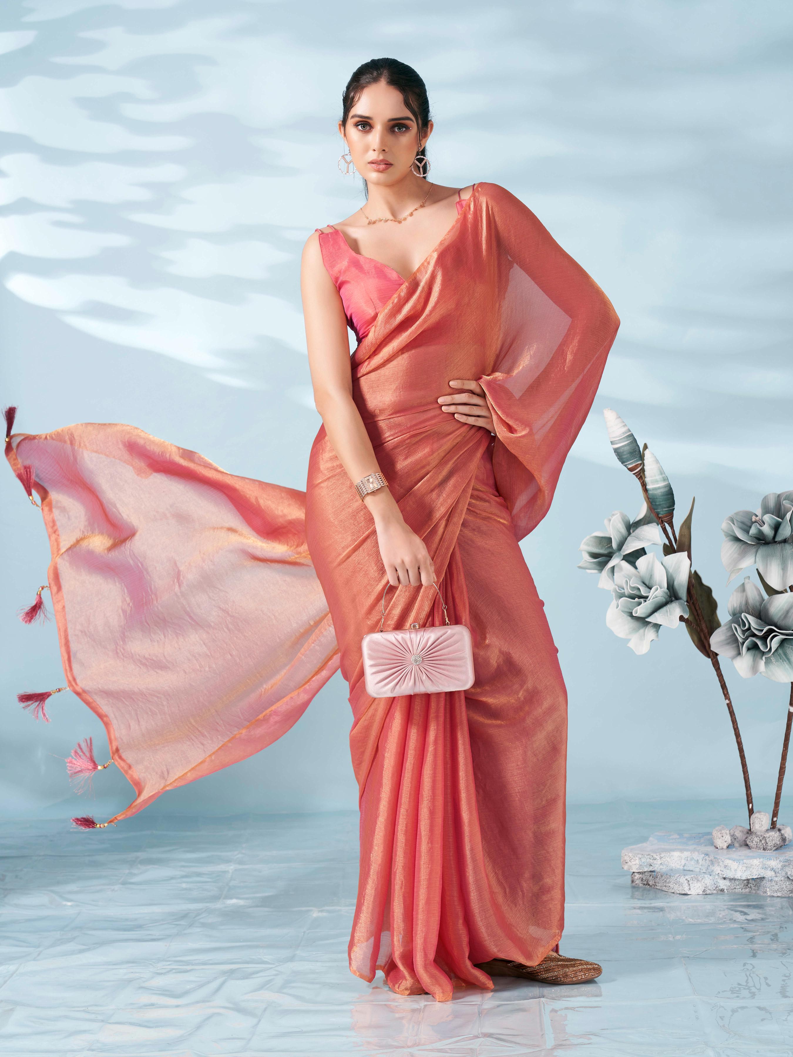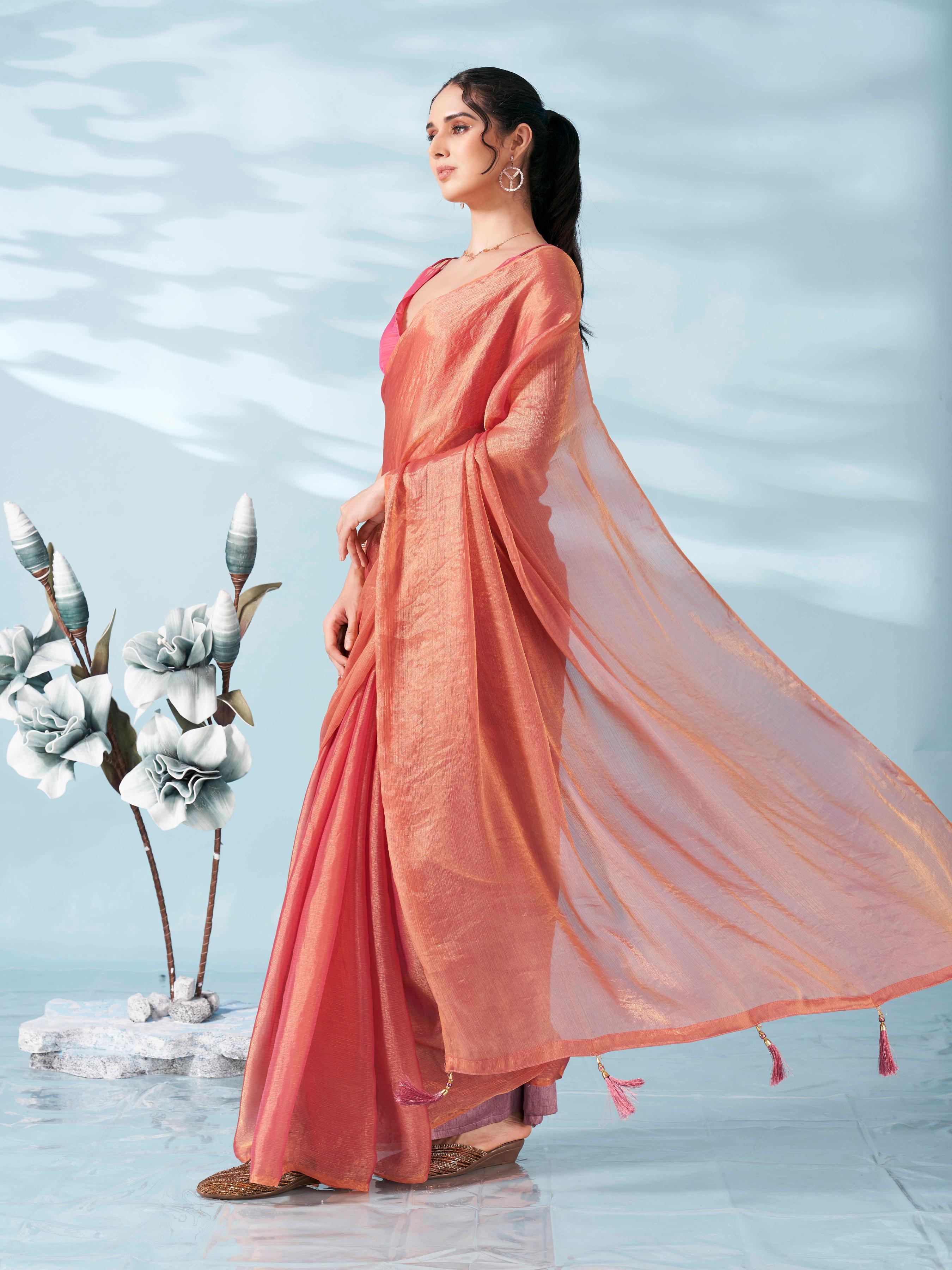 Two tone pink colored satin chiffon saree with tassles on pallu