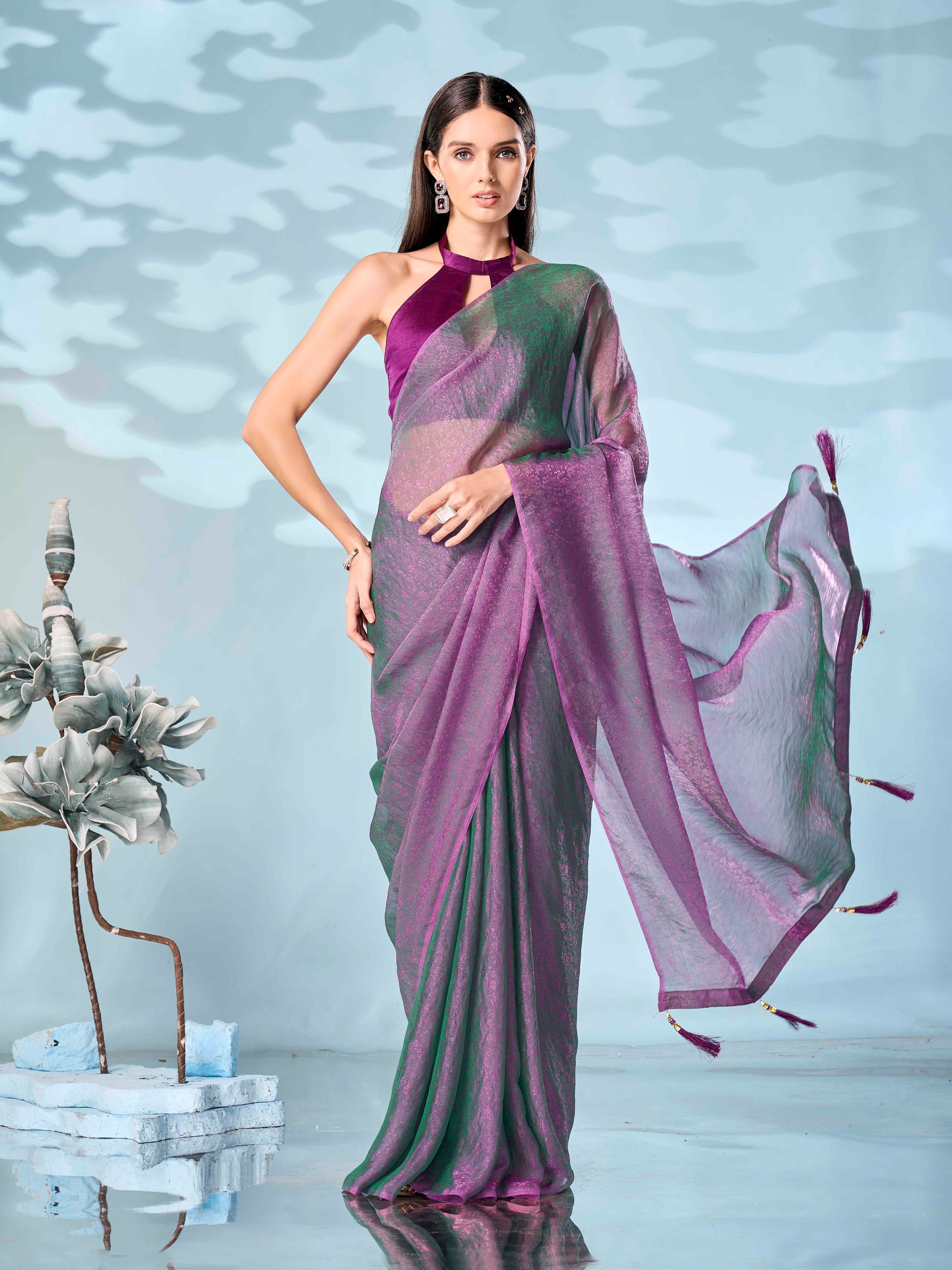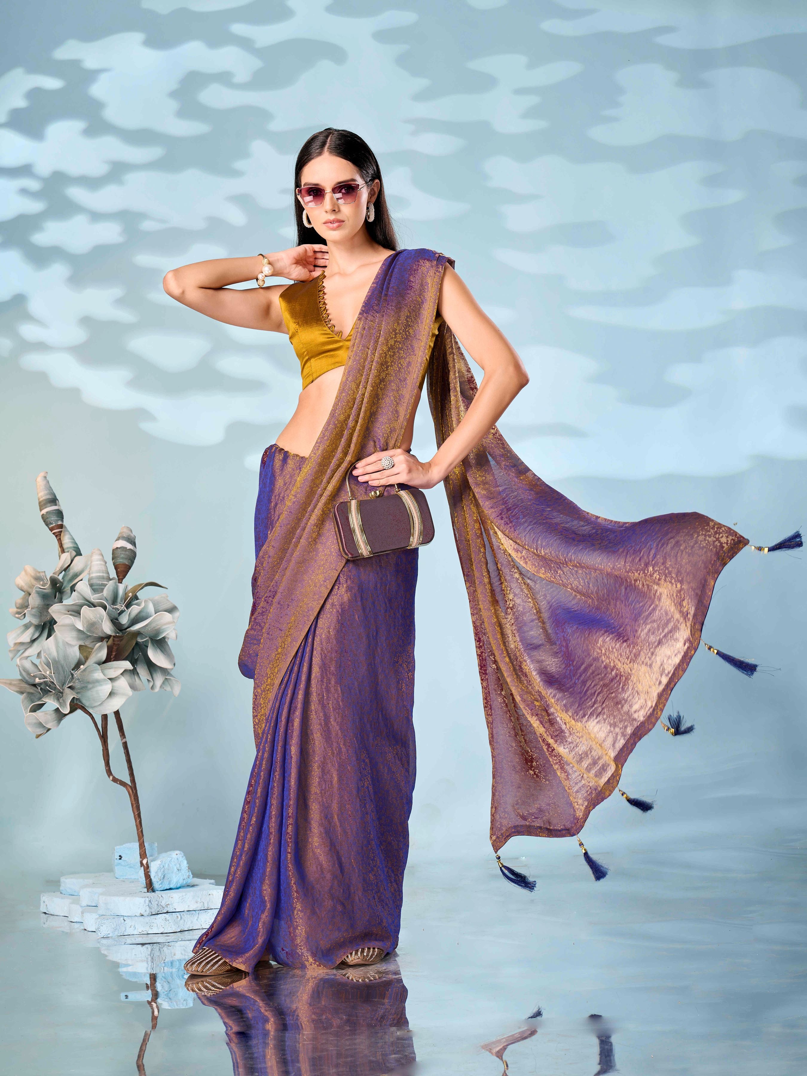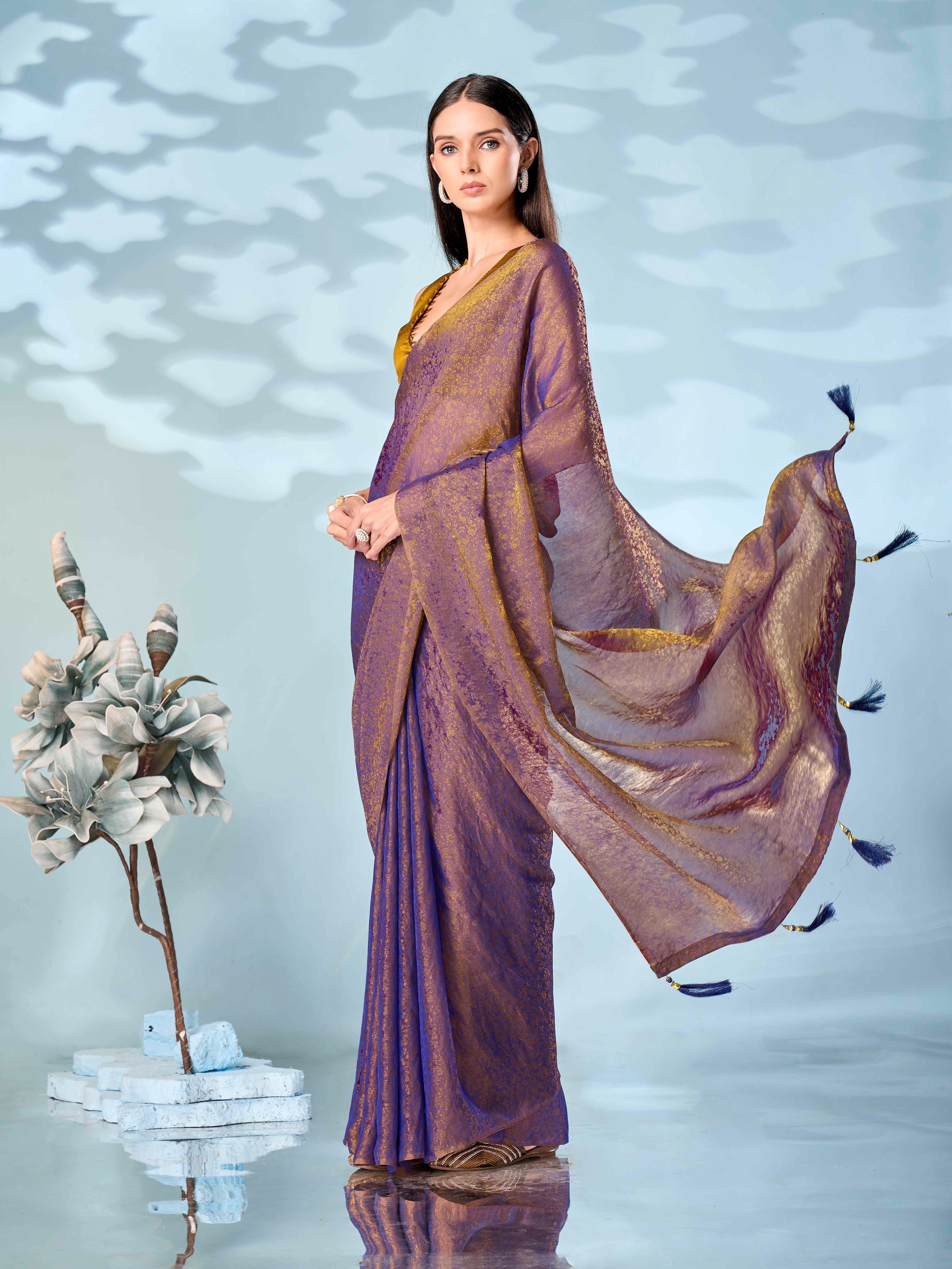 Two tone purple and mustard colored woven saree with tassles on pallu