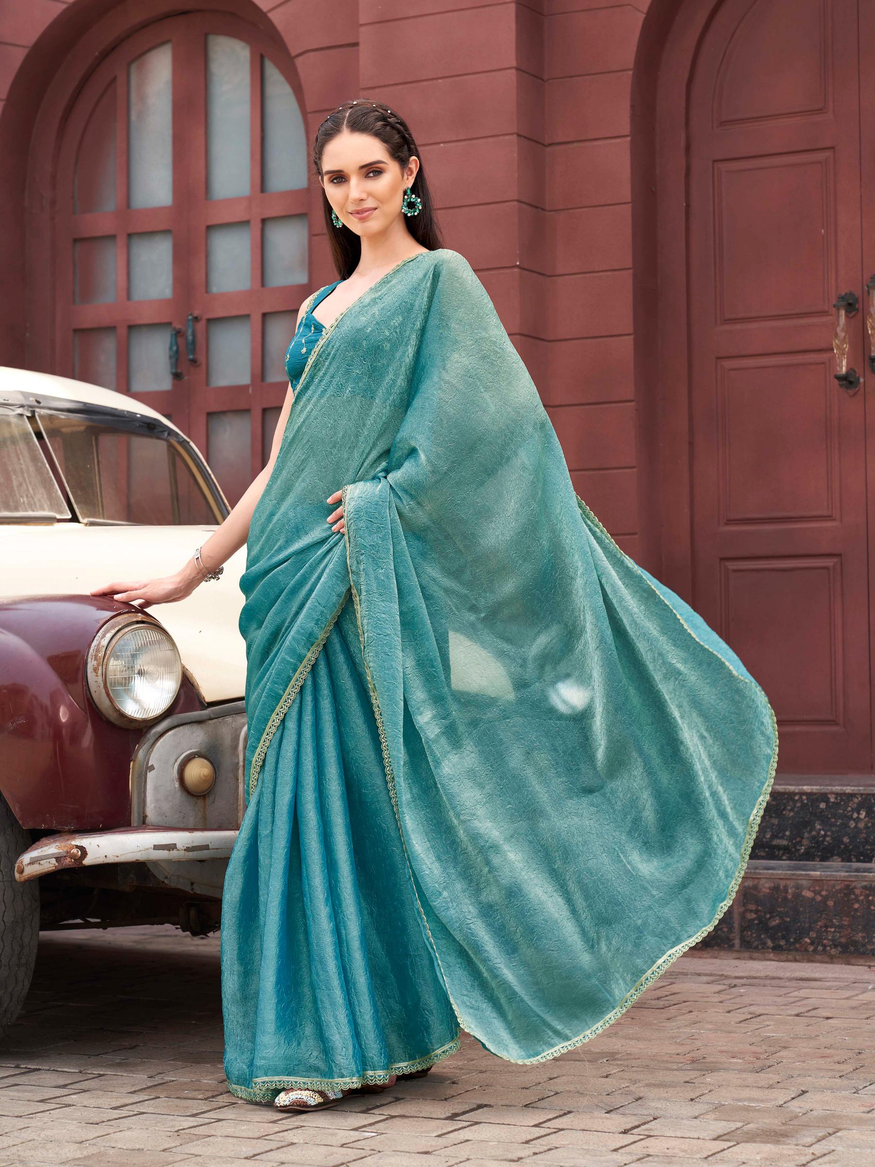 Two toned green and gold colored wrinkled saree with embroidered blouse and embellished lace