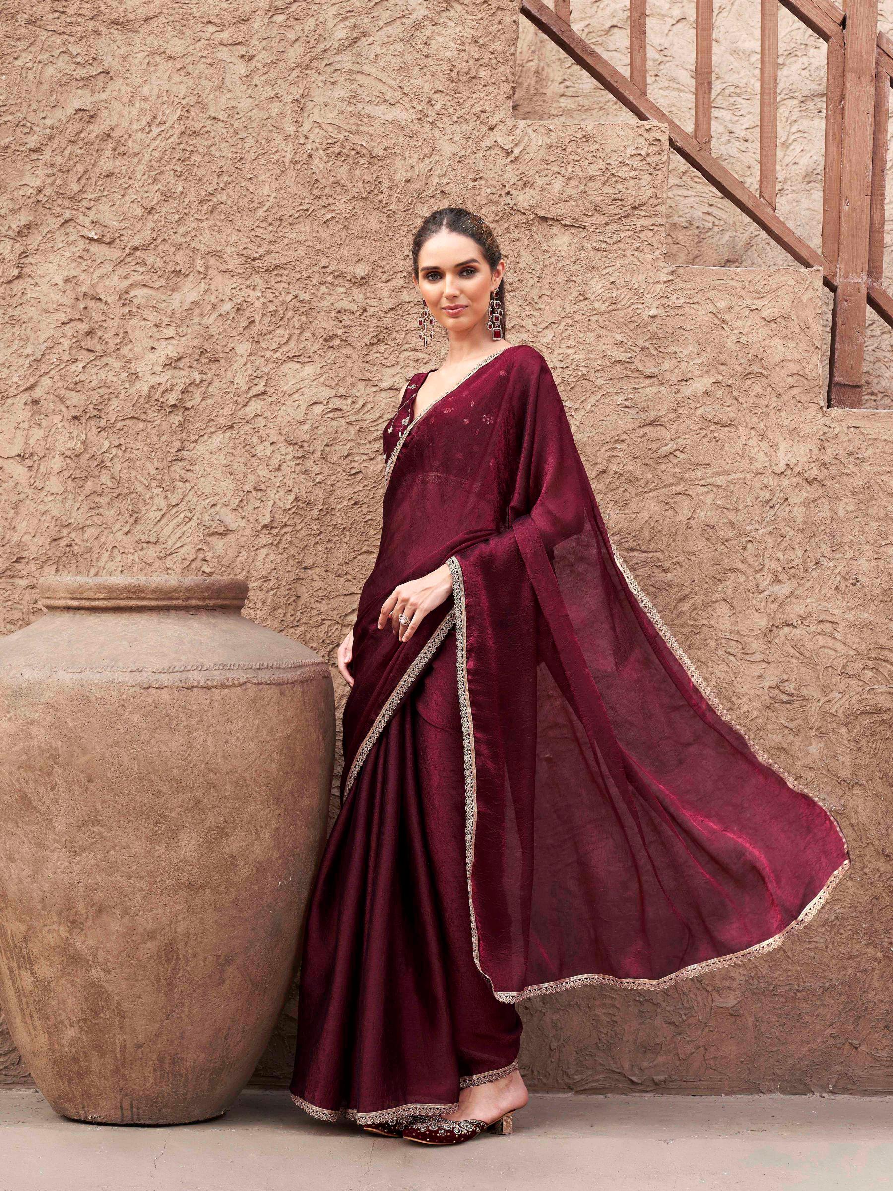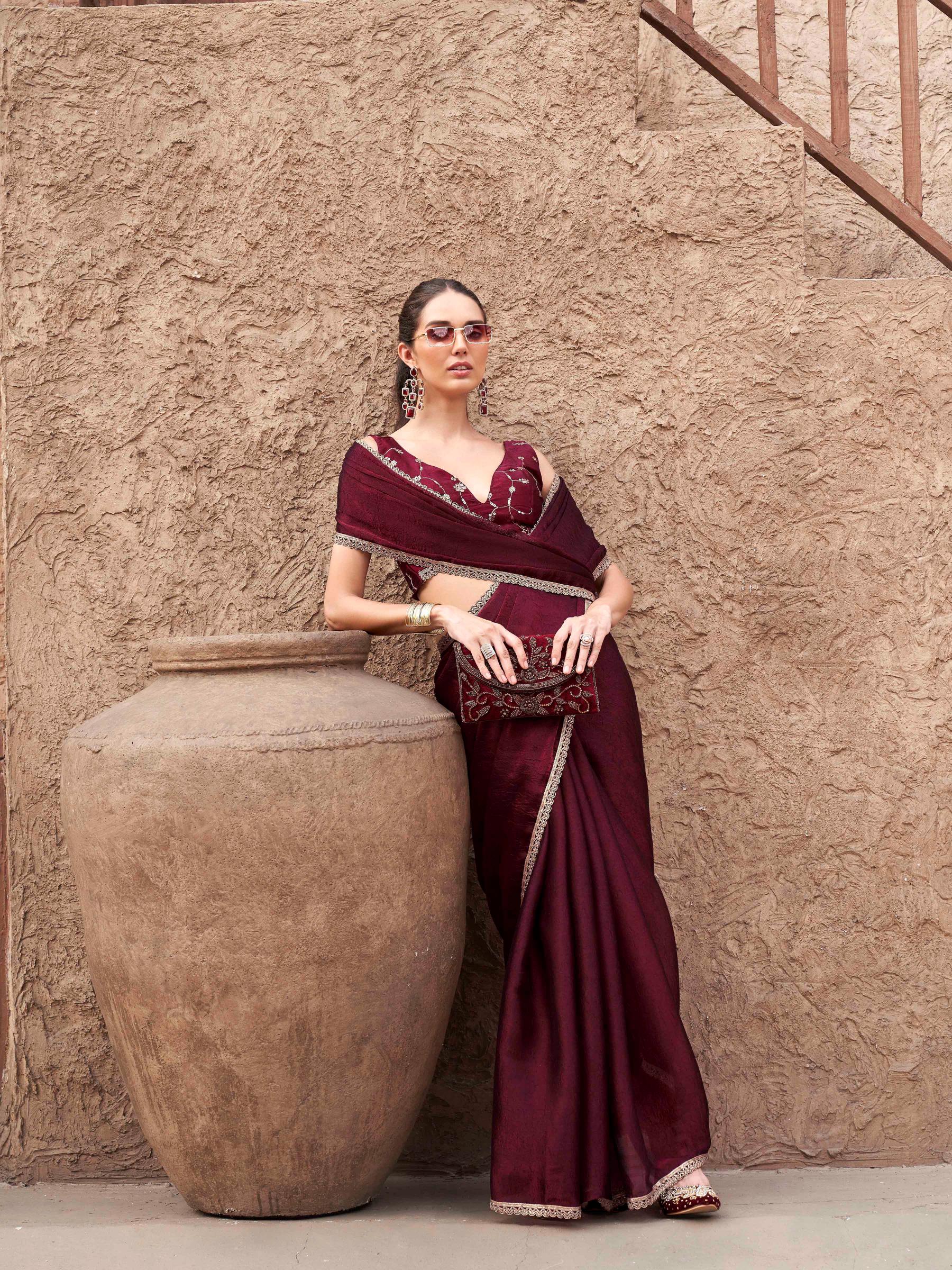 Two toned maroon colored wrinkled saree with embroidered blouse and embellished lace