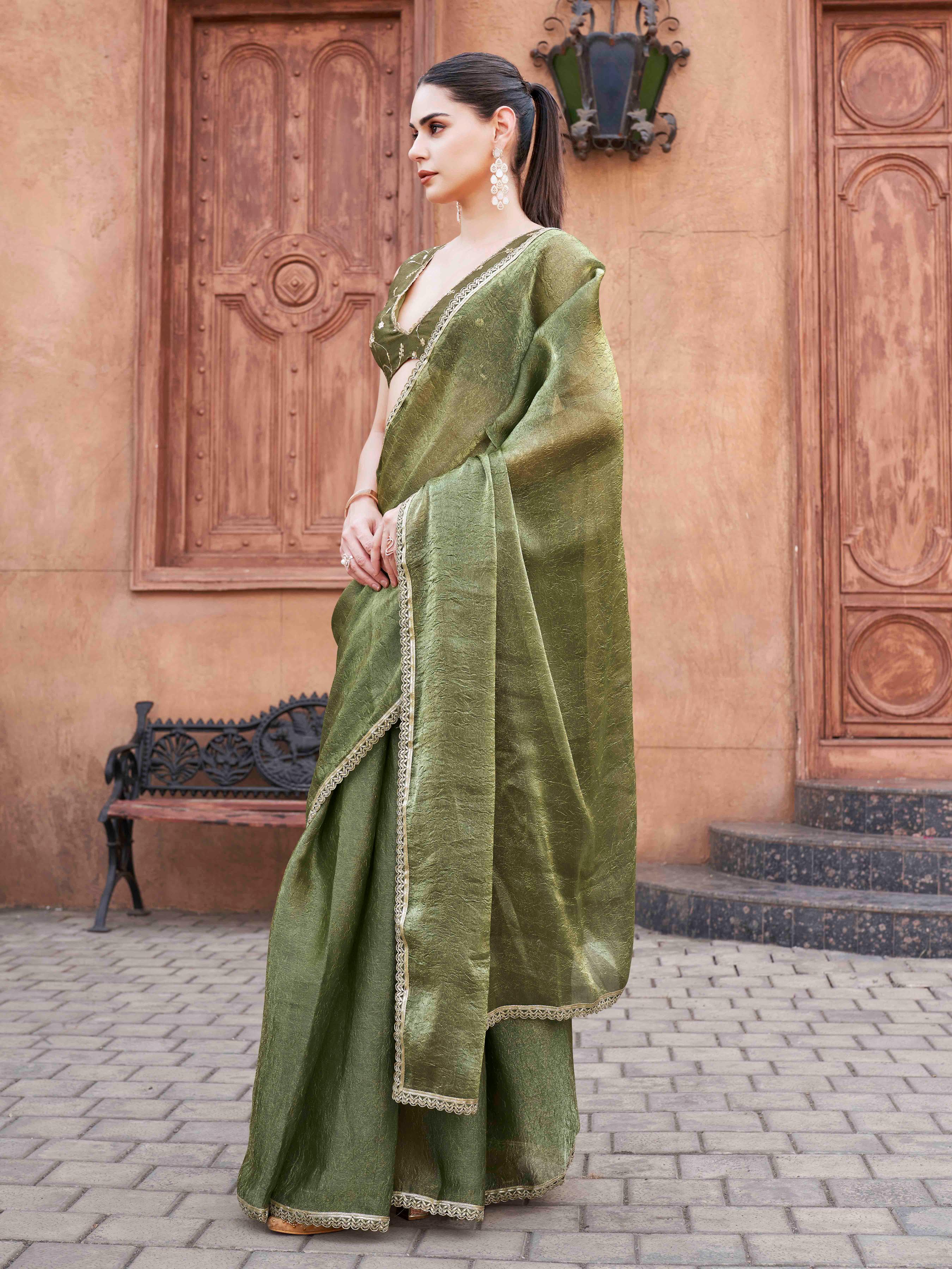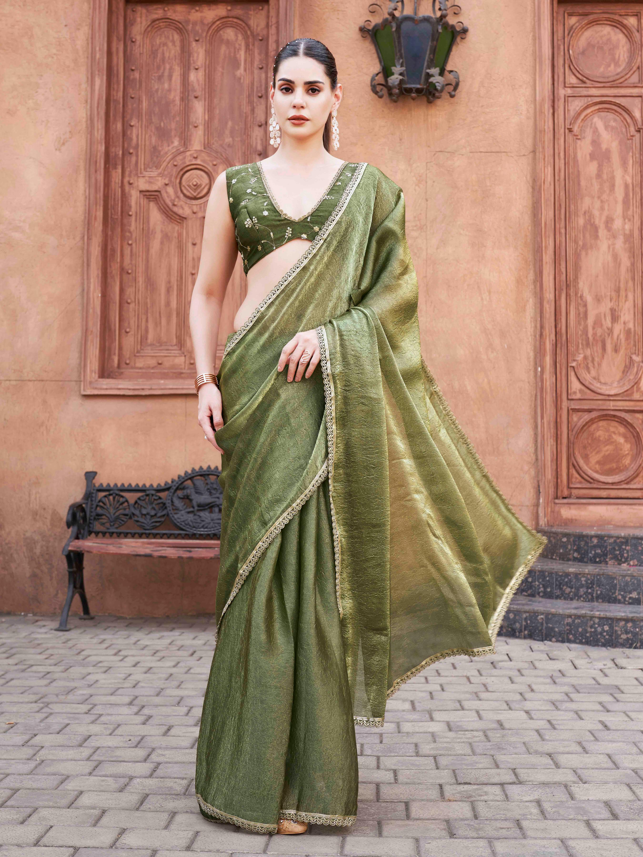 Two toned olive green and gold colored jimmy choo saree with brocade blouse and embroidered lace