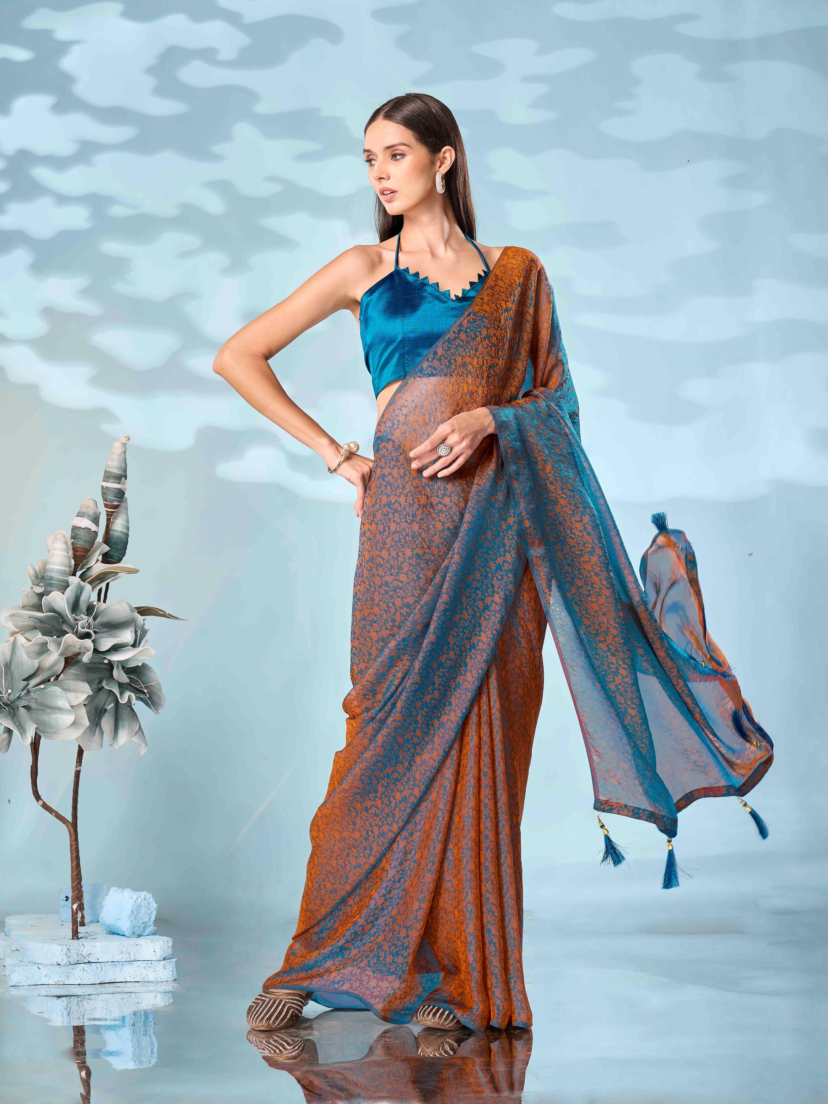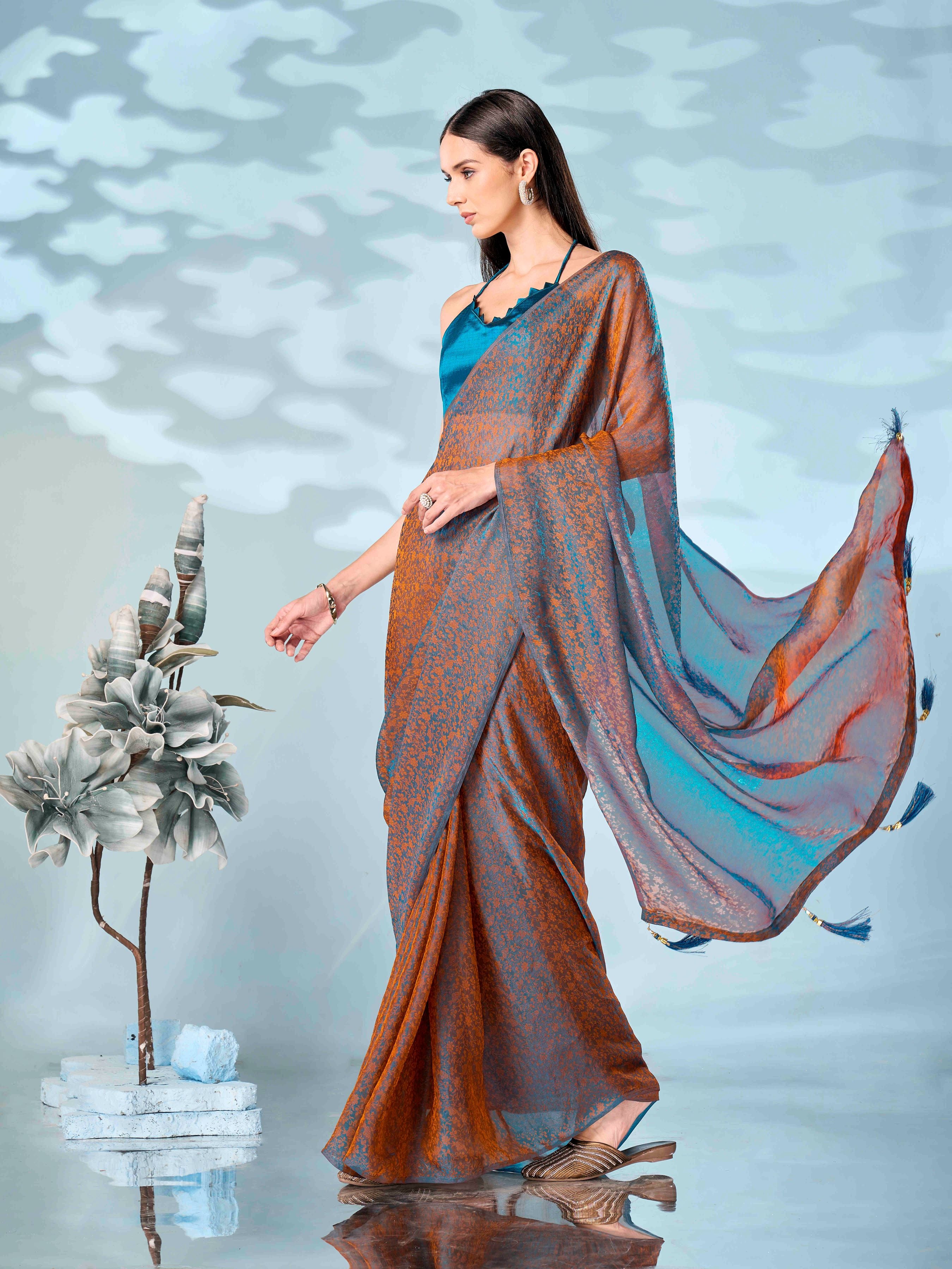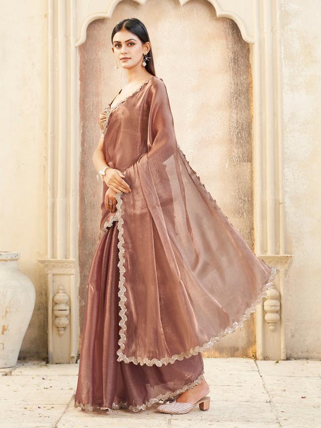 Two toned copper and gold colored jimmy choo saree with embroidered lace