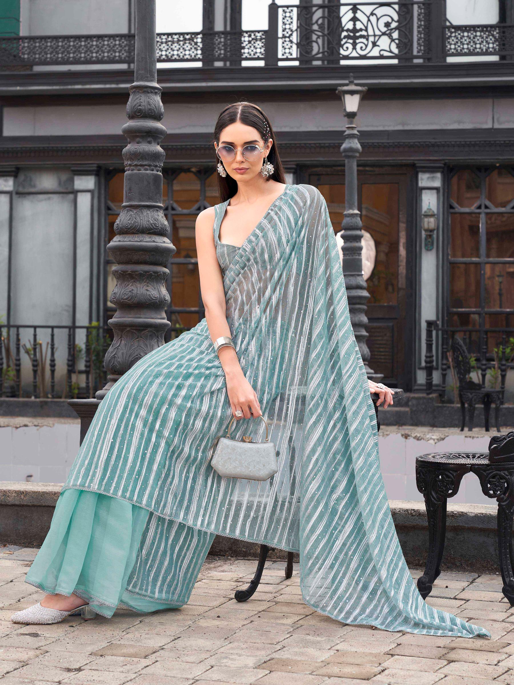 Blue colored organza saree with embellished work
