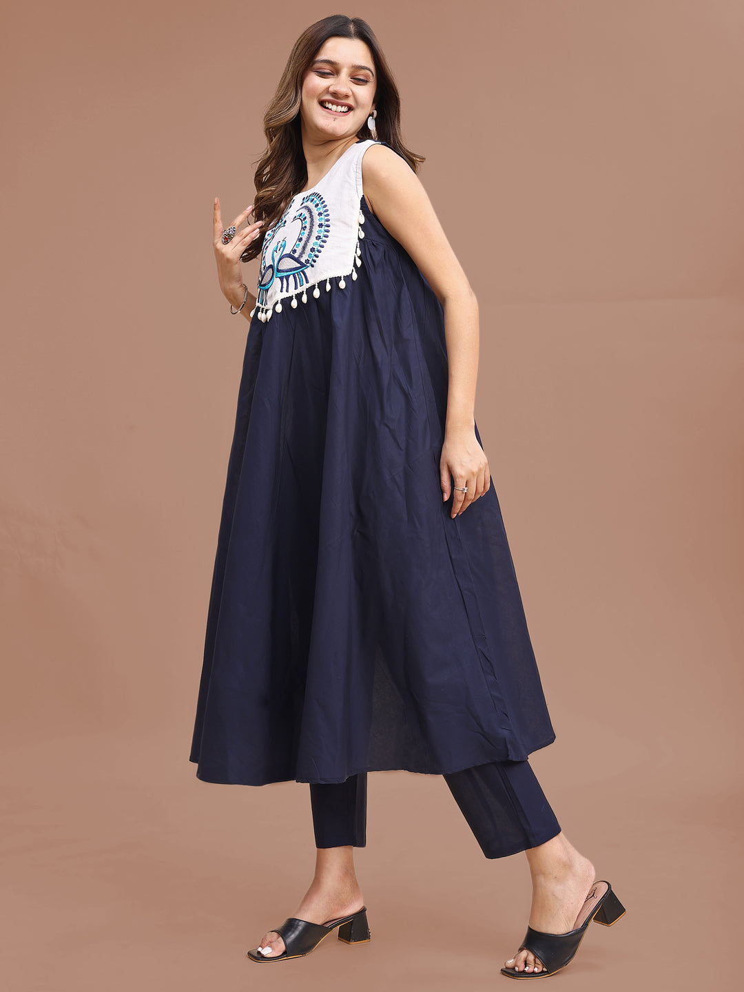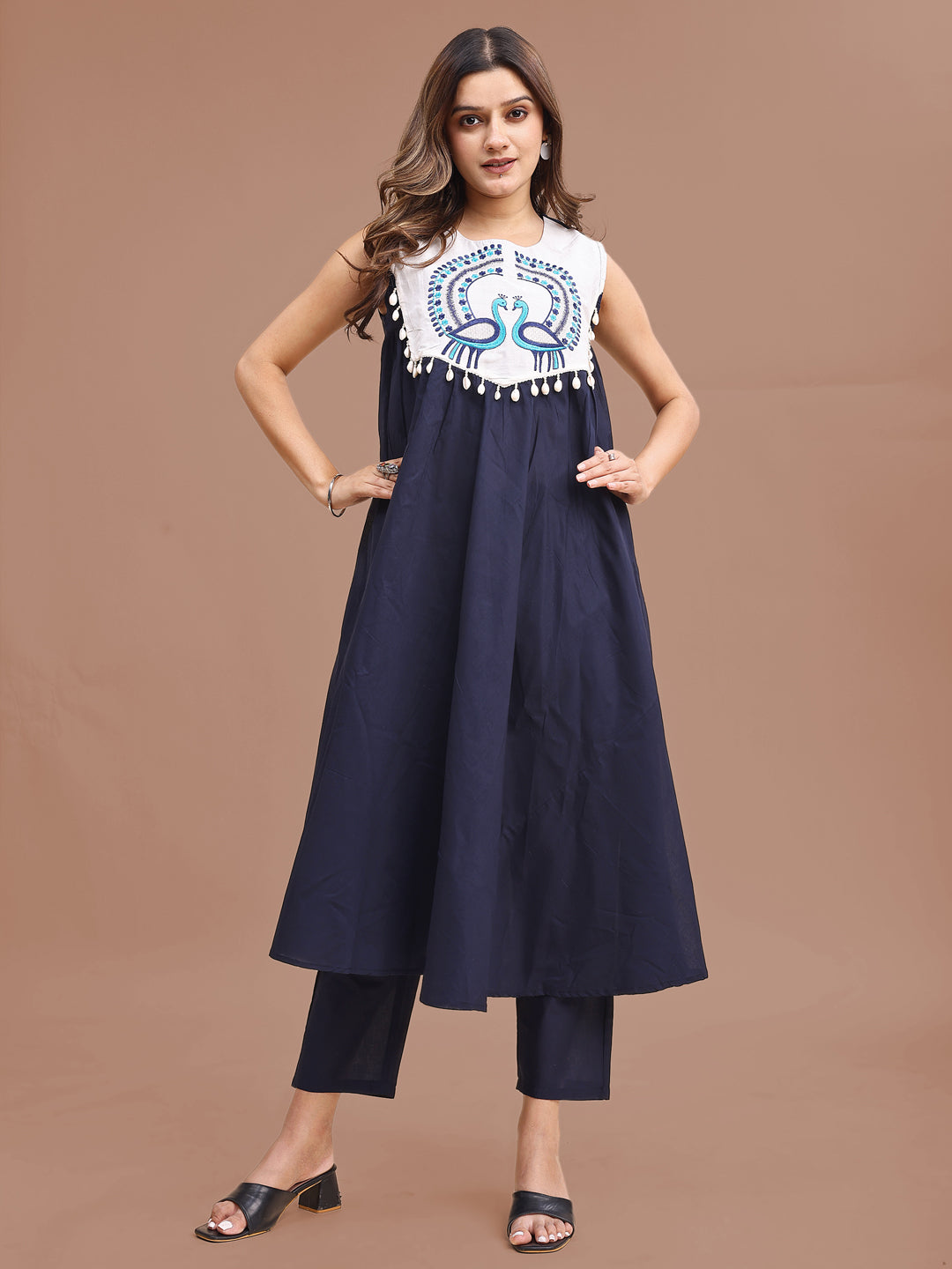 Blue Colored Pure Cotton With A-Line Peacock Embroidered Co-ord Set