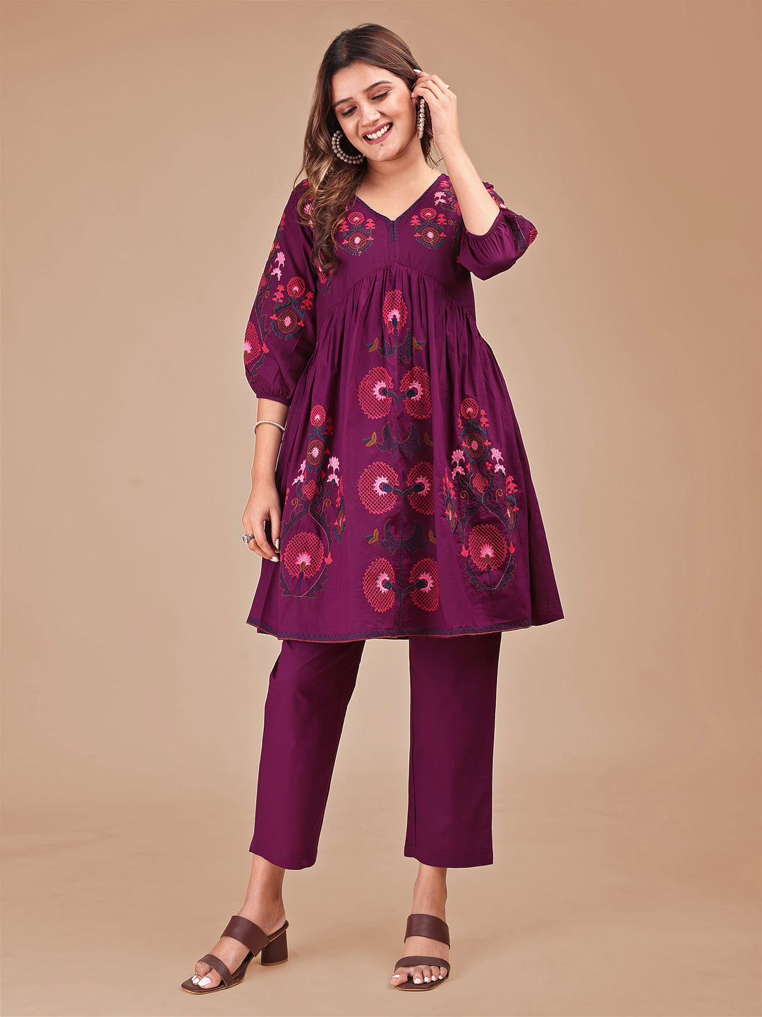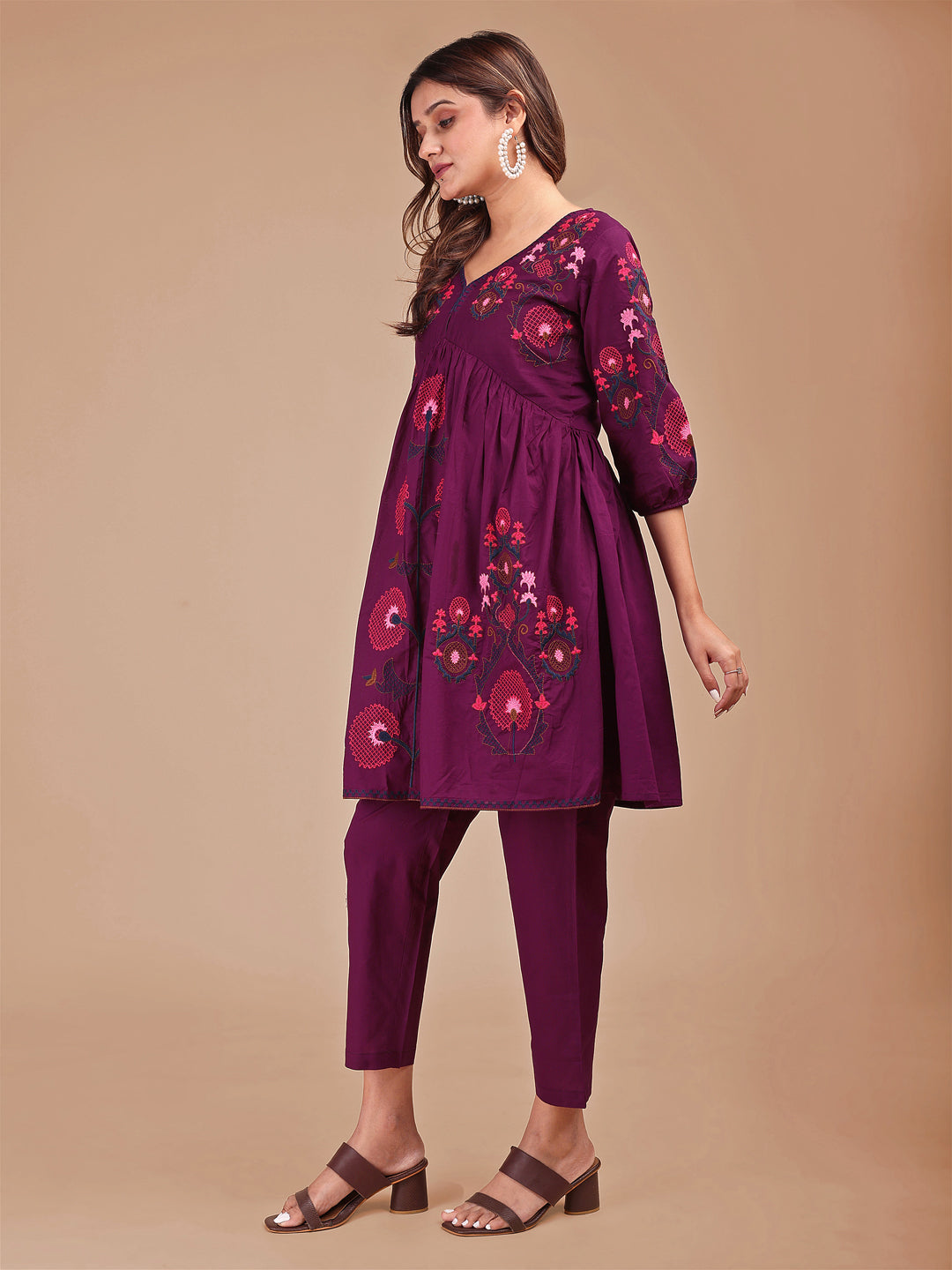 Wine Colored Contrast Thread Work Cotton Co-ord Set