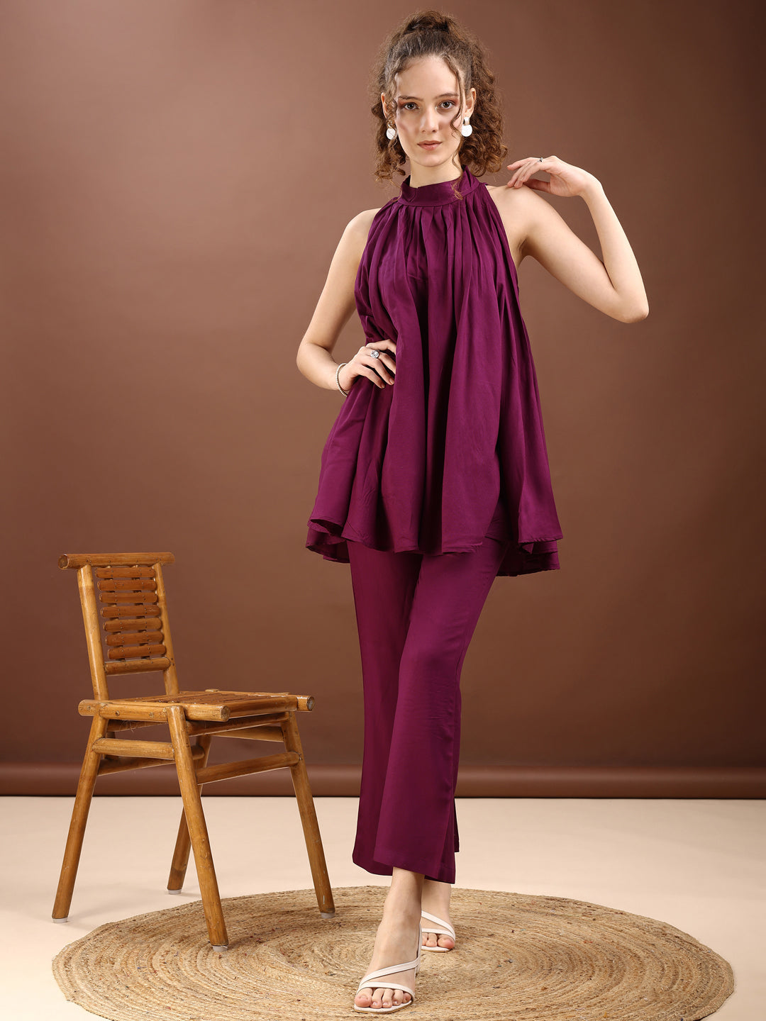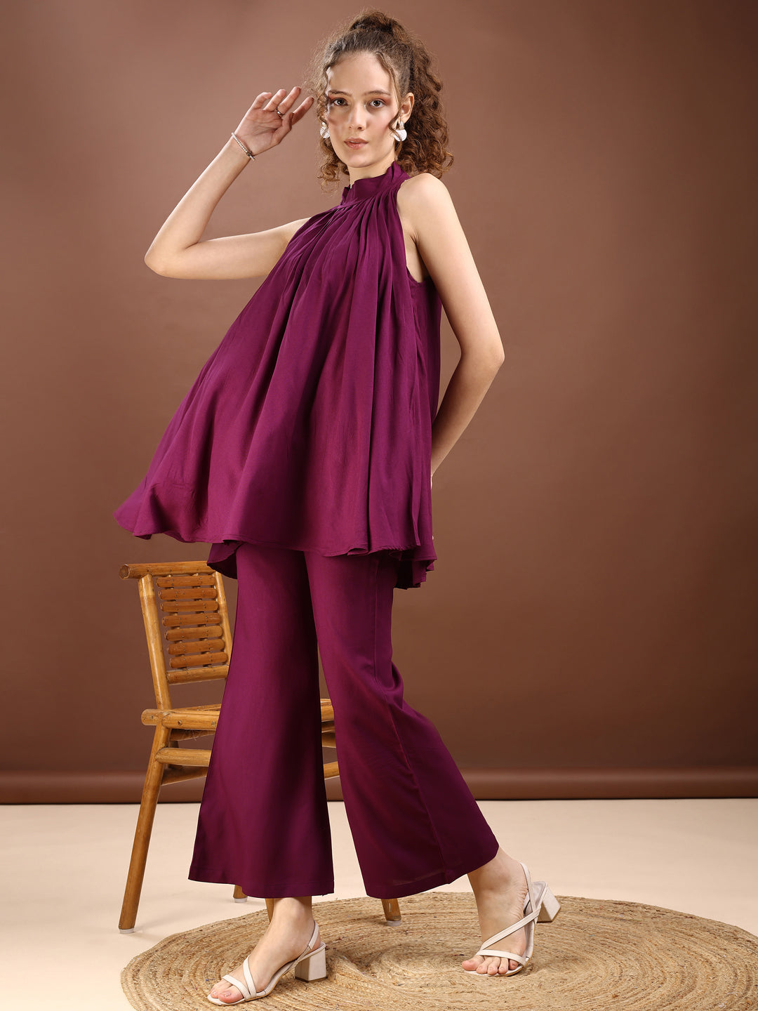 Wine Colored Halter Neck Rayon Sleeveless Top With Bell Bottom Pant Co-ords Set