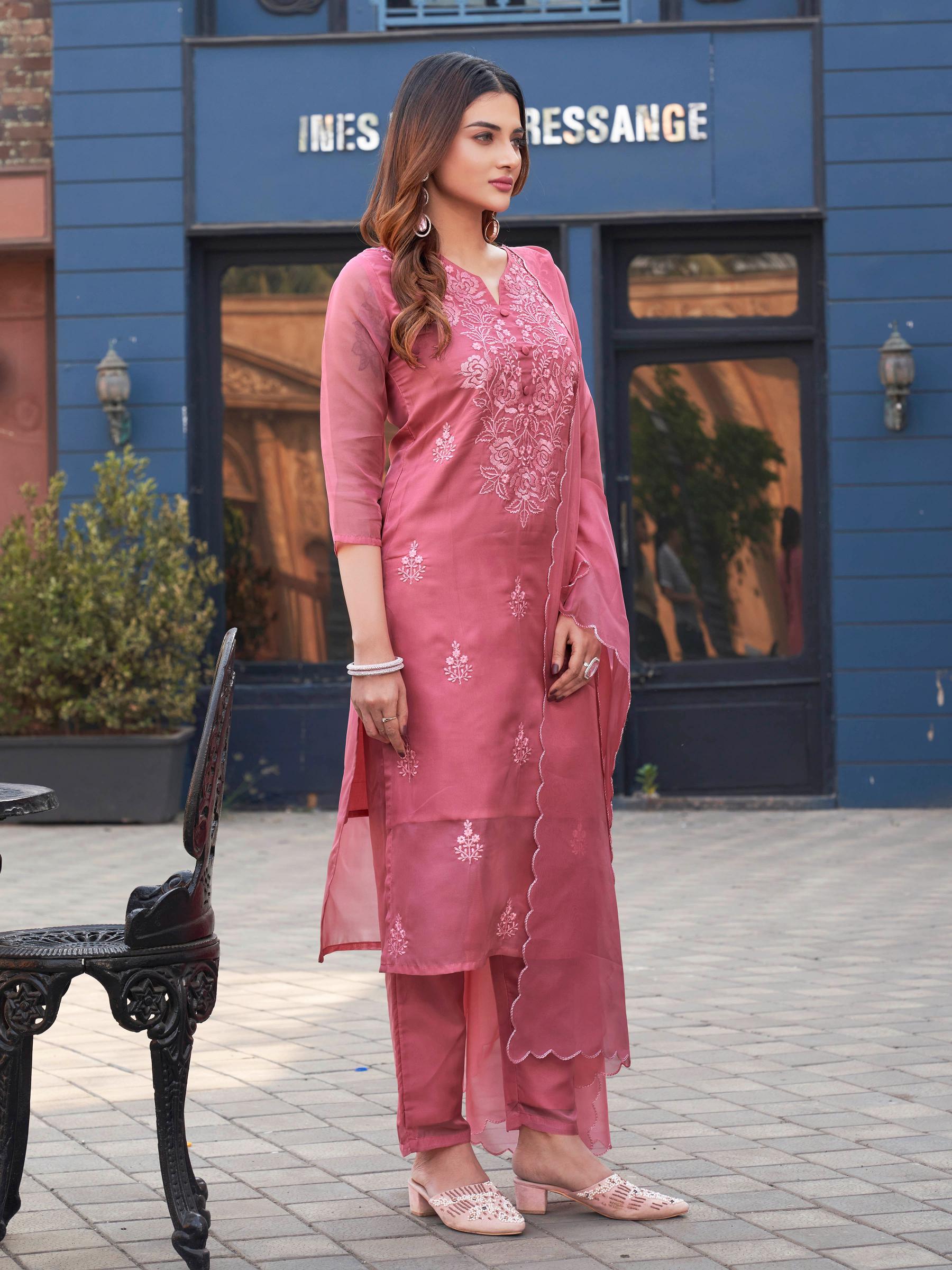 Blush Pink Organza With Tonal Thread Embroidery Round Neck Straight Kurta Set