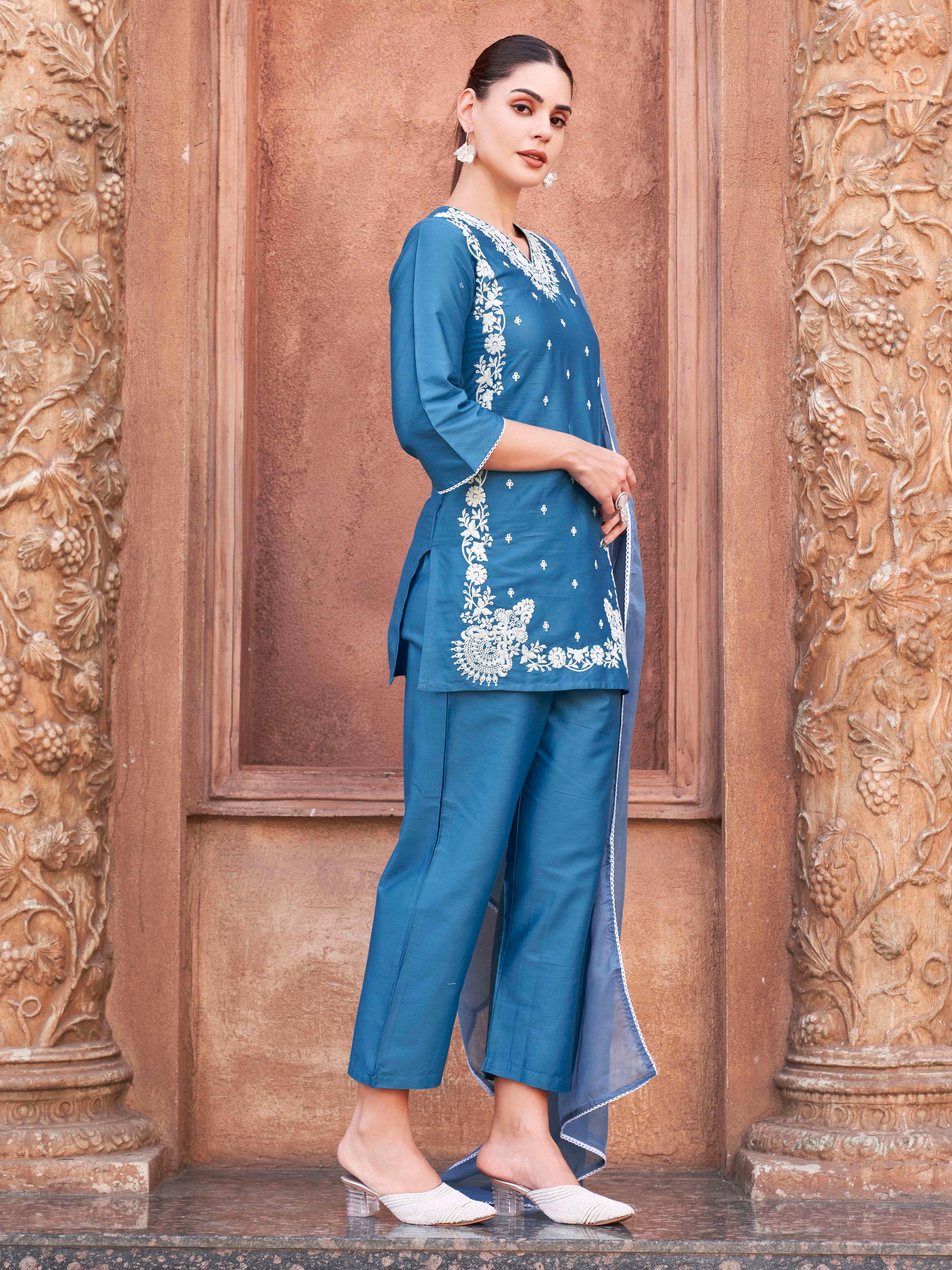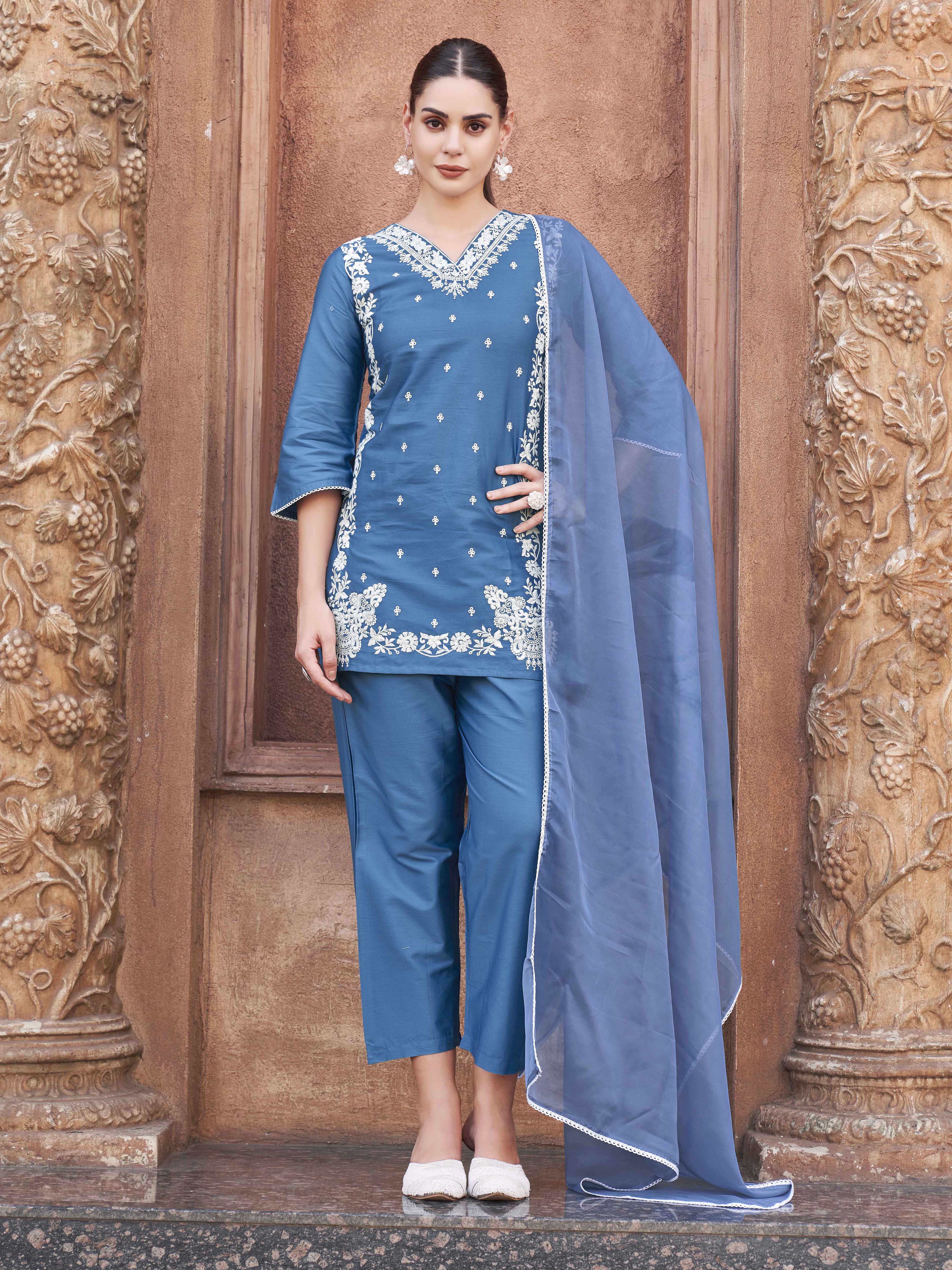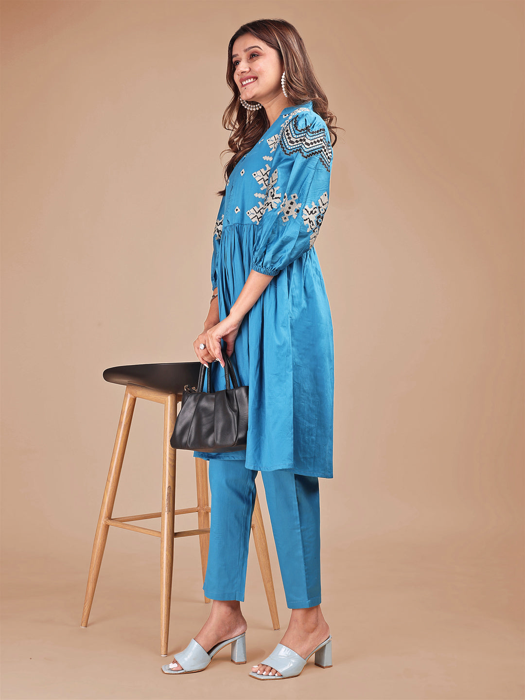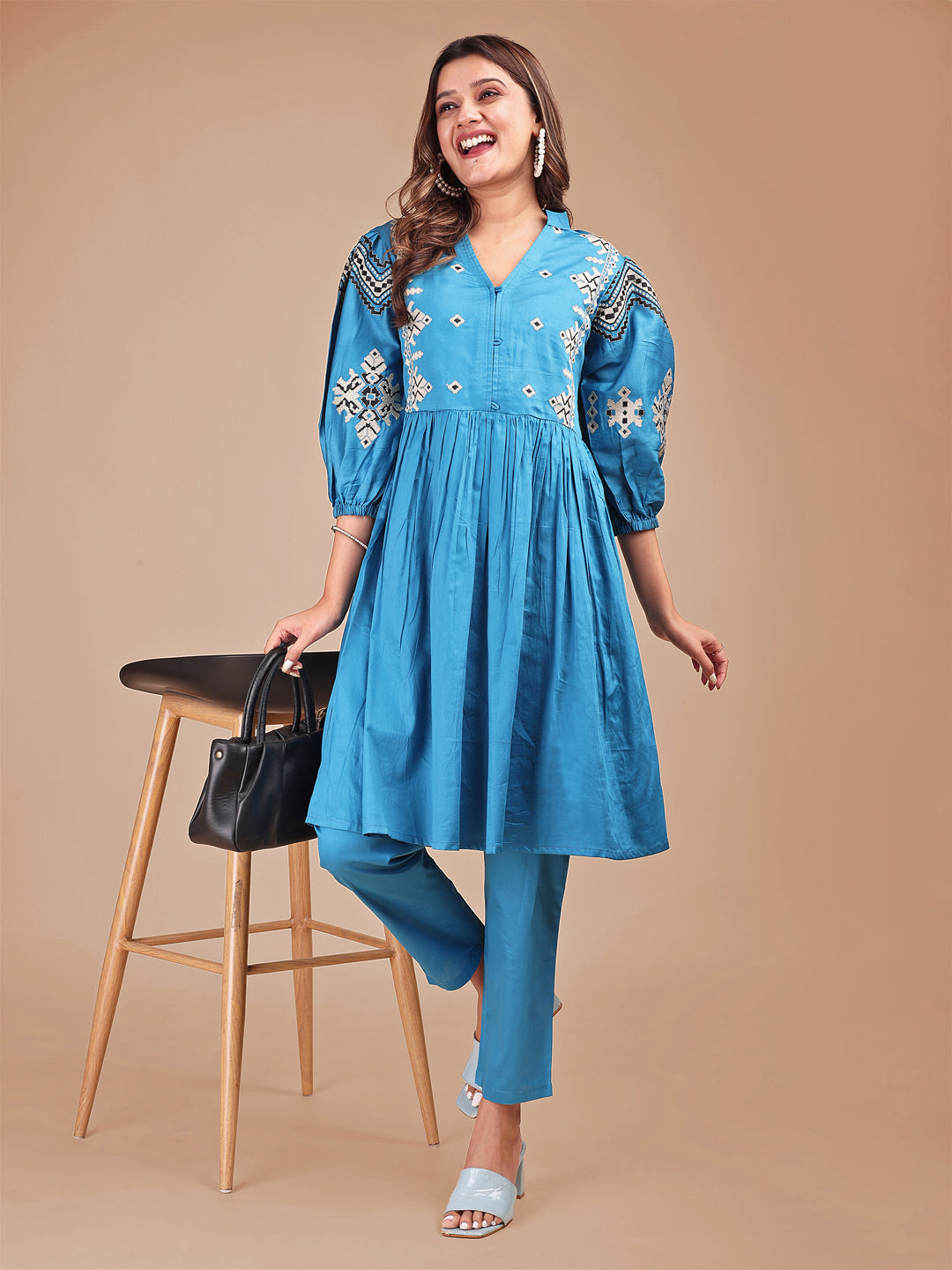 Blue Colored Stylized Thread Work Cotton Blend Co-ord Set
