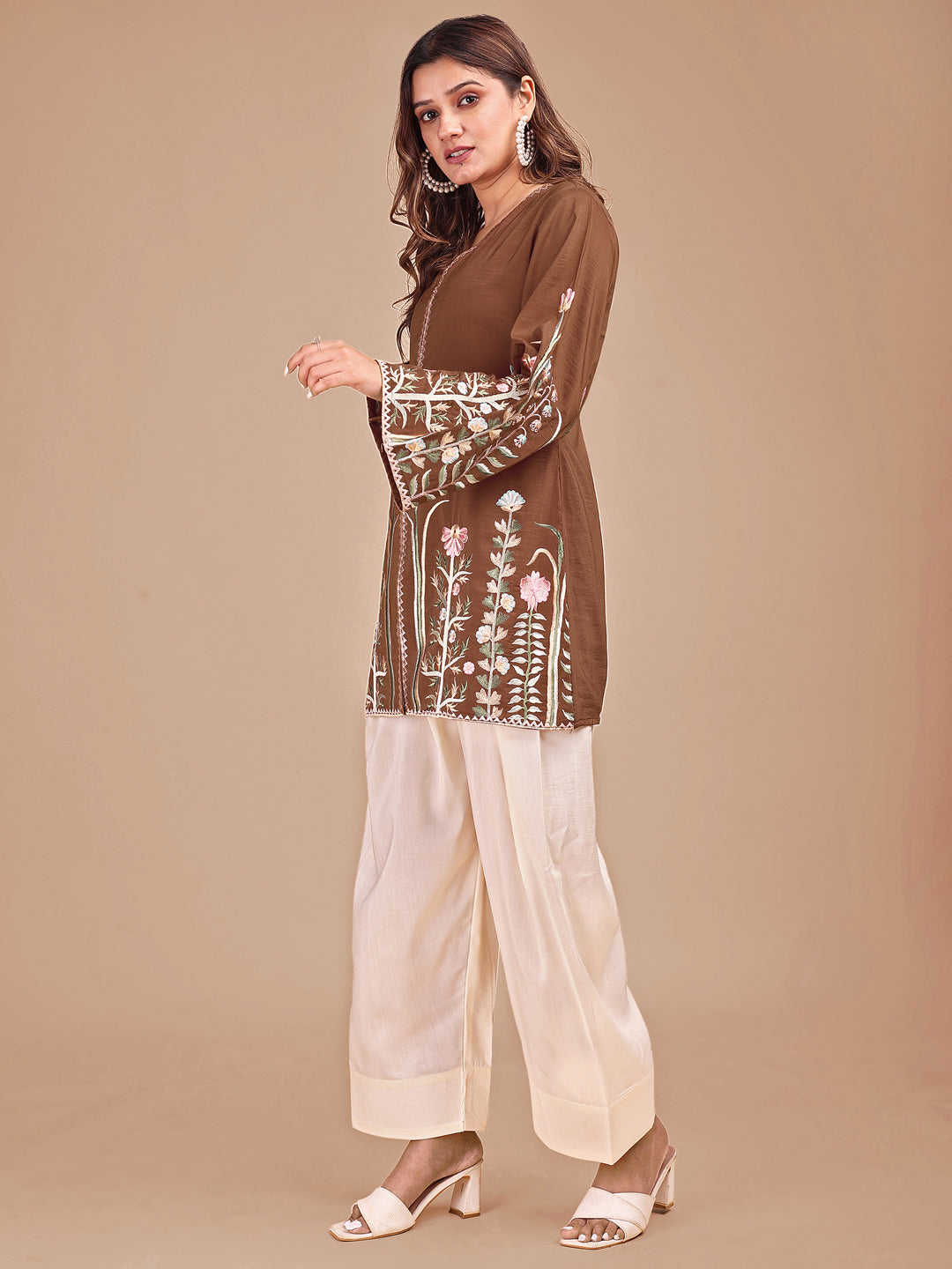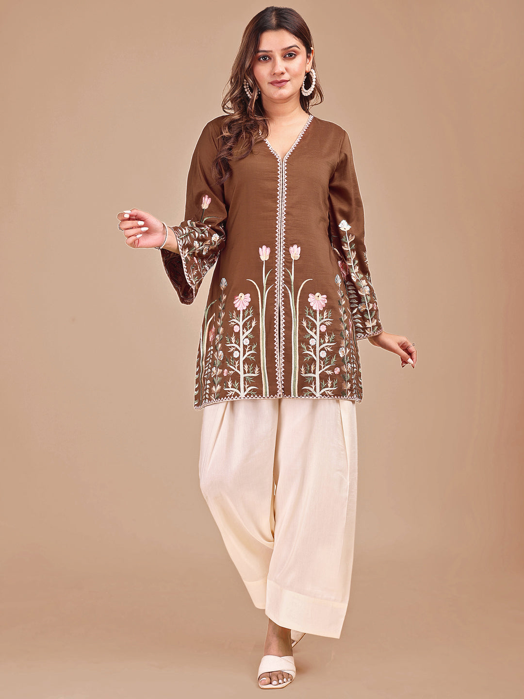 Brown & Cream Colored Embroidered Co-ord Set With Farshi Salwar