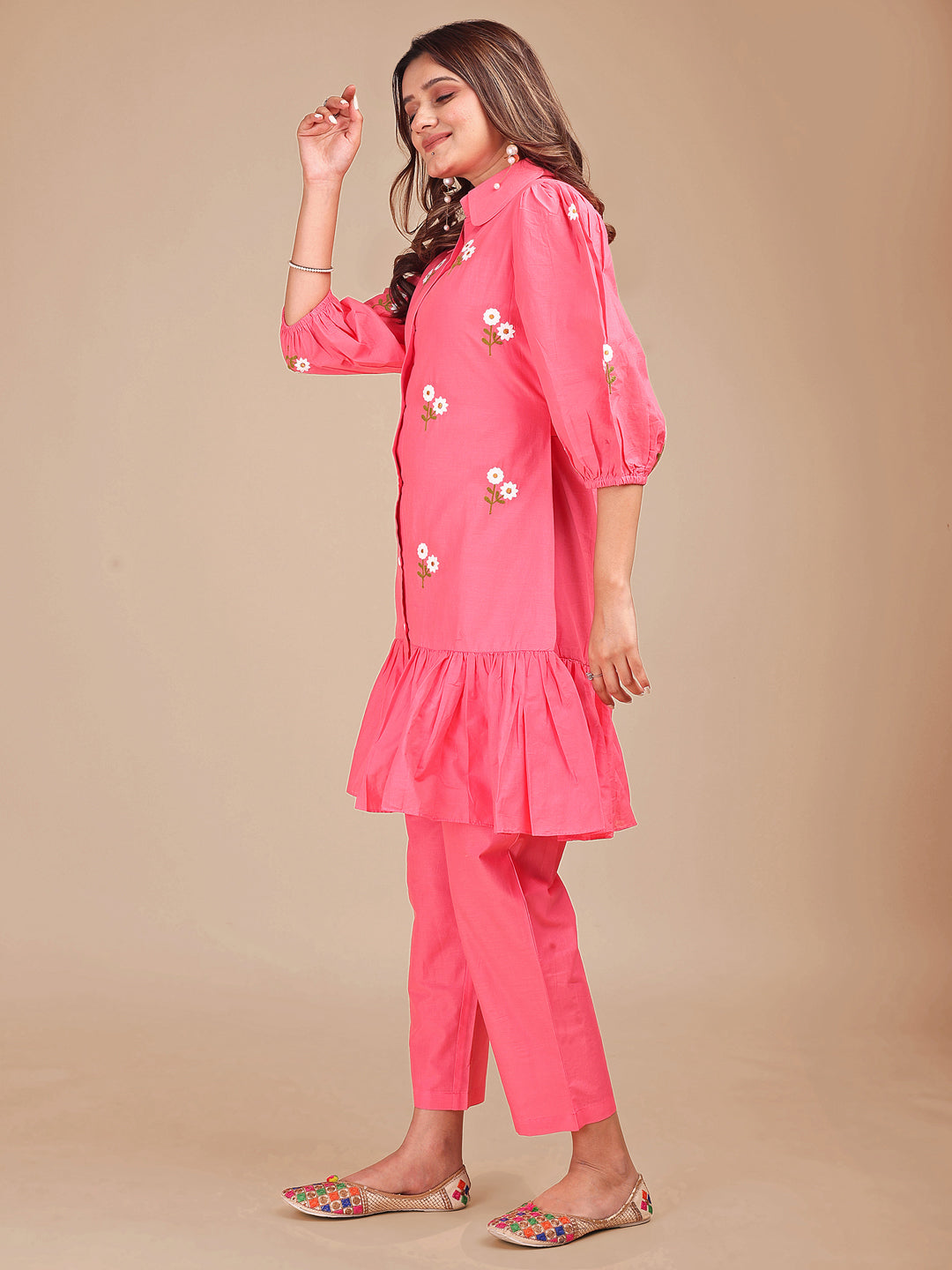 Blush Pink Colored Cotton Frill Co-ord Set With All Over Embroidery