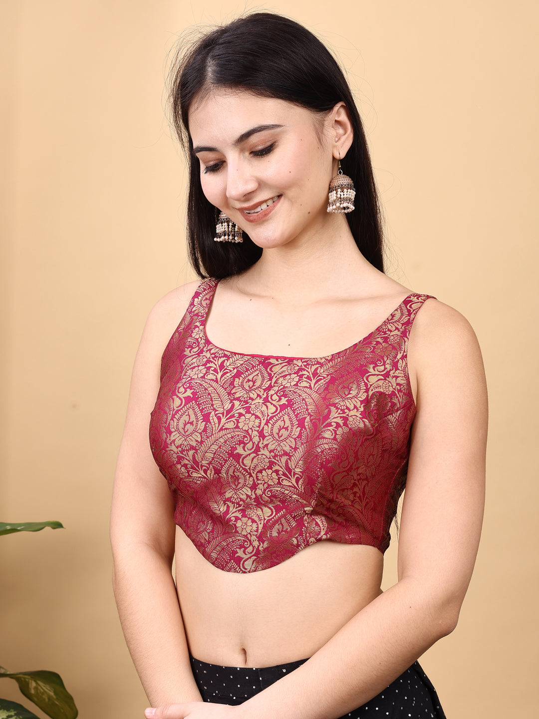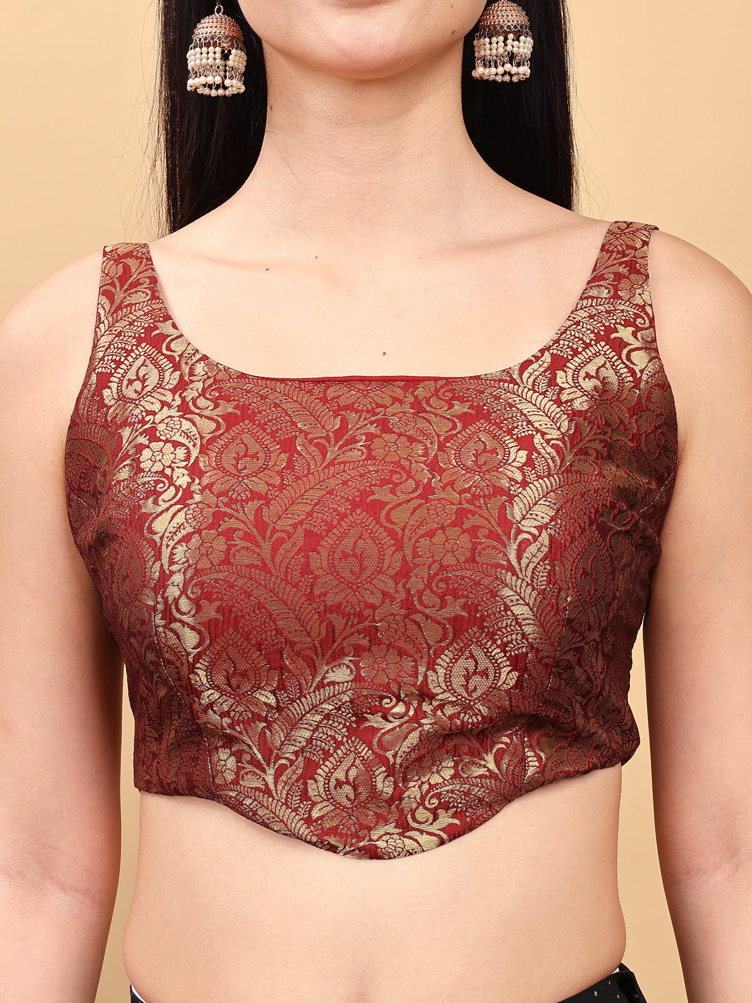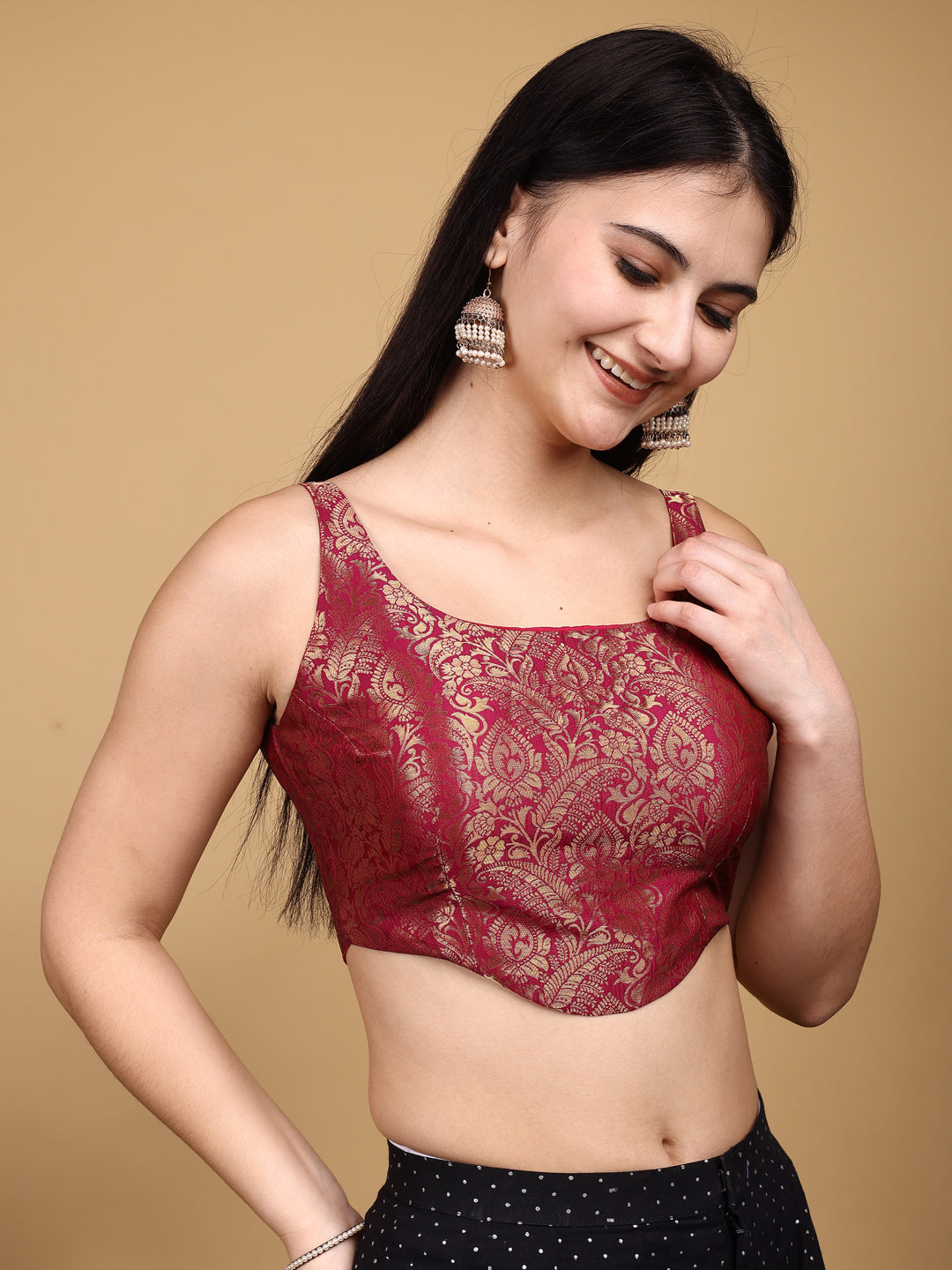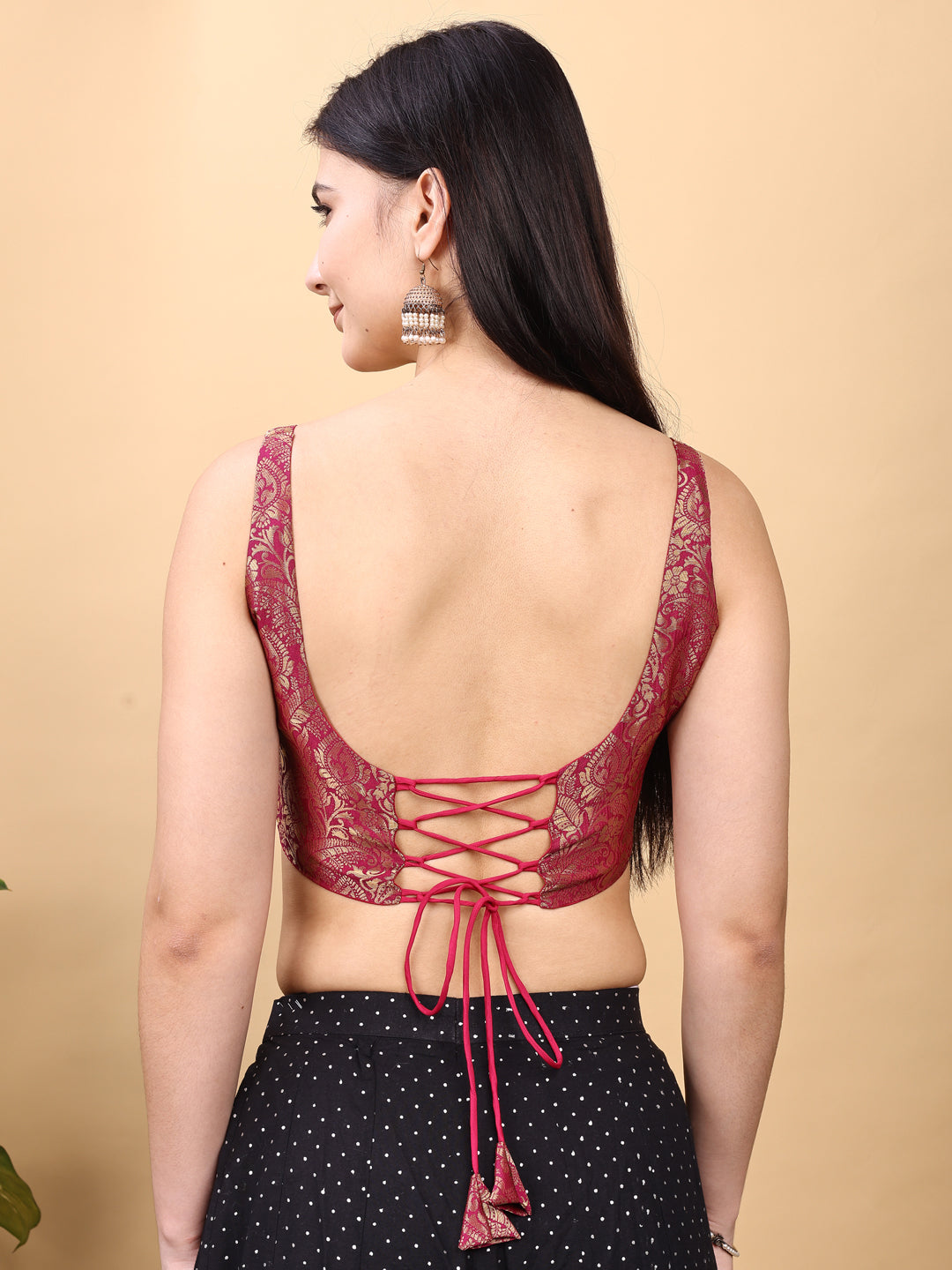 Maroon colored jacquard corset blouse with tie up at back