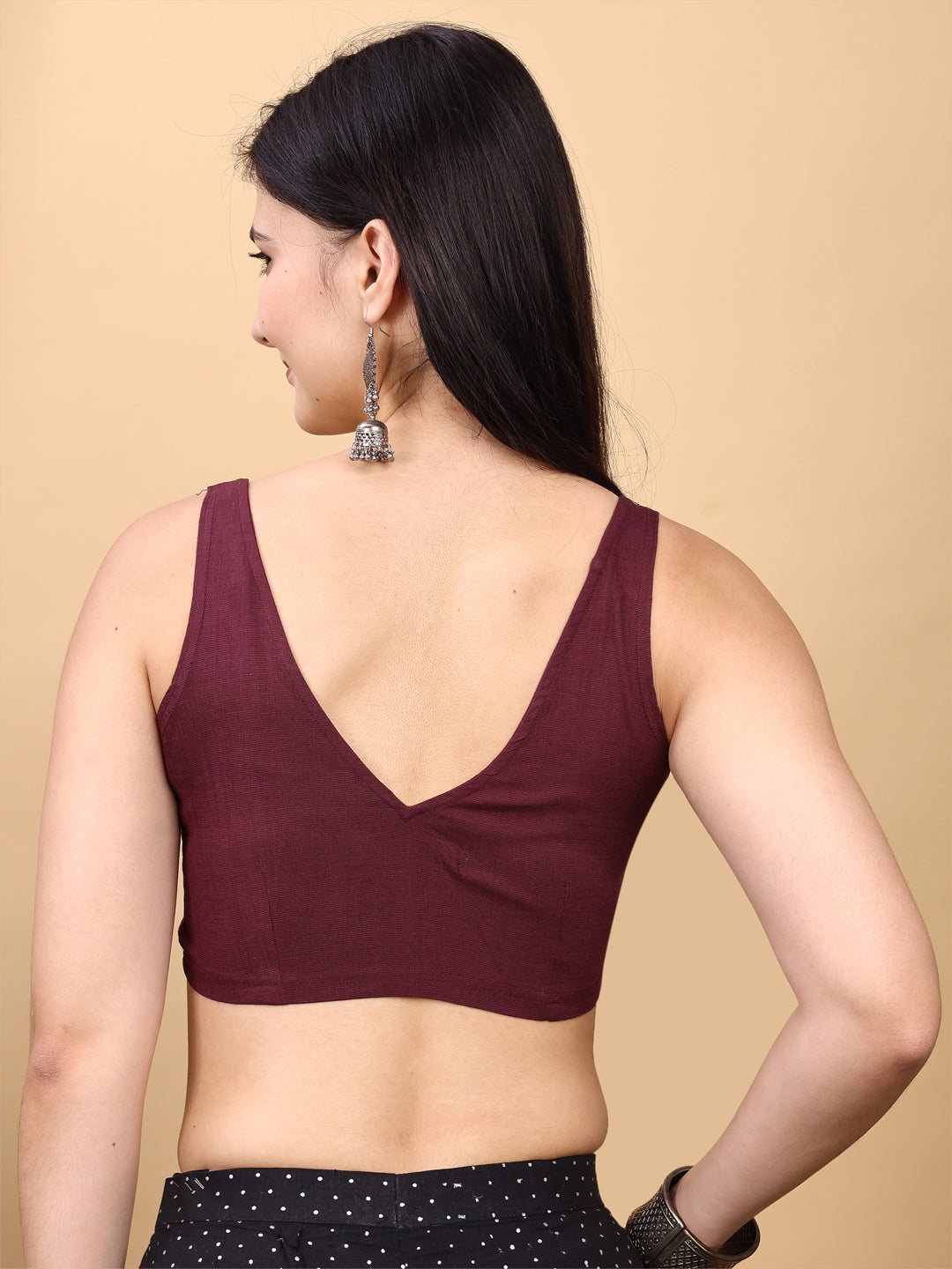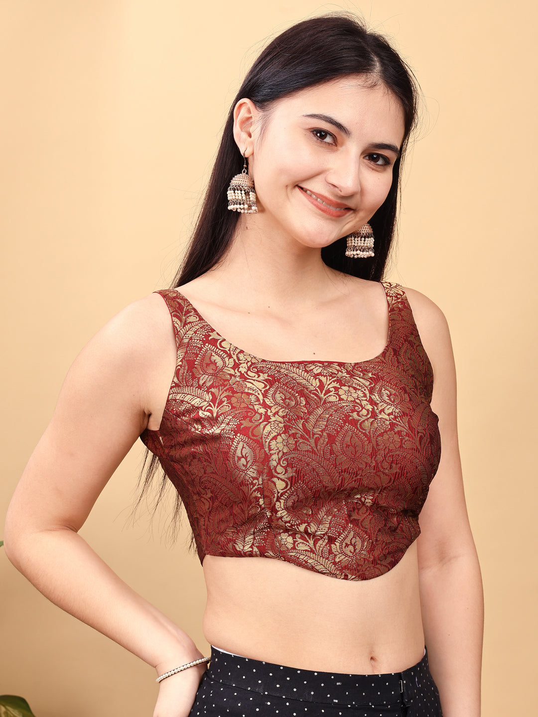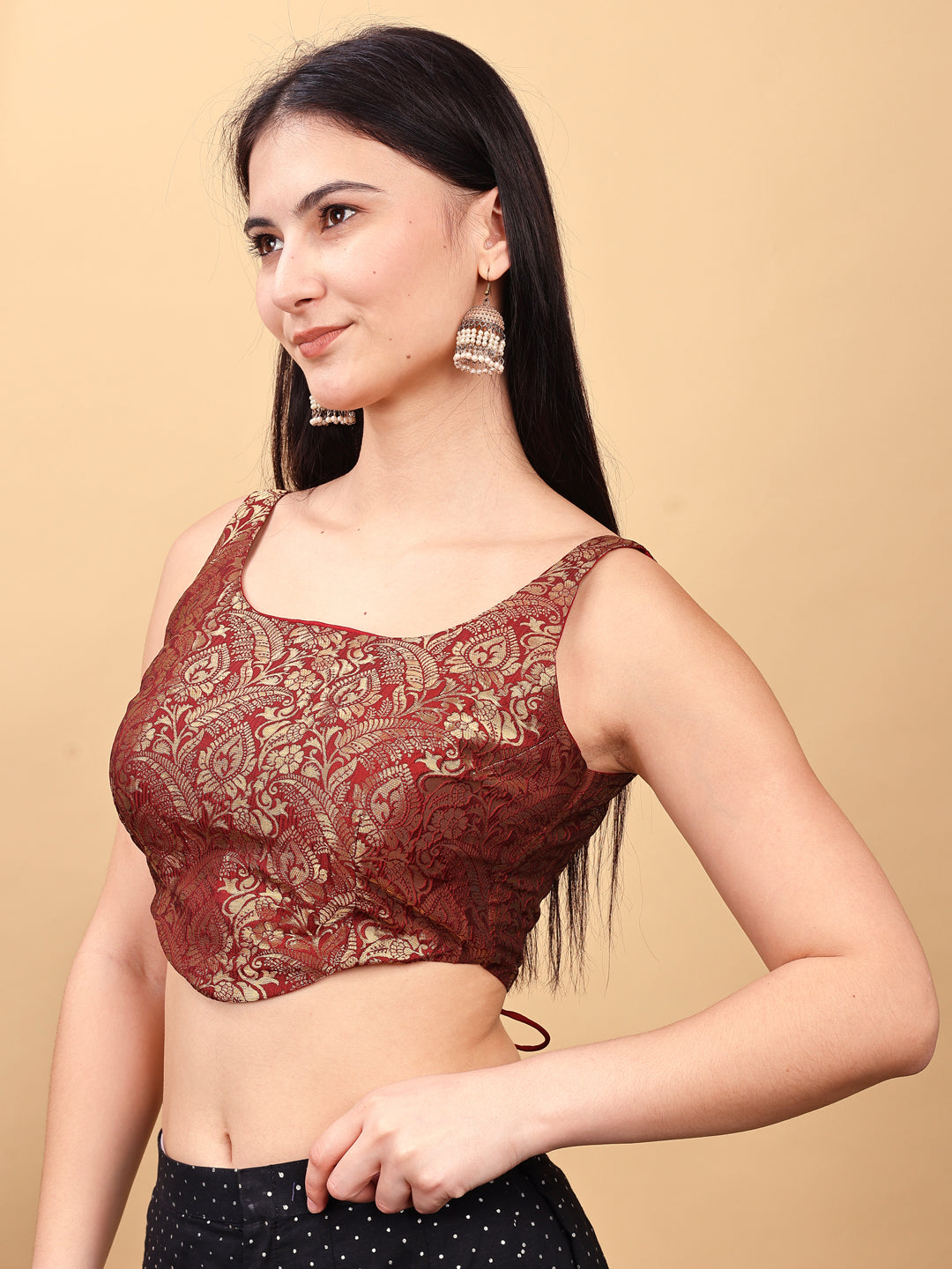 Maroon colored jacquard corset blouse with tie up at back