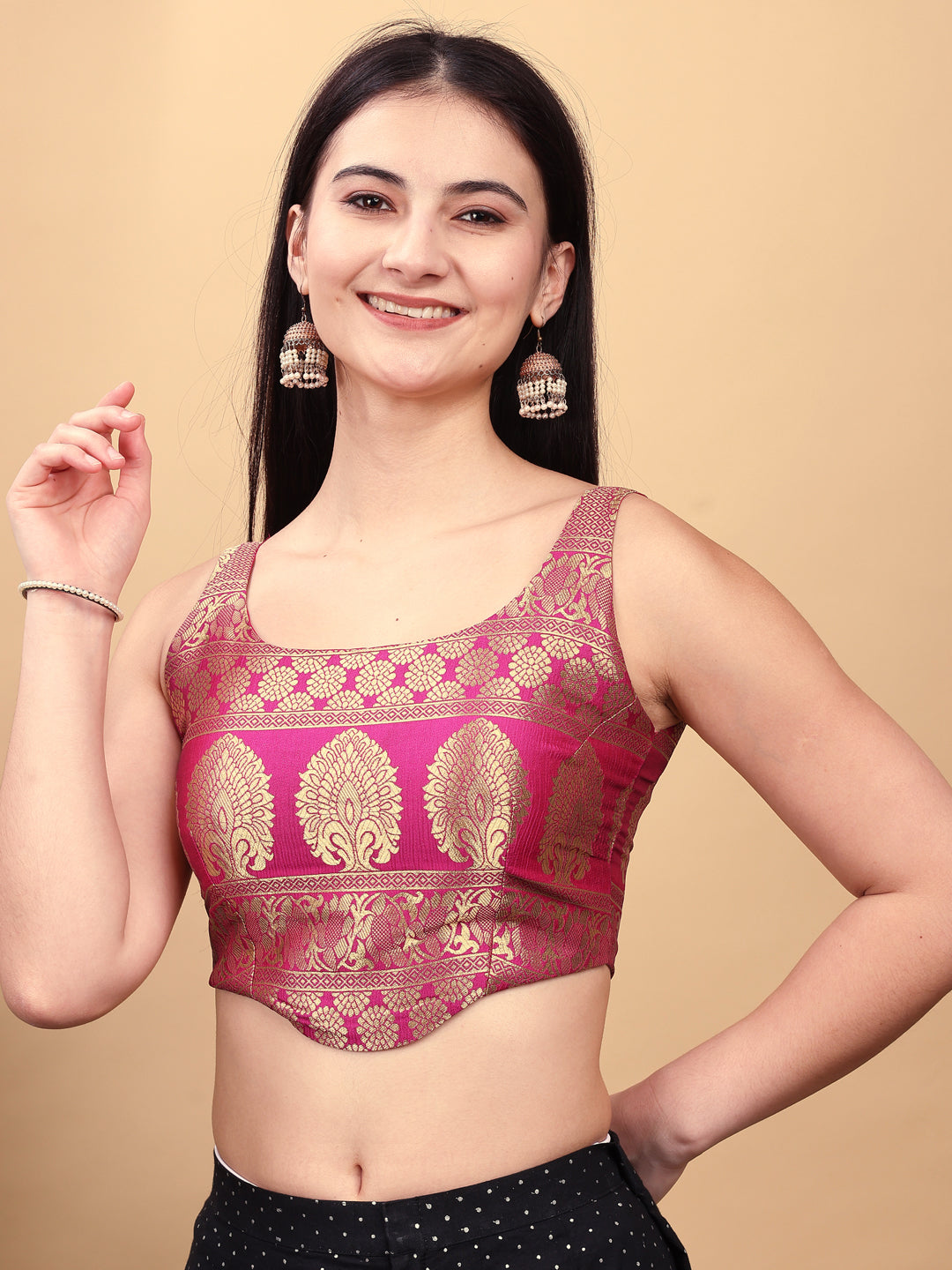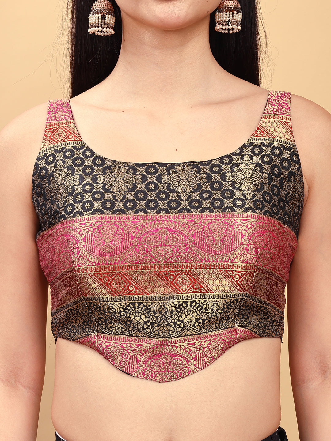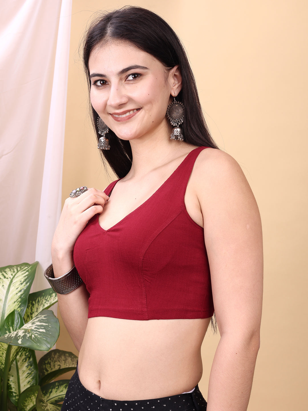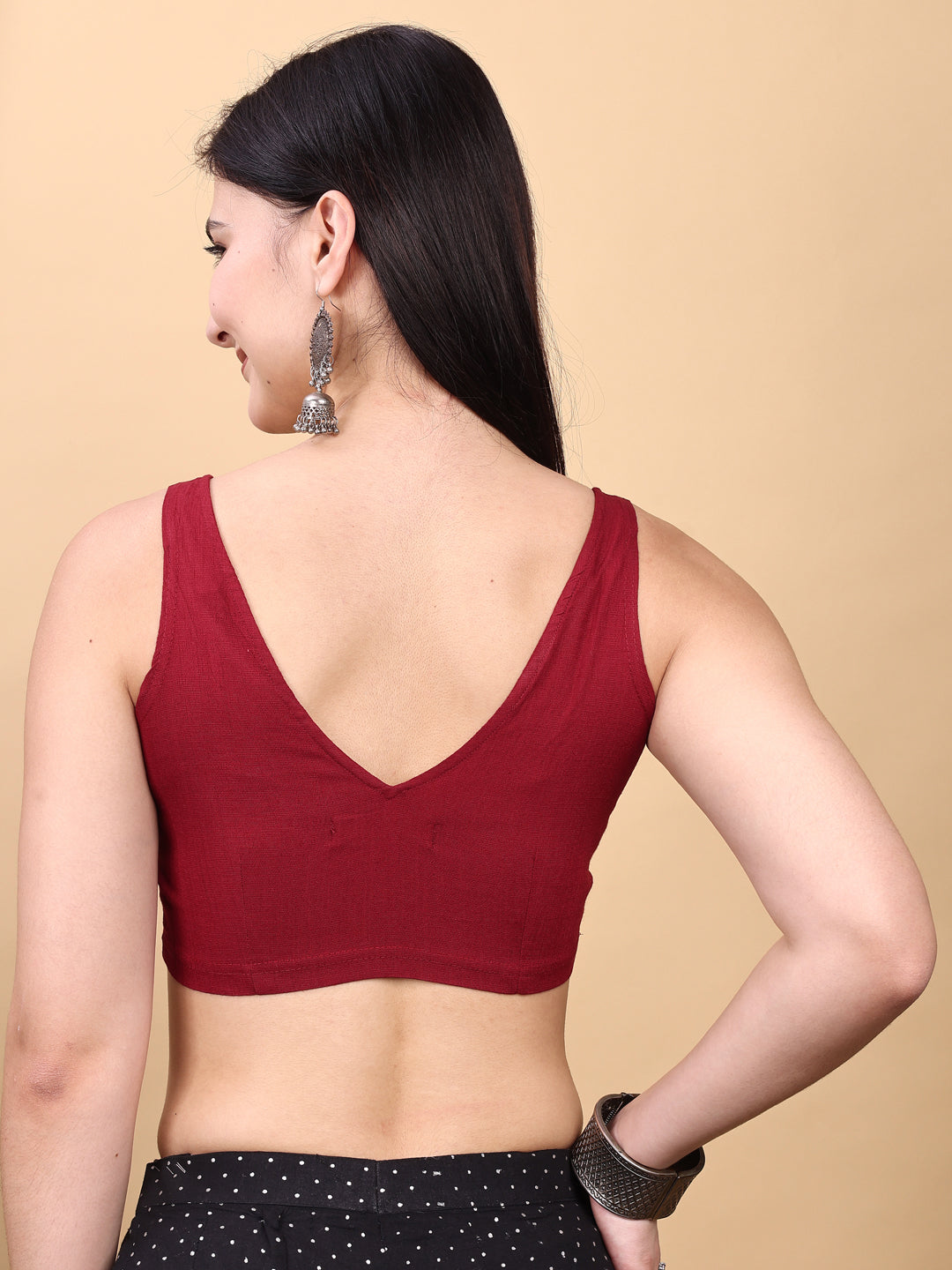 Maroon colored jacquard corset blouse with tie up at back
