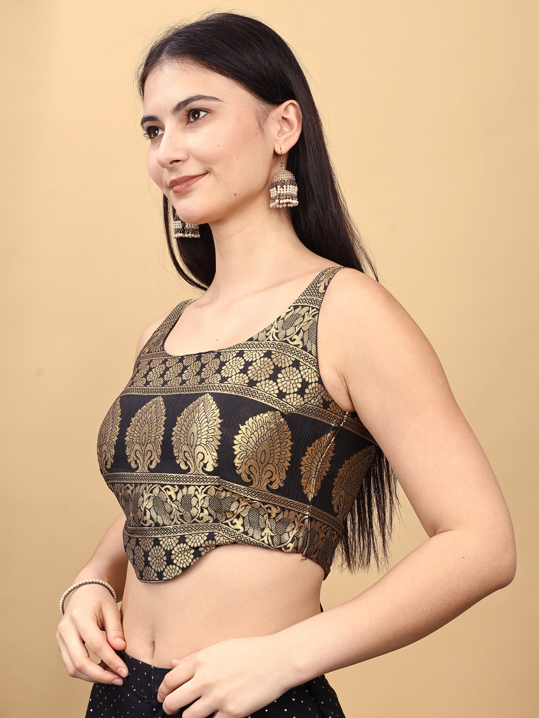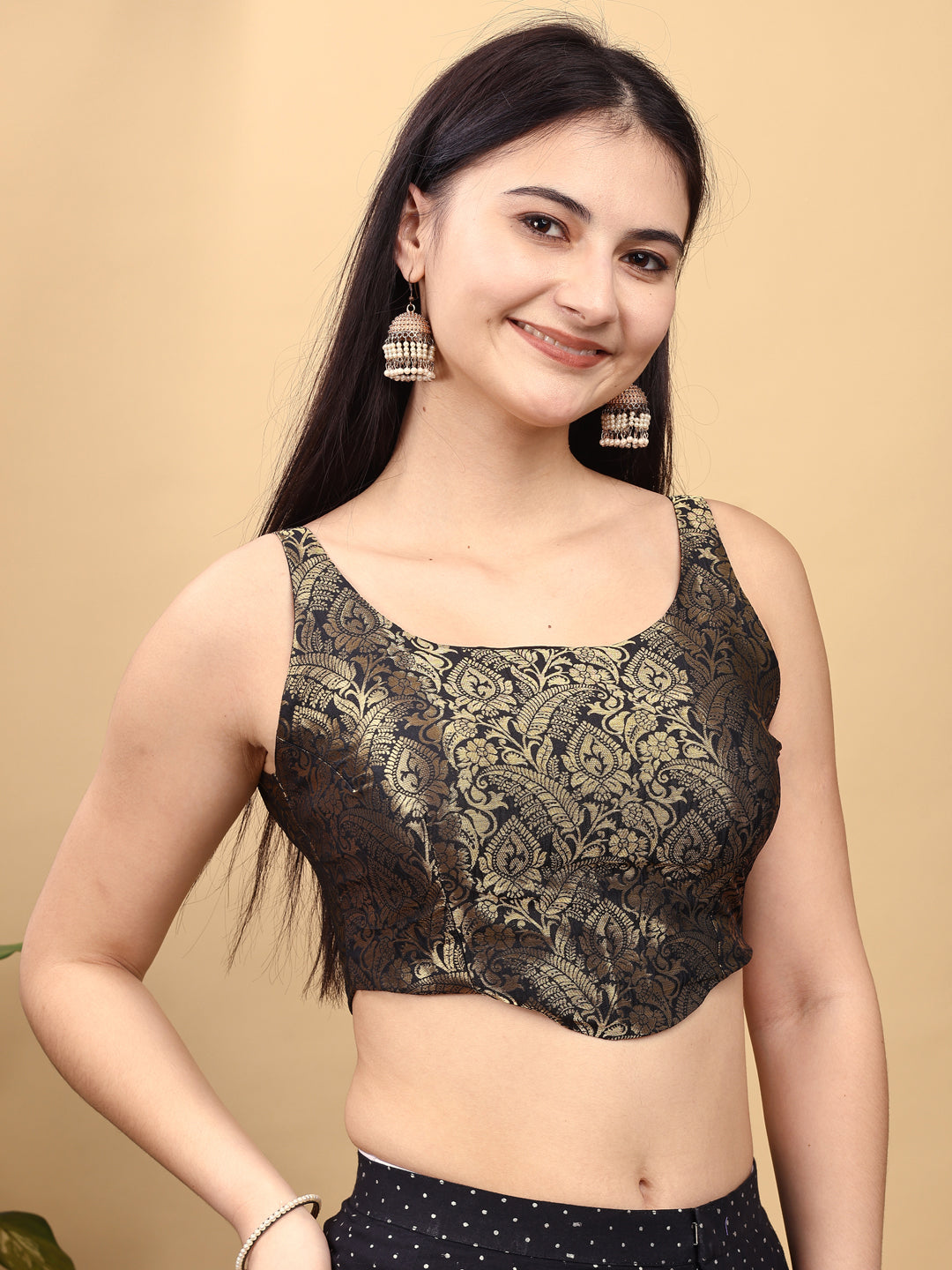 Black colored jacquard corset blouse with tie up at back