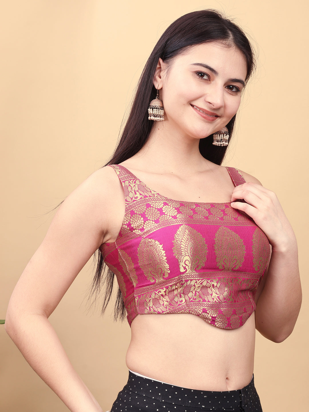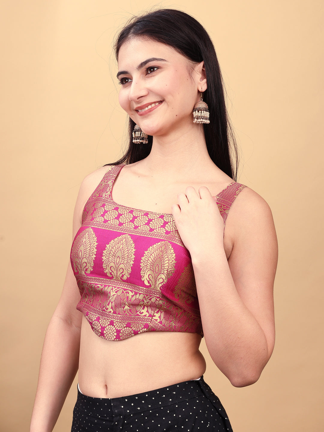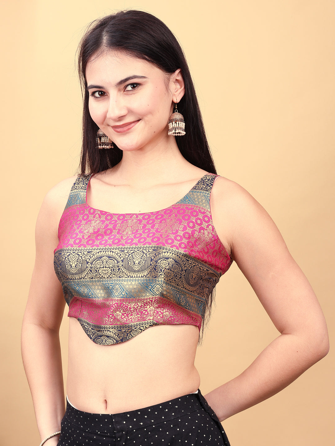 Pink colored jacquard corset blouse with tie up at back