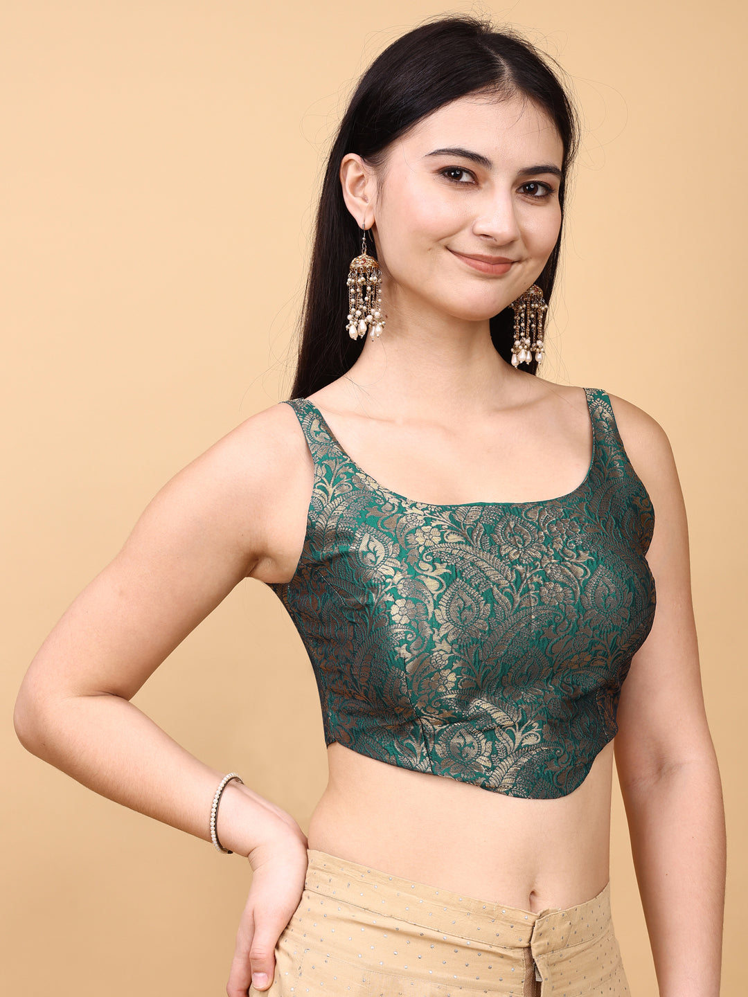 Teal colored jacquard corset blouse with tie up at back