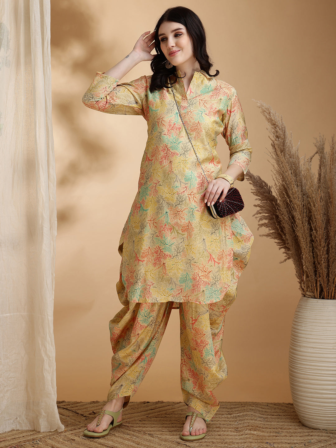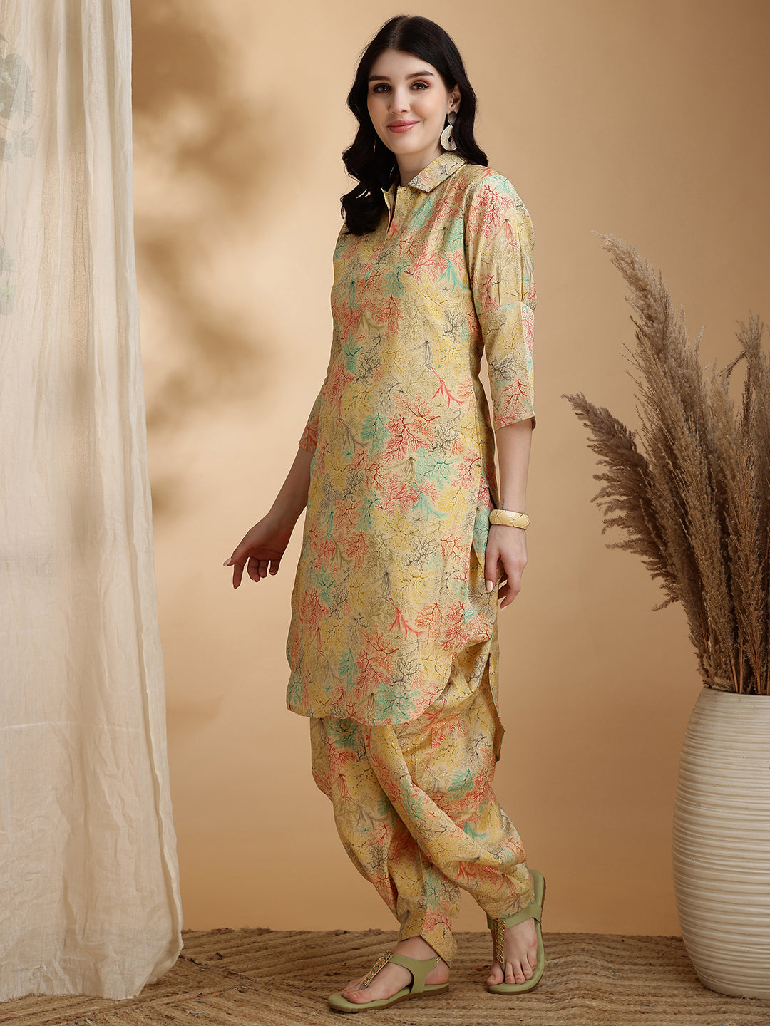Printed Silk Blend Apple Cut Shirt Collar Kurta With Dhot Pant Set