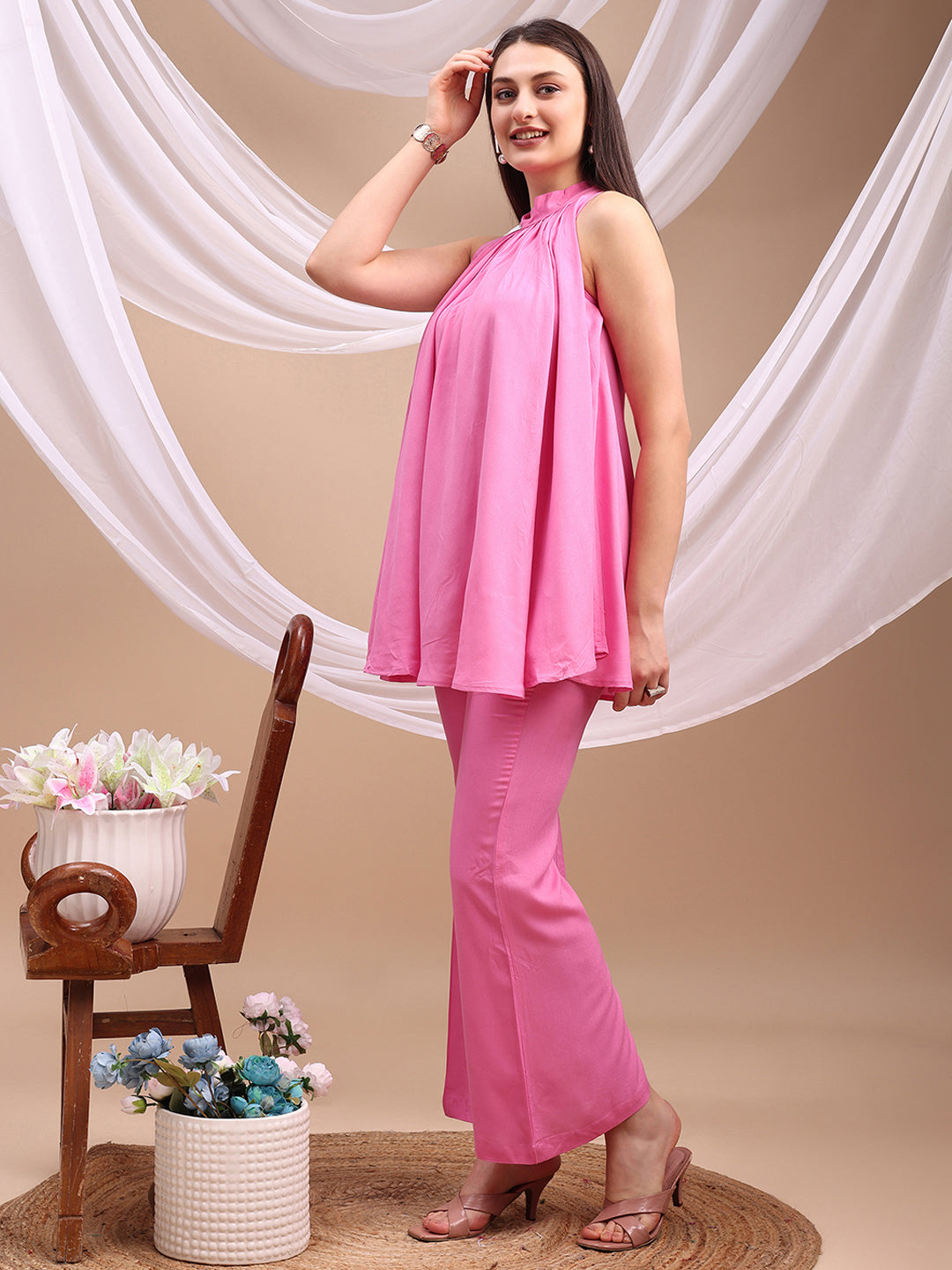 Pink Colored Halter Neck Rayon Sleeveless Top With Bell Bottom Pant Co-ords Set