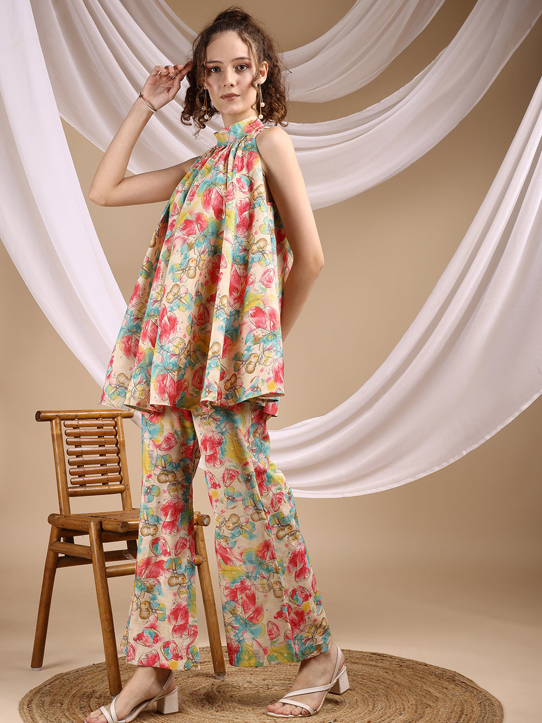 Multi Colored Halter Neck Rayon Sleeveless Top With Flared Palazzo Co-ords Set