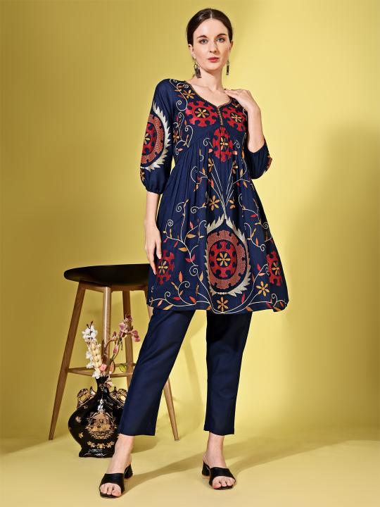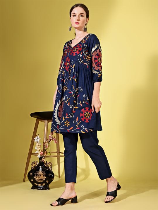 Navy Blue color cotton dobby with contrast embroidered tunic & trouser Co-ord set