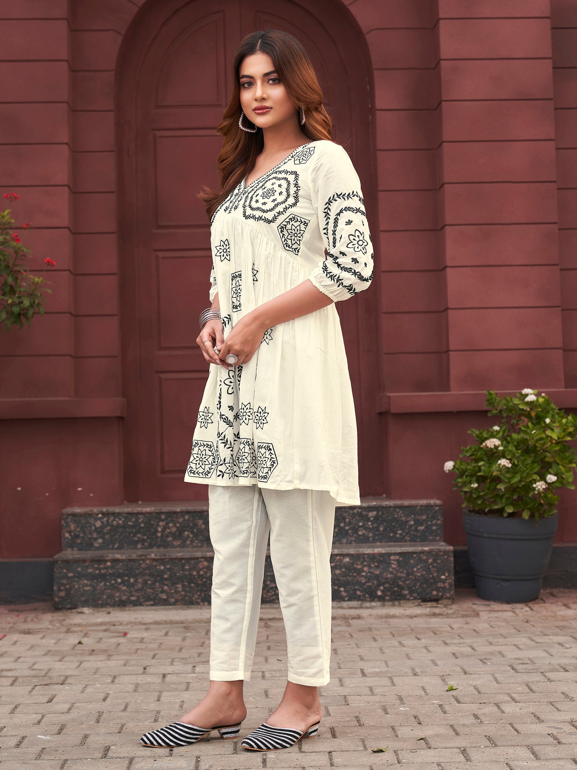 Off White color cotton with black thread embroidered tunic & trouser co-ord set