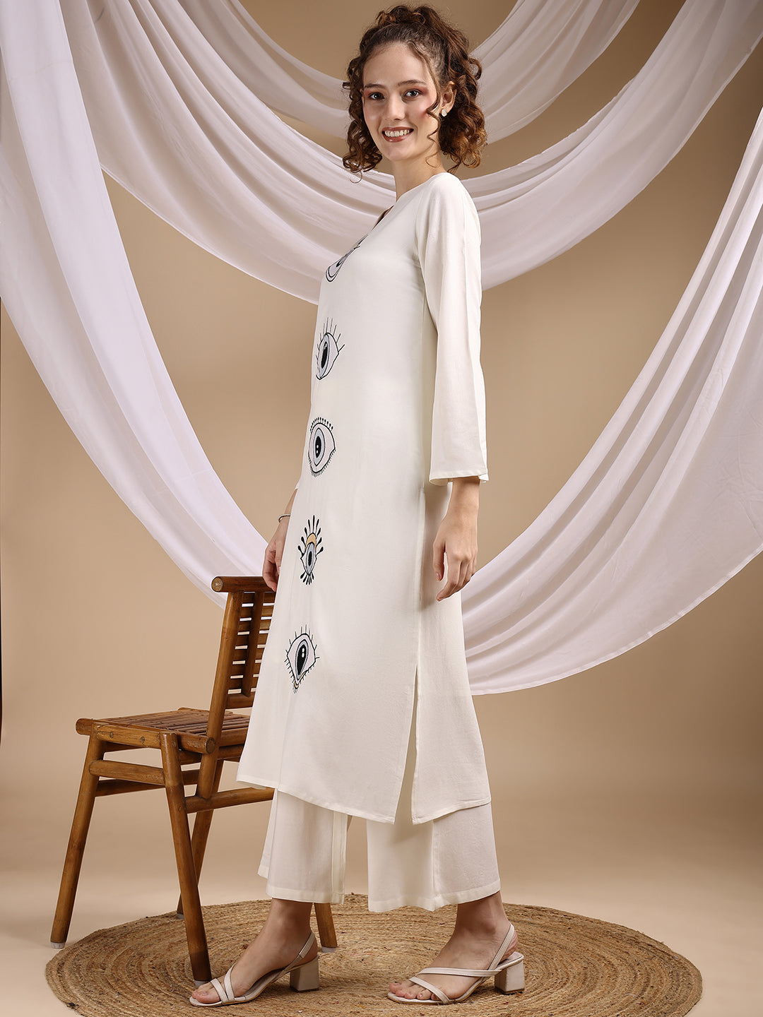 Off White Evil Eye Embroidered Rayon Co-ord Set