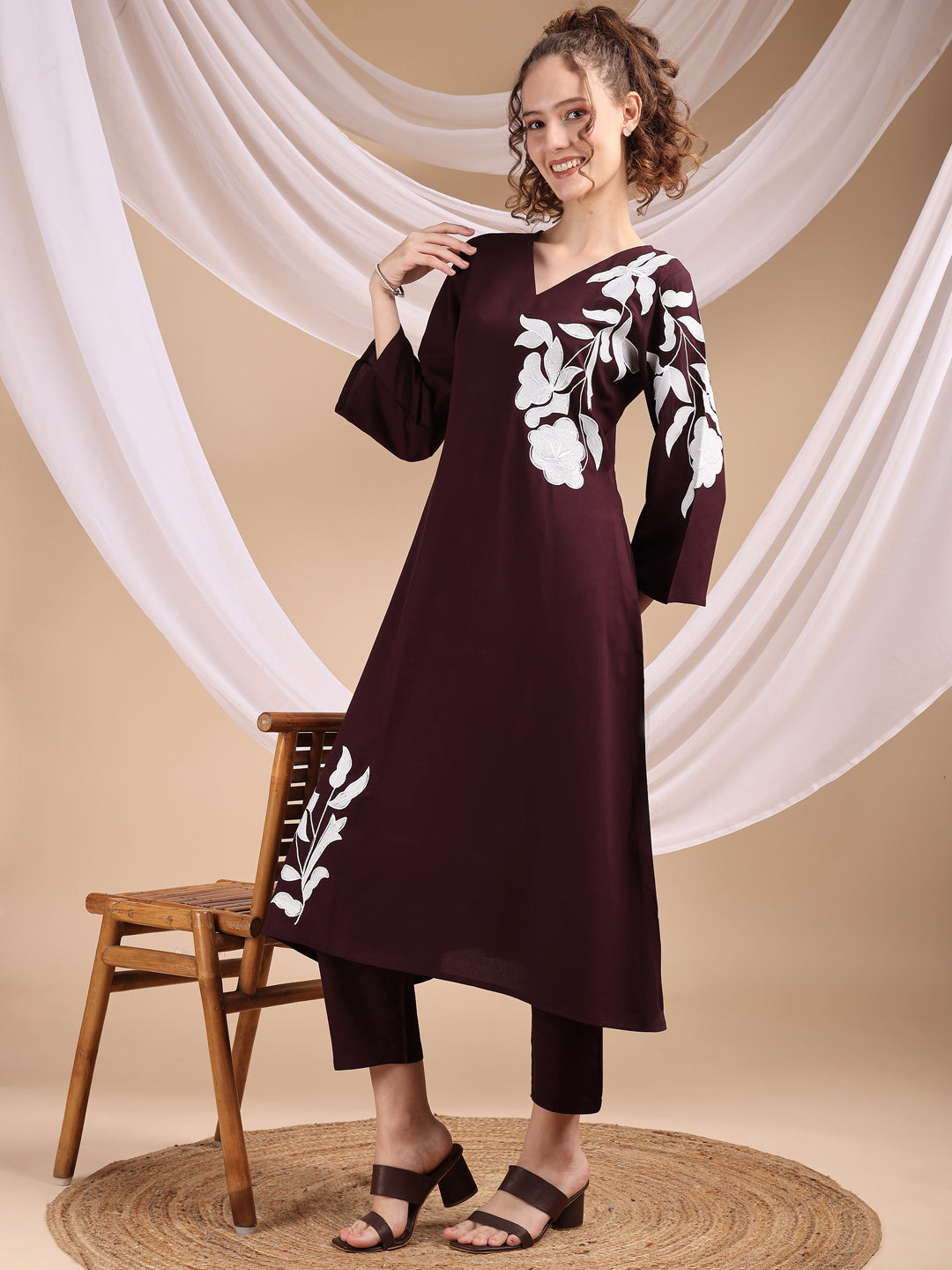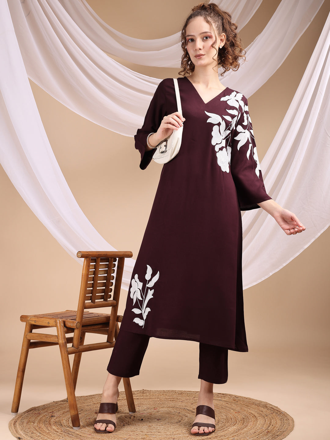 Plum Colored Placement Embroidered Rayon A-Line Kurta With Trousers Co-ords Set