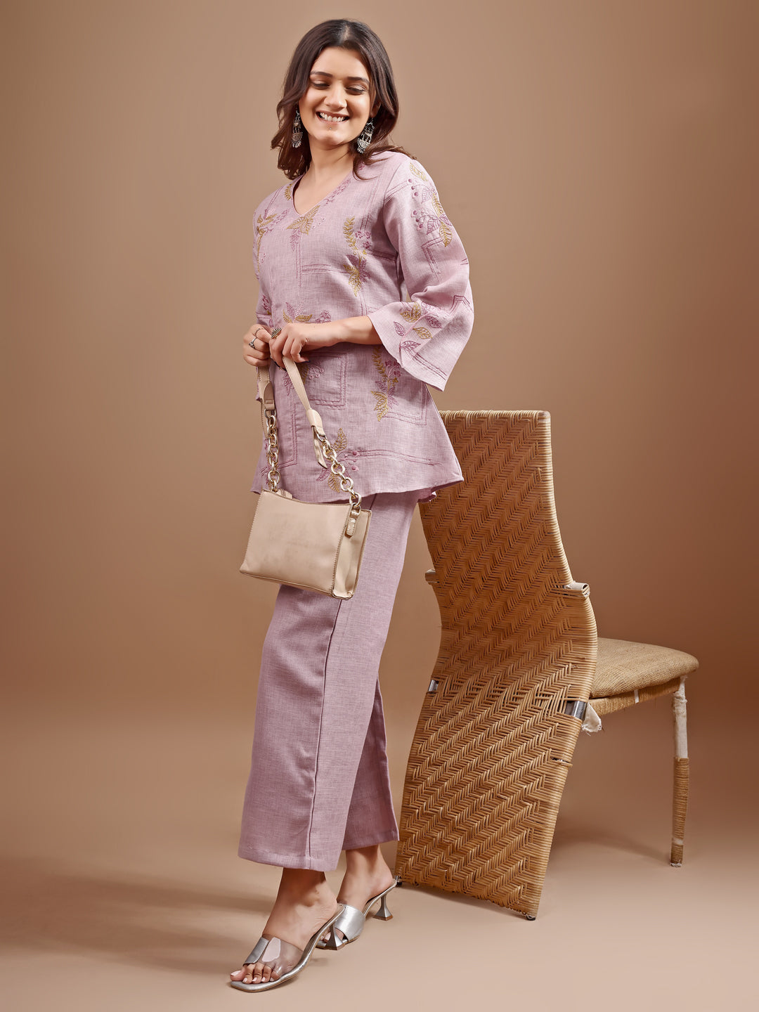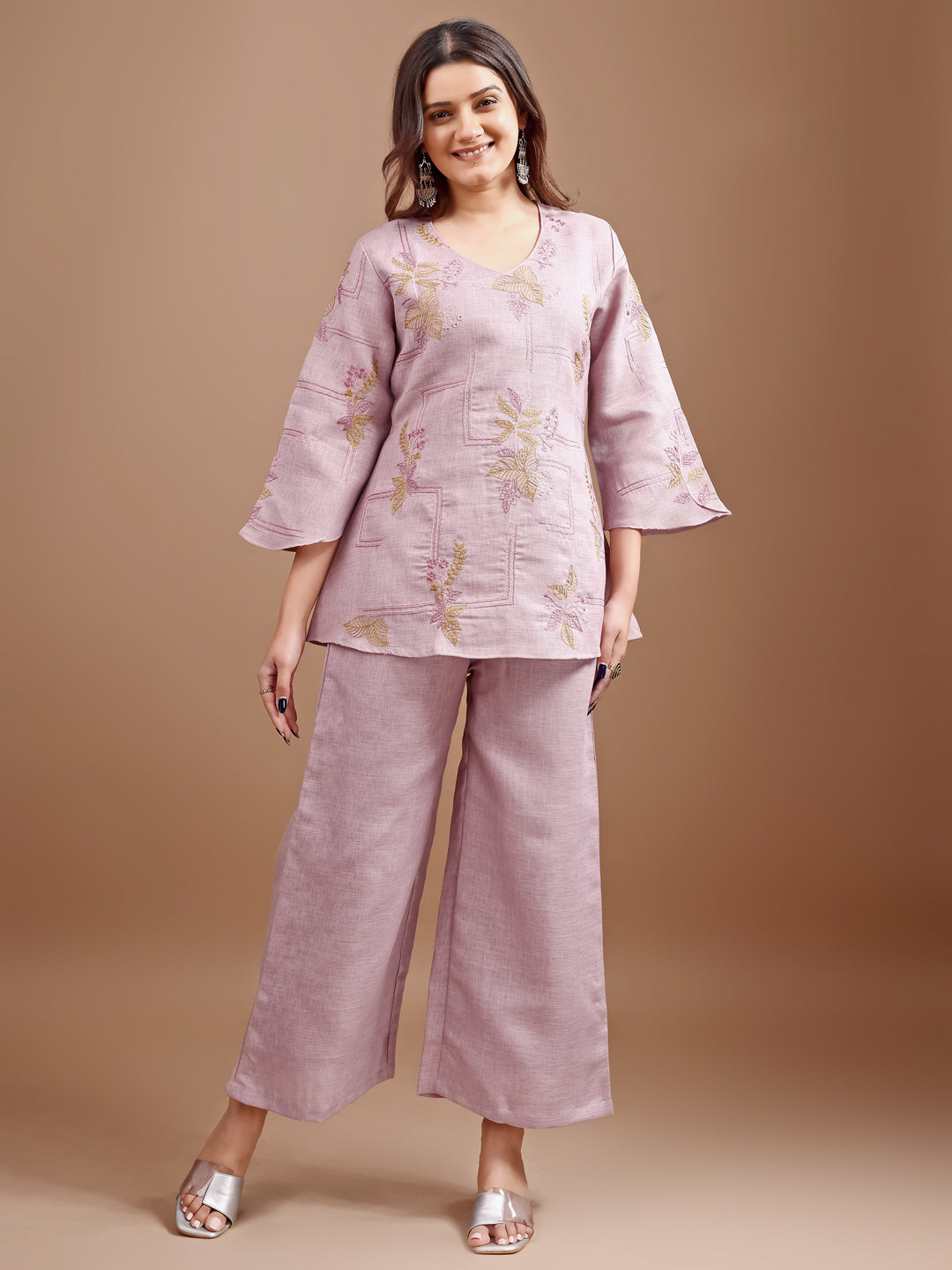 Mauve colour linen contrast thread embroidery top with palazo set