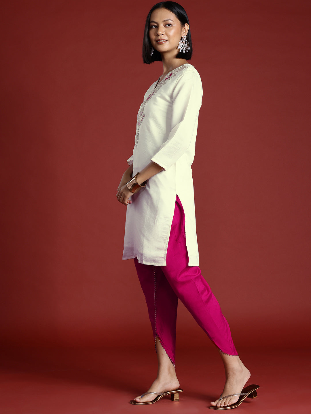 Off White & Magenta Silk Blend Contrast Embroidered Tunic With Dhoti Co-ord Set